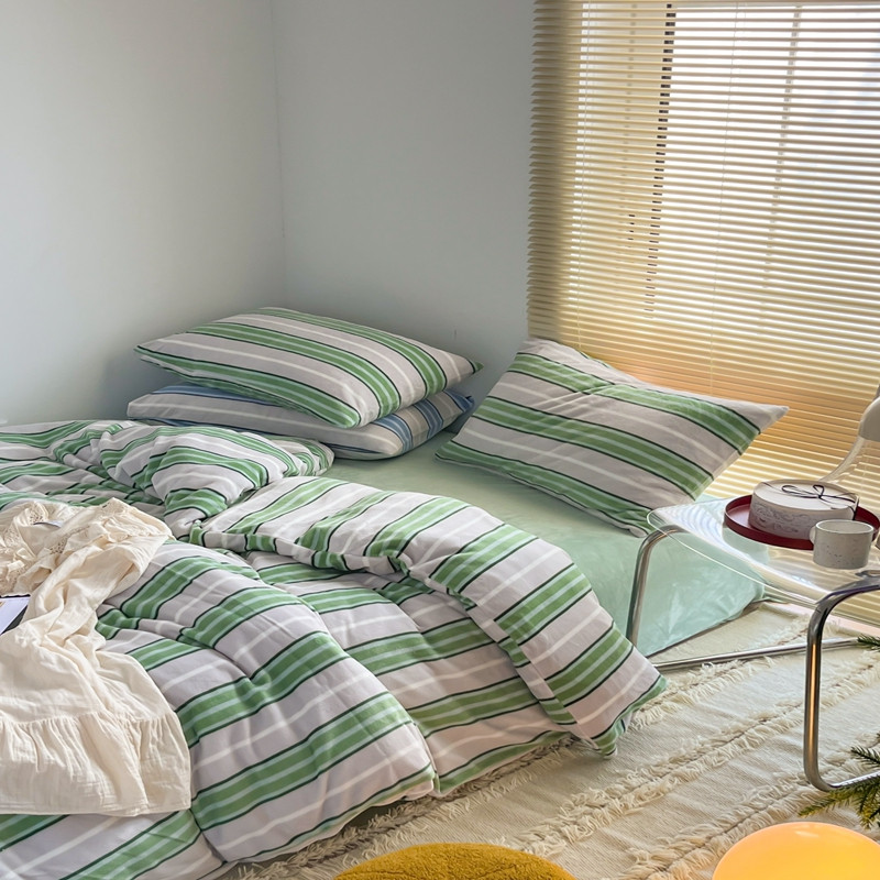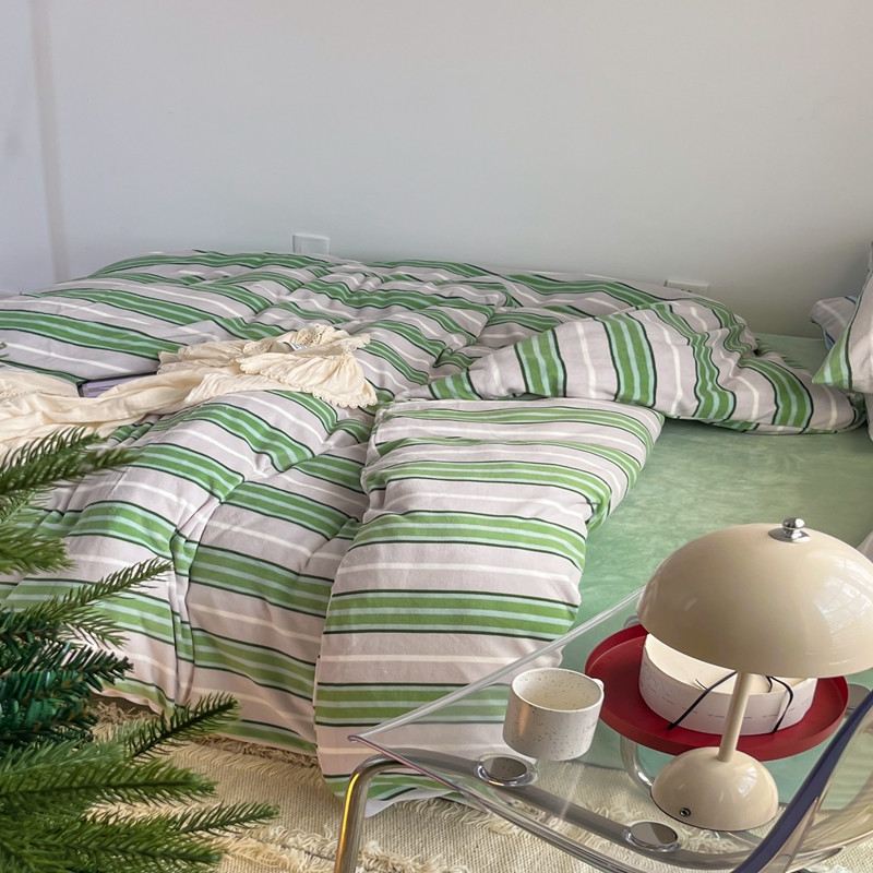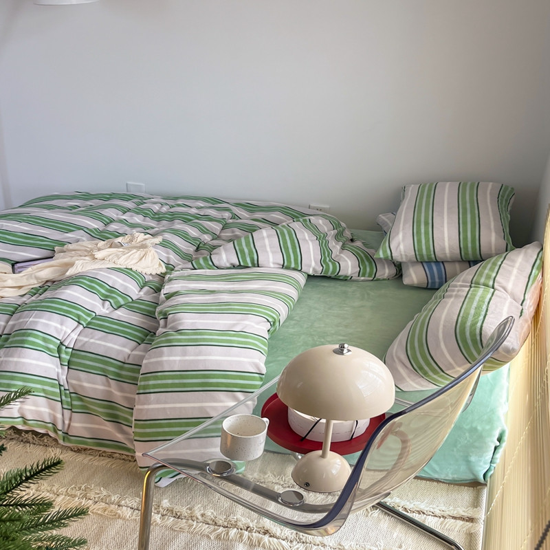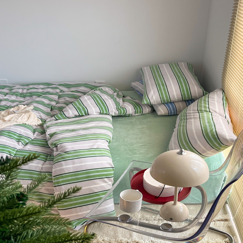 昔可 2022新款简约条纹系列牛奶绒四件套 绿竖条