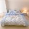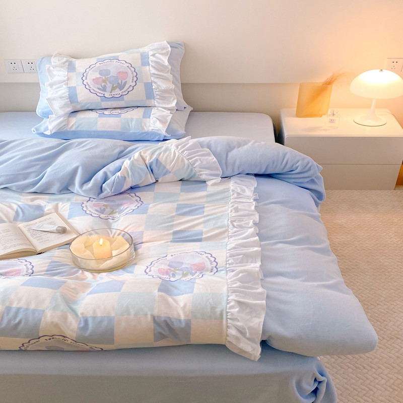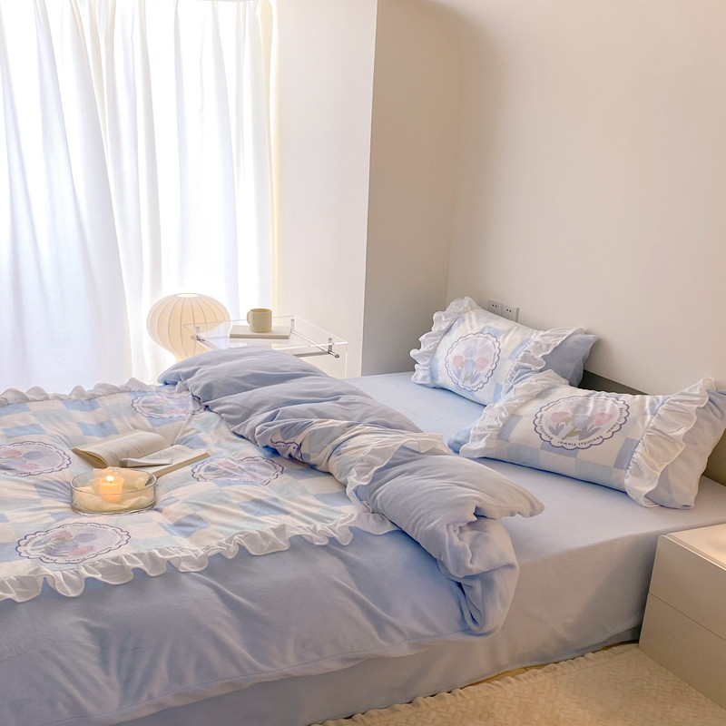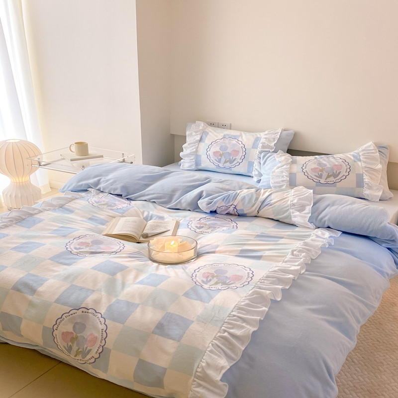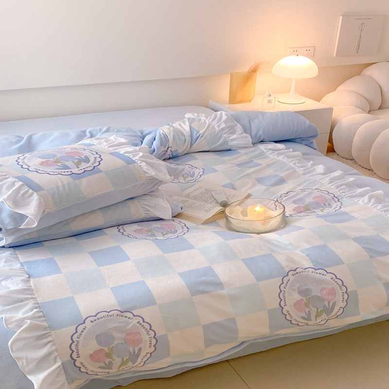 昔可 2022新款数码印花花边款牛奶绒四件套 蓝棋盘郁金