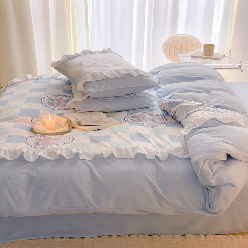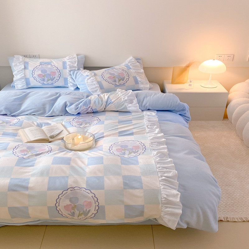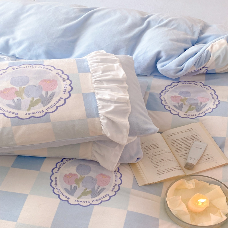 商品名称:昔可 2022新款数码印花花边款牛奶绒四件套 蓝棋盘郁金