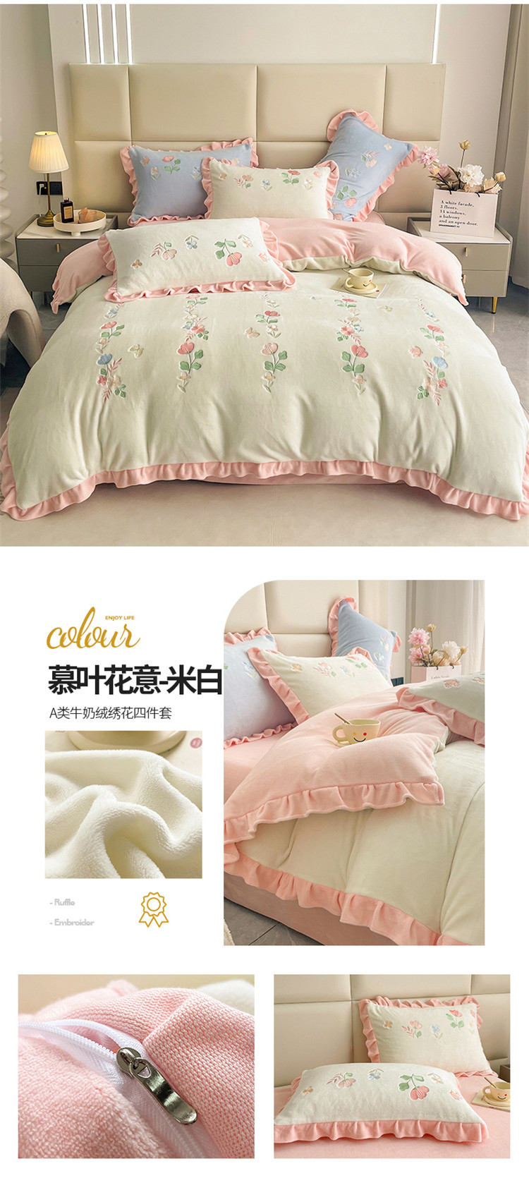 (总)懒猫家纺 2025新款亲肤舒适牛奶绒四件套-可可小姐系列,可可小姐-瓷白,可可小姐-水粉