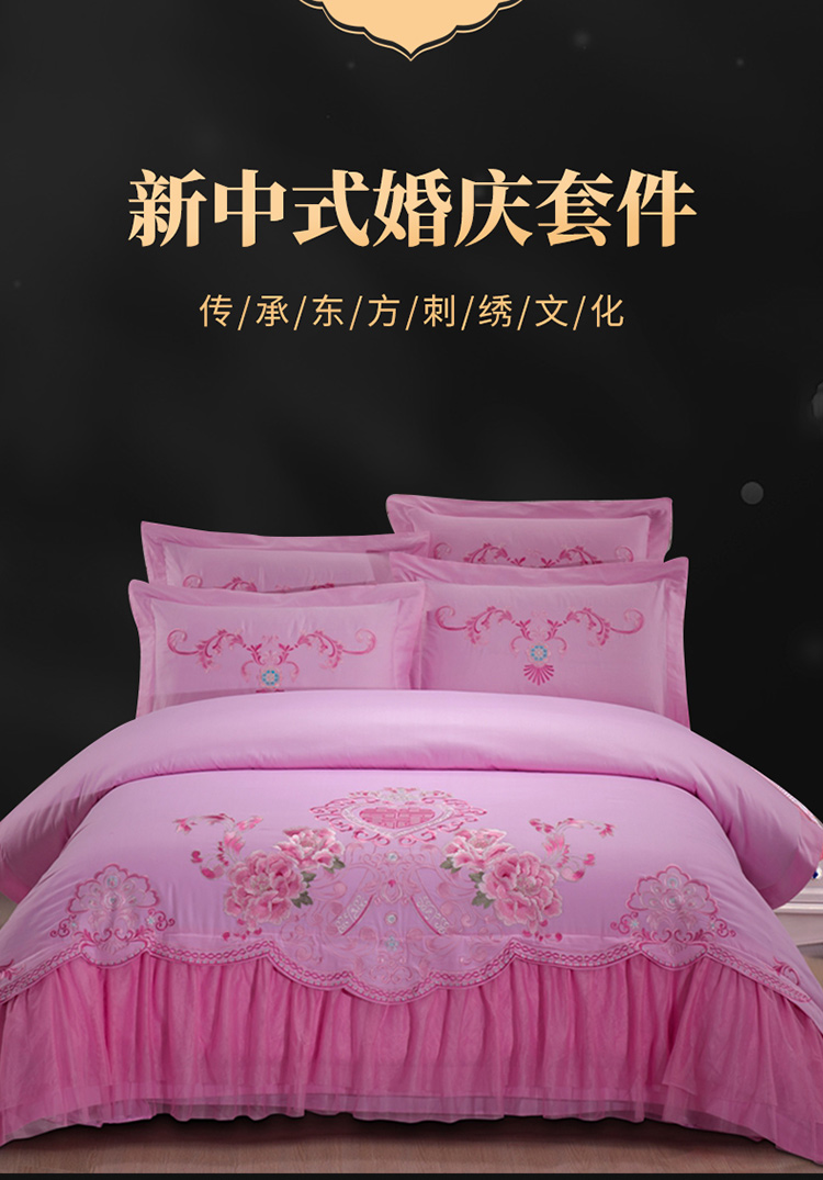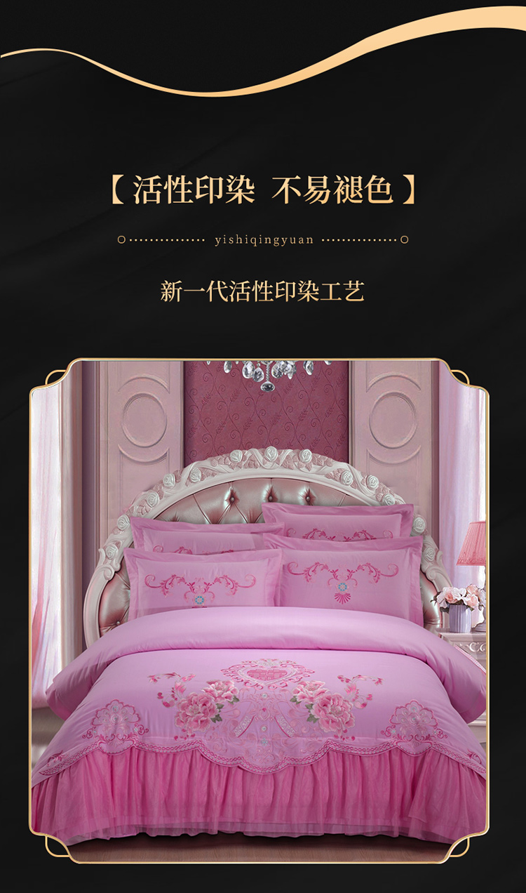商品名称:慕她婚庆四件套大红色大花结婚全棉纯棉刺绣花多件套直播 花蔓喜多粉色