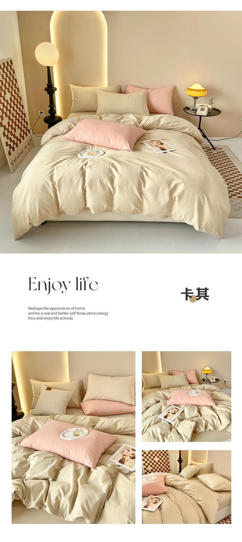 商品名称:三沁 2023新款直播爆款A类全棉纯棉水洗棉简约无印风纯色四件套 卡其
