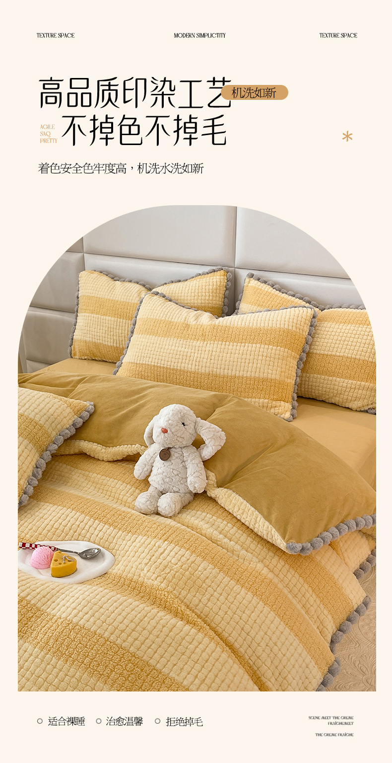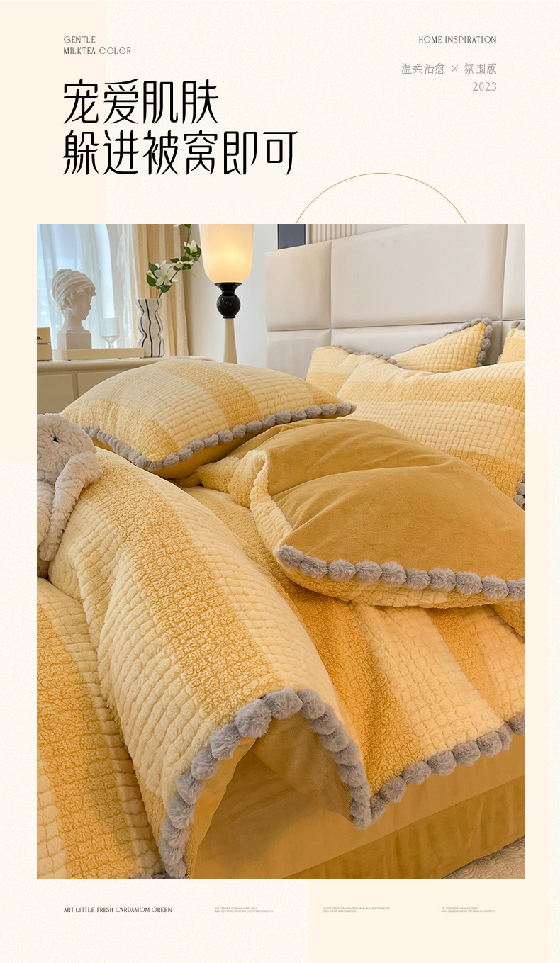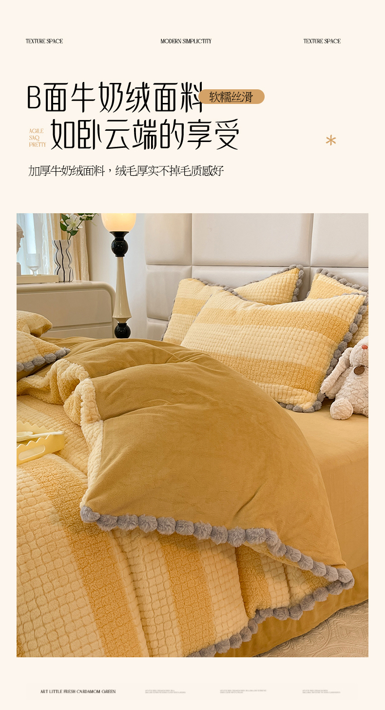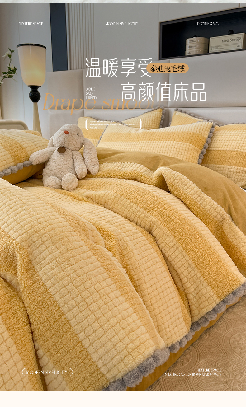 商品名称:暖洋 2024新款A类加厚泰迪绒兔毛绒纯色牛奶绒球球系列保暖四件套 暖黄