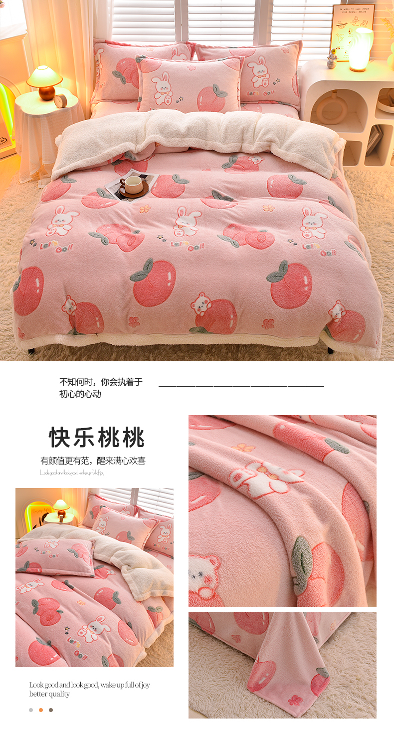 商品名称:同田家纺 2023年新款雪花绒&羊羔绒四件套 快乐桃桃