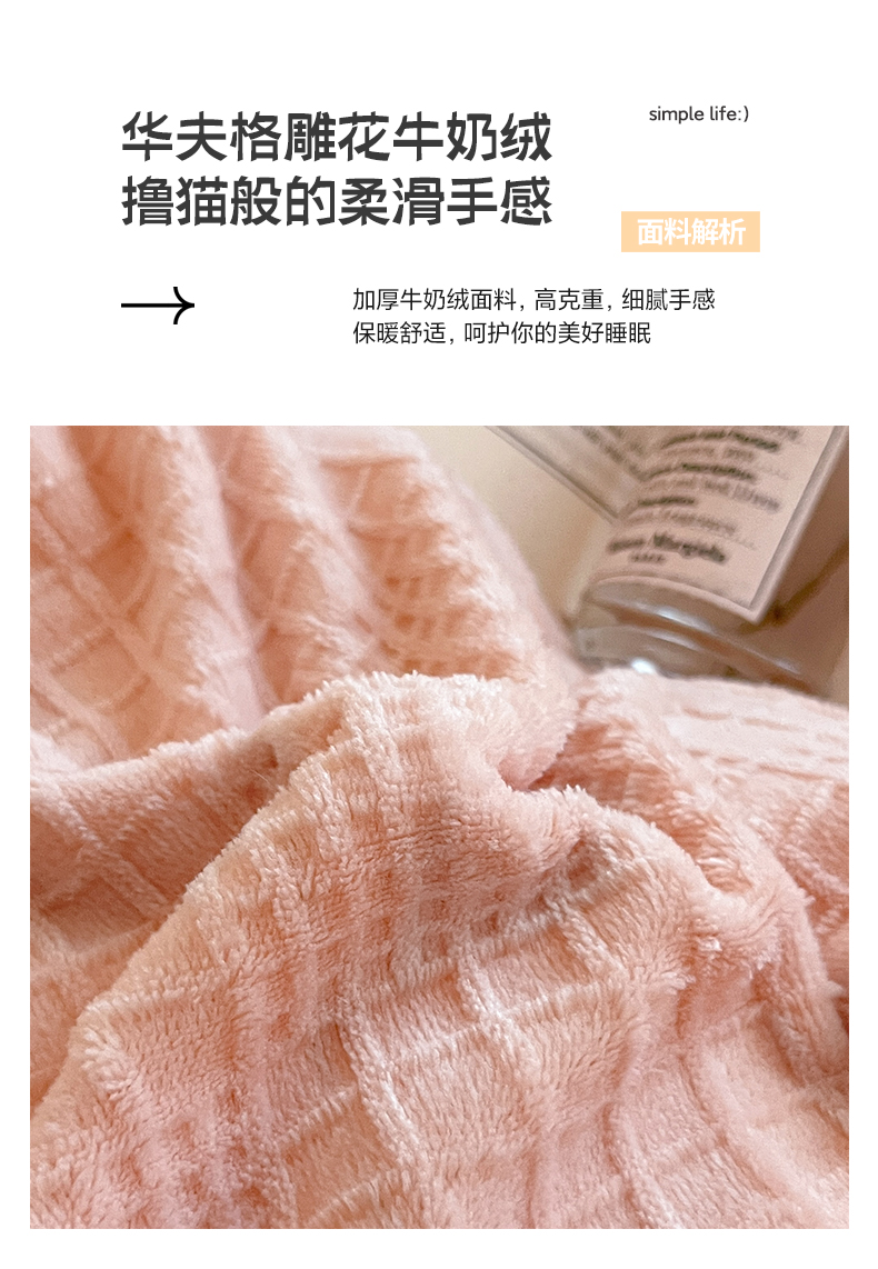 (总)莱茵家居 2025新款高克重牛奶绒烂花四件套,眠语-粉,眠语-蓝,暖格-粉,暖格-咖,暖格-蓝