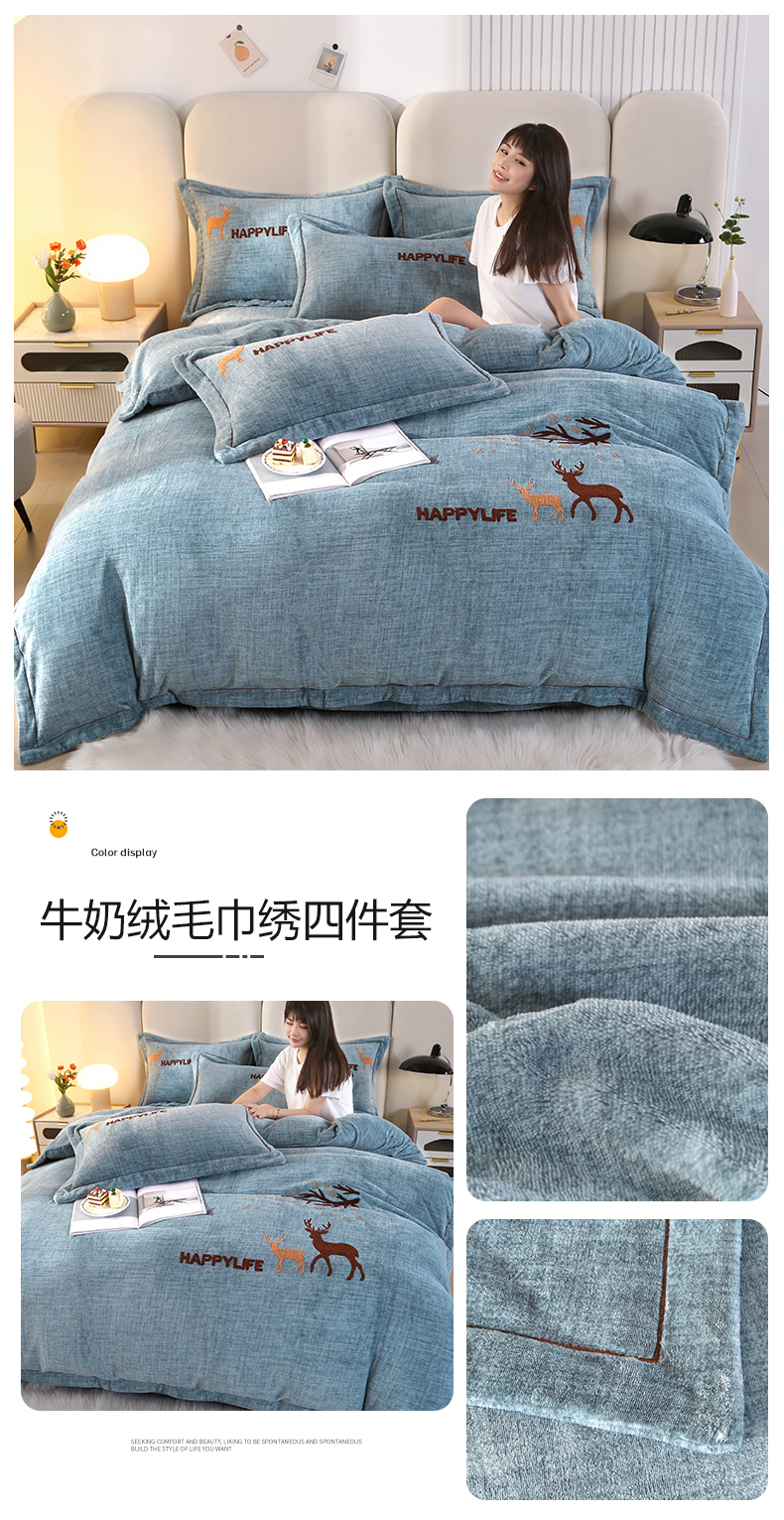 代芙家纺 2023秋冬新品全消光8.5斤牛奶绒加厚保暖毛巾绣四件套 小鹿-墨绿