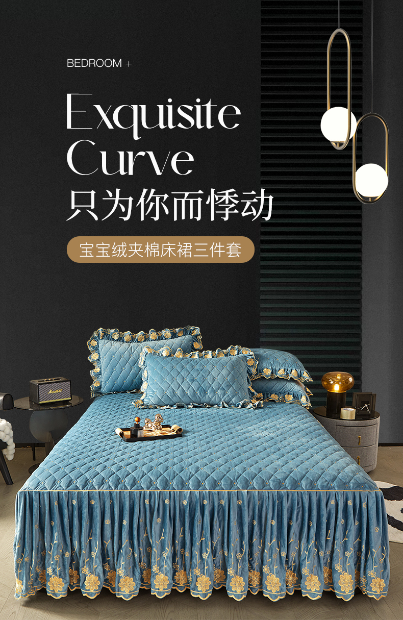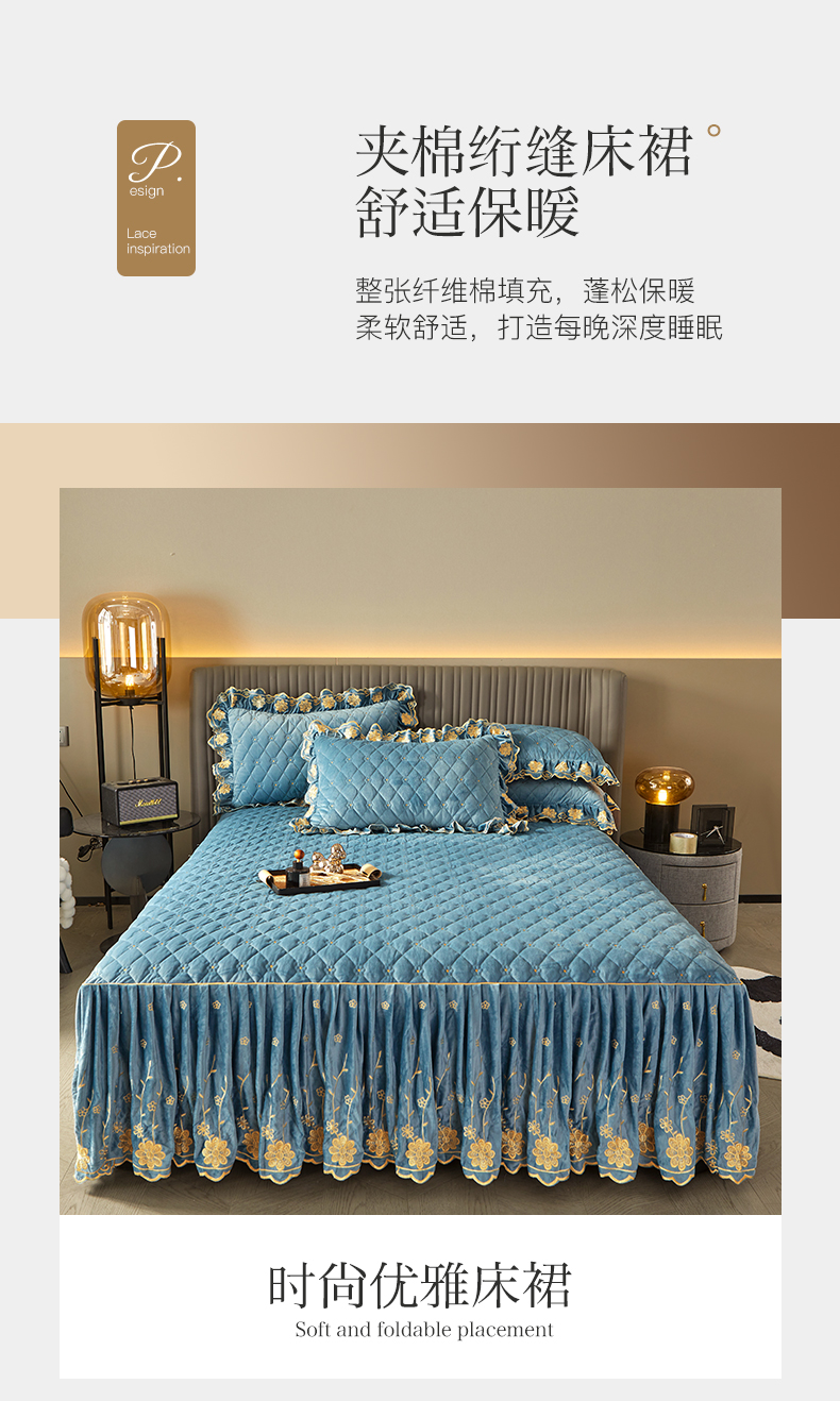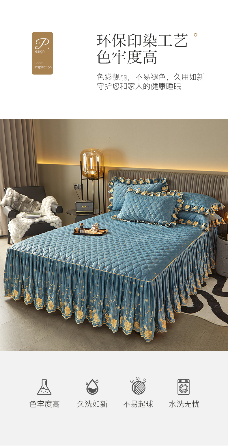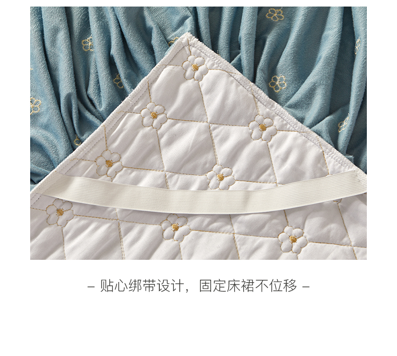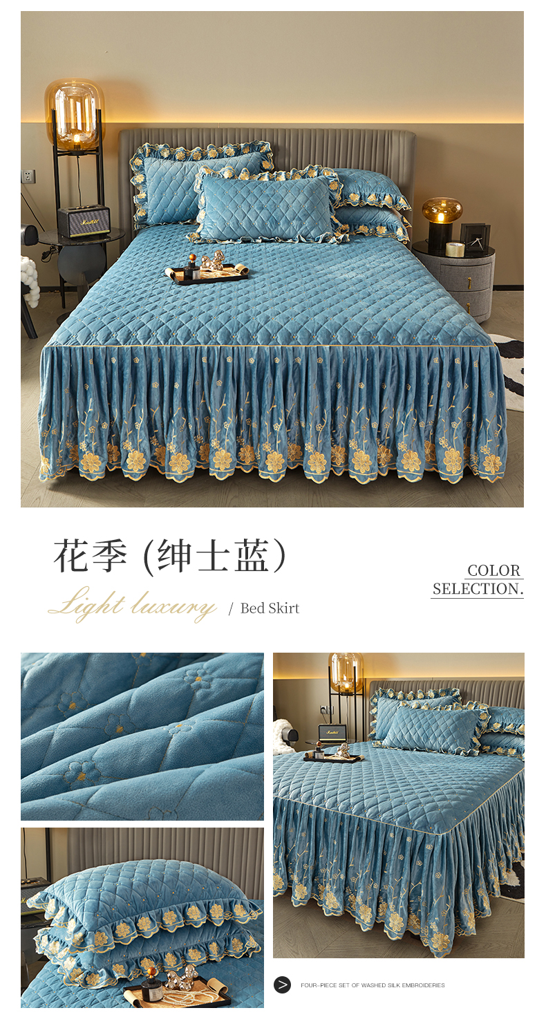 商品名称:罗艺轩 2024新款花季宝宝绒全套夹棉絎缝加厚系列床裙三件套 绅士蓝