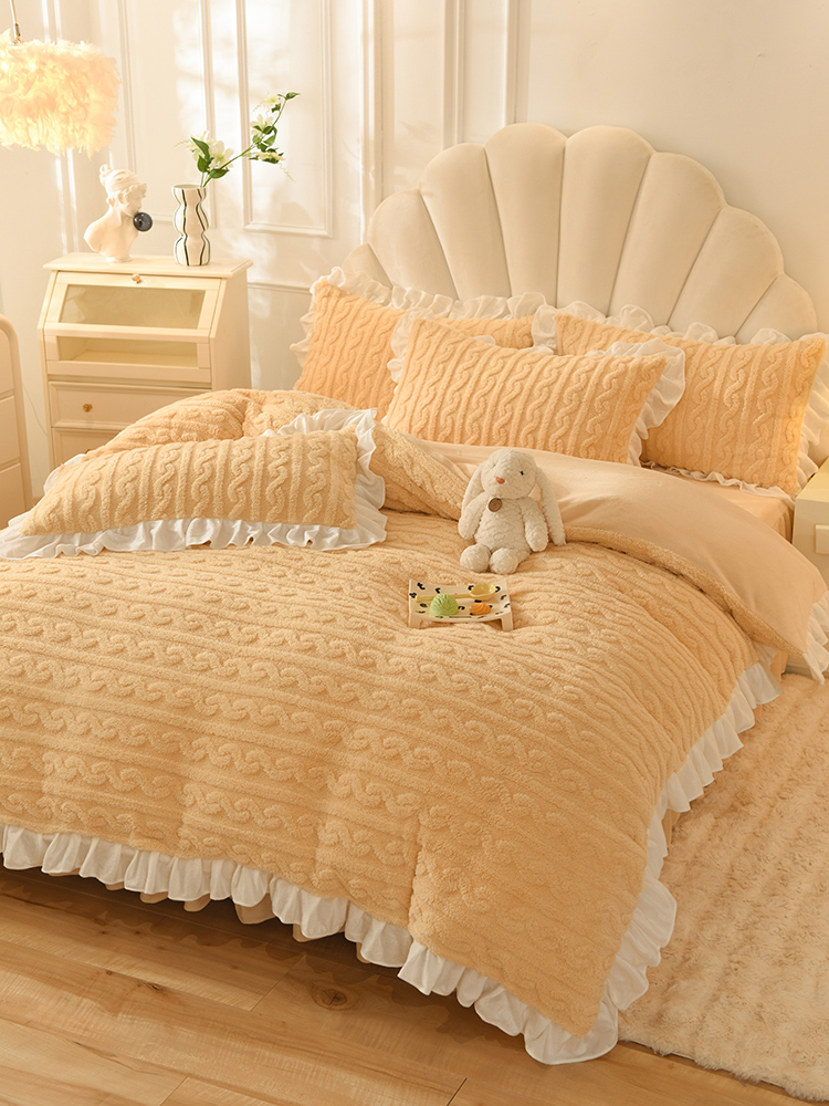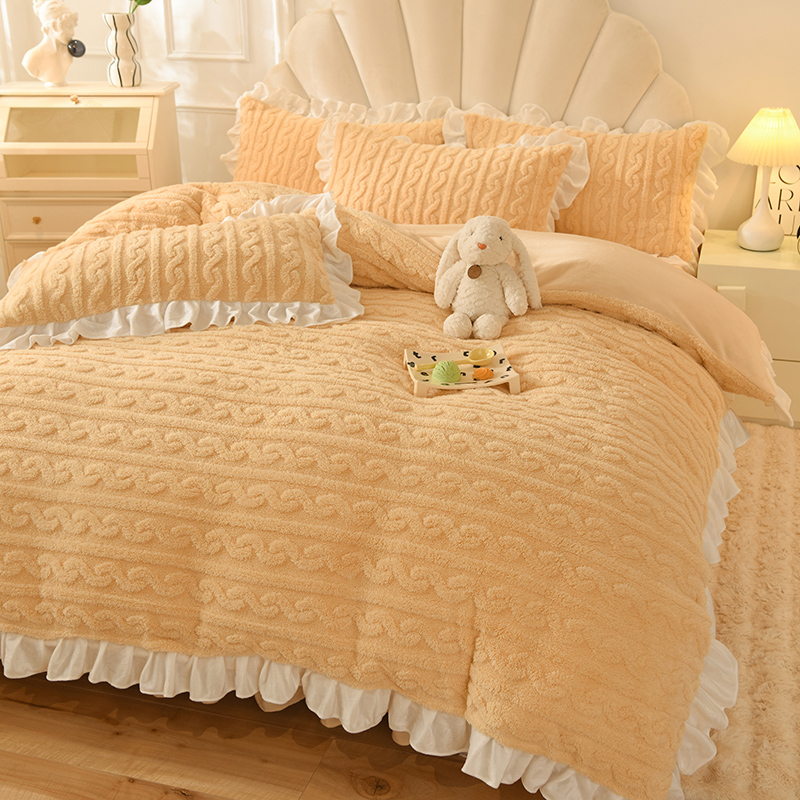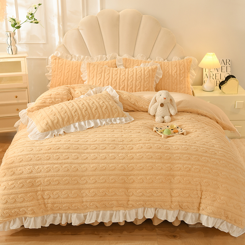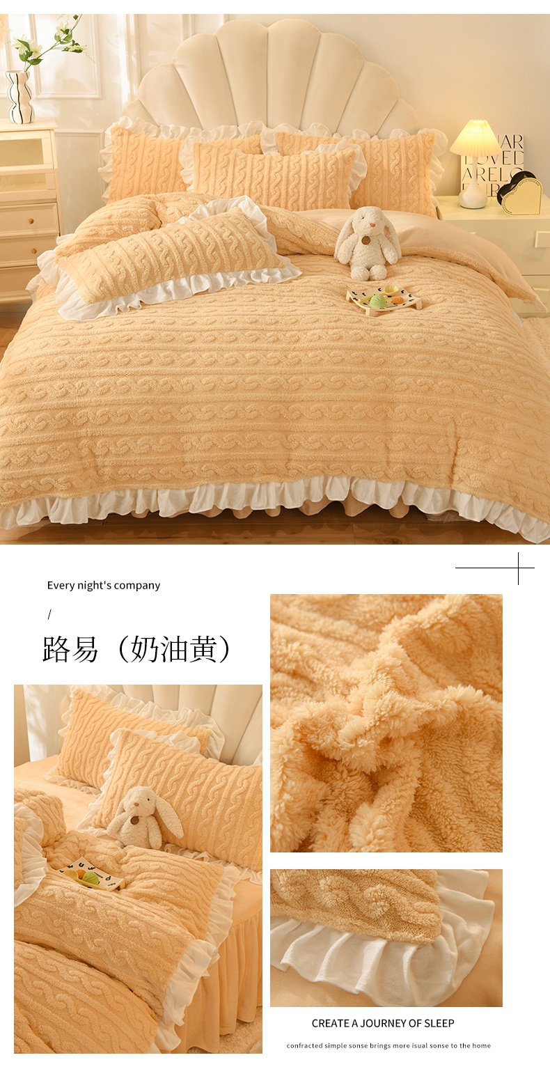 当前位置: 91家纺网 > 商品网购 > 床品套件 > 四件套 > 韩约2023新款塔芙绒色织提花牛奶绒四件套-床裙款 路易(奶油黄)