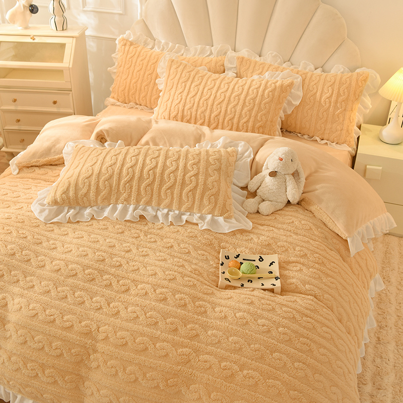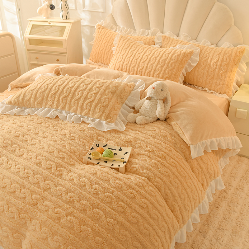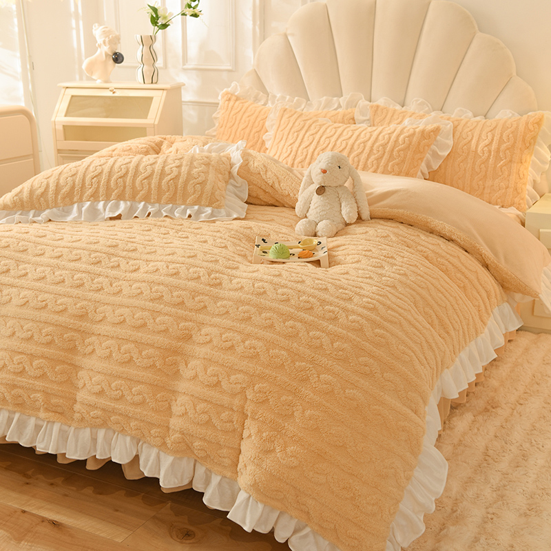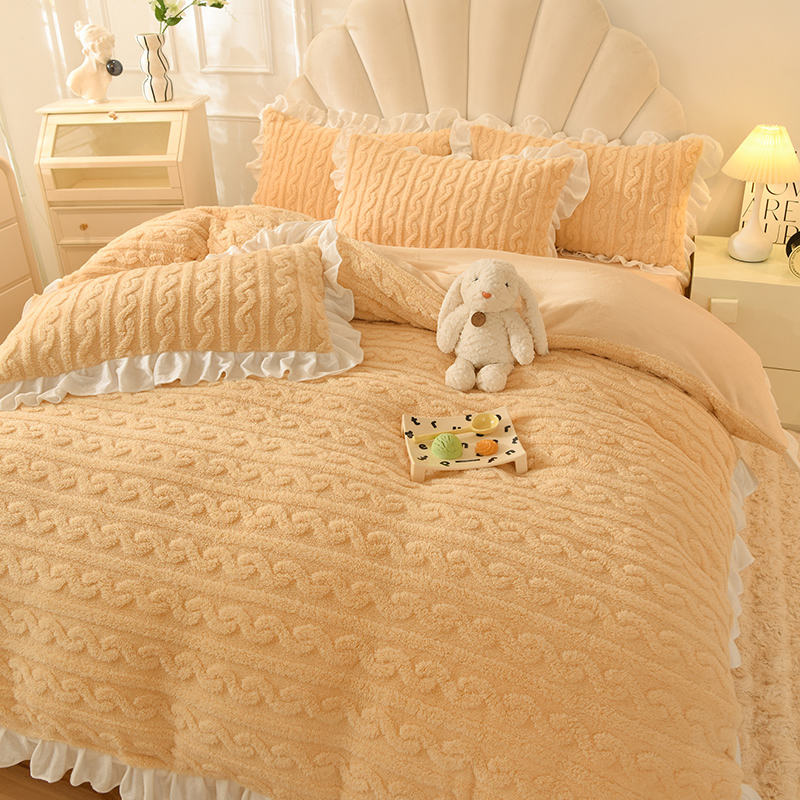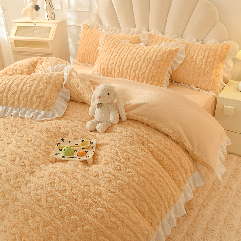 当前位置: 91家纺网 > 商品网购 > 床品套件 > 四件套 > 韩约2023新款塔芙绒色织提花牛奶绒四件套-床裙款 路易(奶油黄)