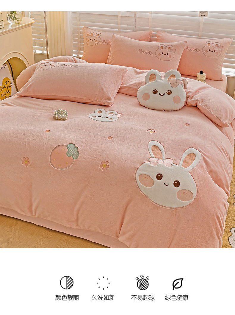 商品名称:娜娜 2023新款牛奶绒毛巾绣四件套 萌萌兔系列 萌萌兔-粉色