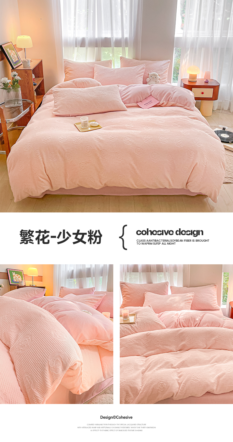 商品名称:蜜柚 2024新款全消光200克牛奶绒温柔治愈系奶油风雕花烂花极简牛奶绒四件套繁花-少女粉