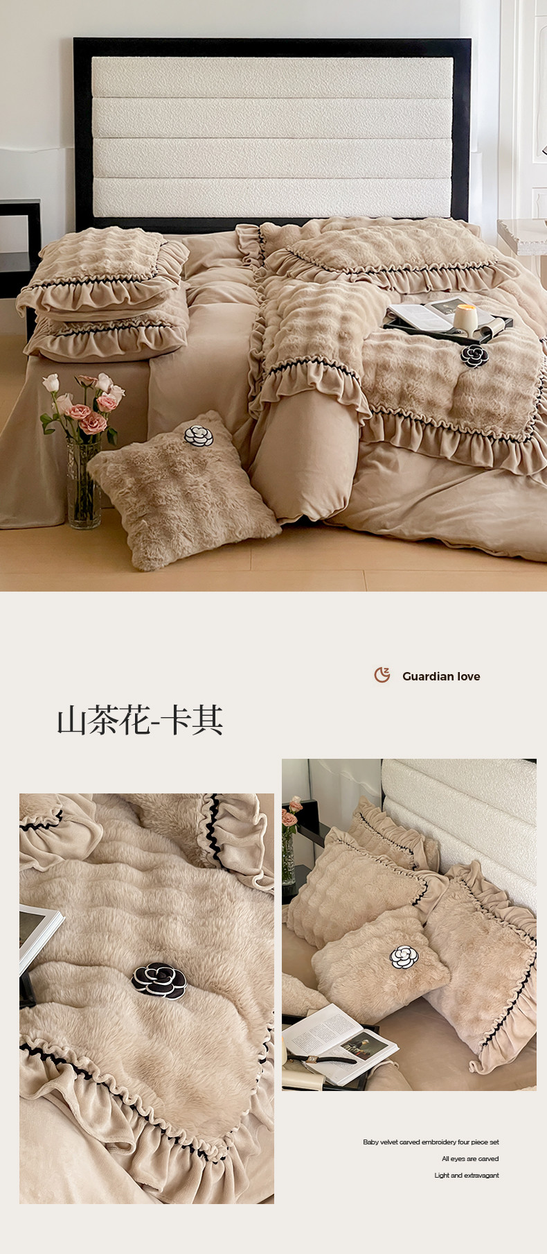 当前位置: 91家纺网 > 商品网购 > 床品套件 > 四件套 > 兔毛绒四件套 > (总)婳庭家居 2023新款山茶花兔兔绒系列四件套