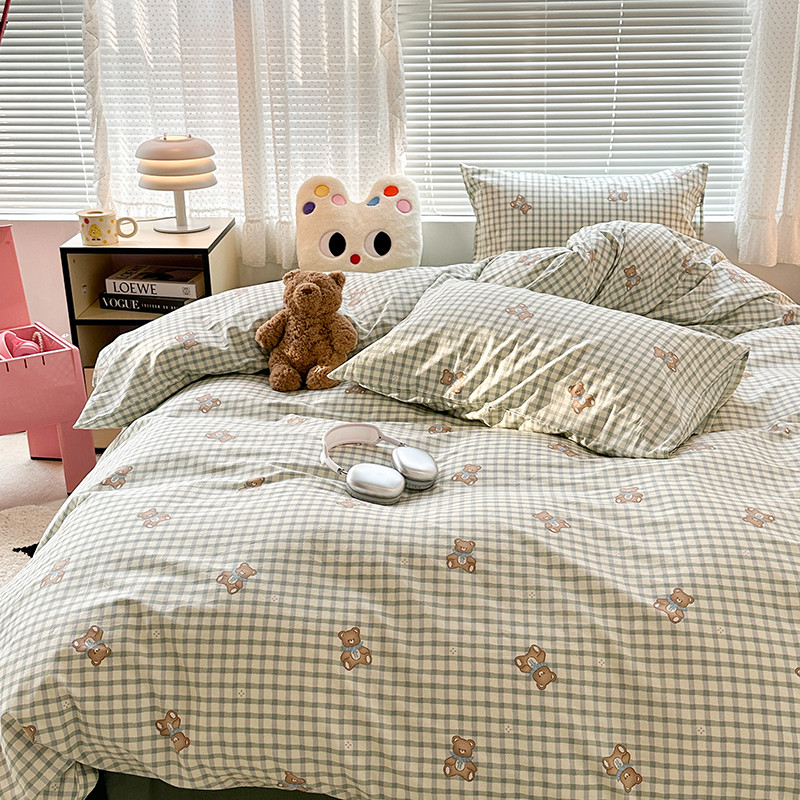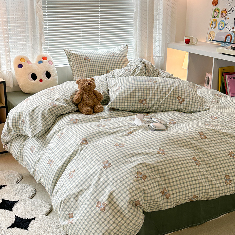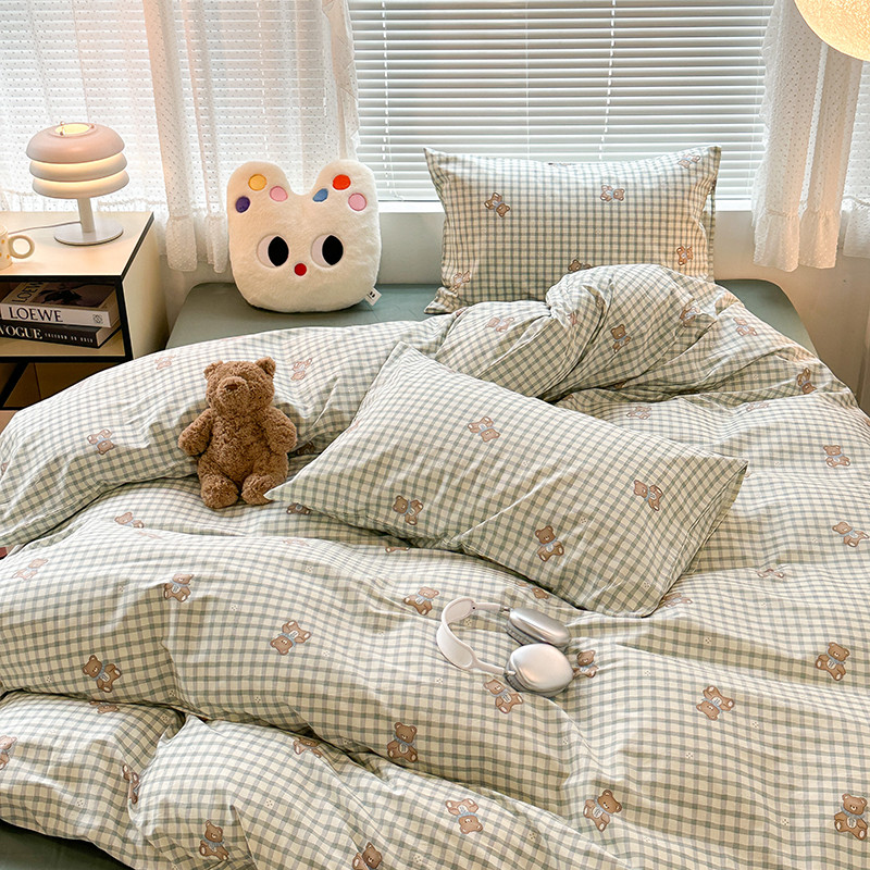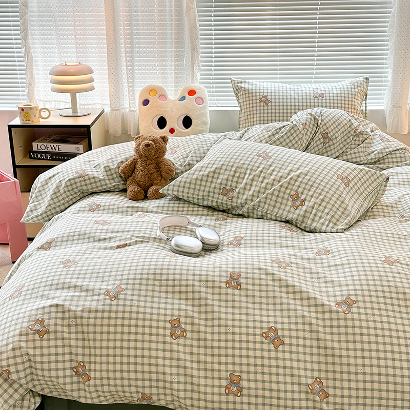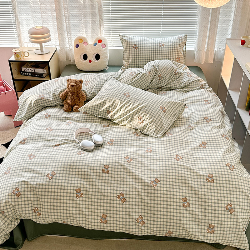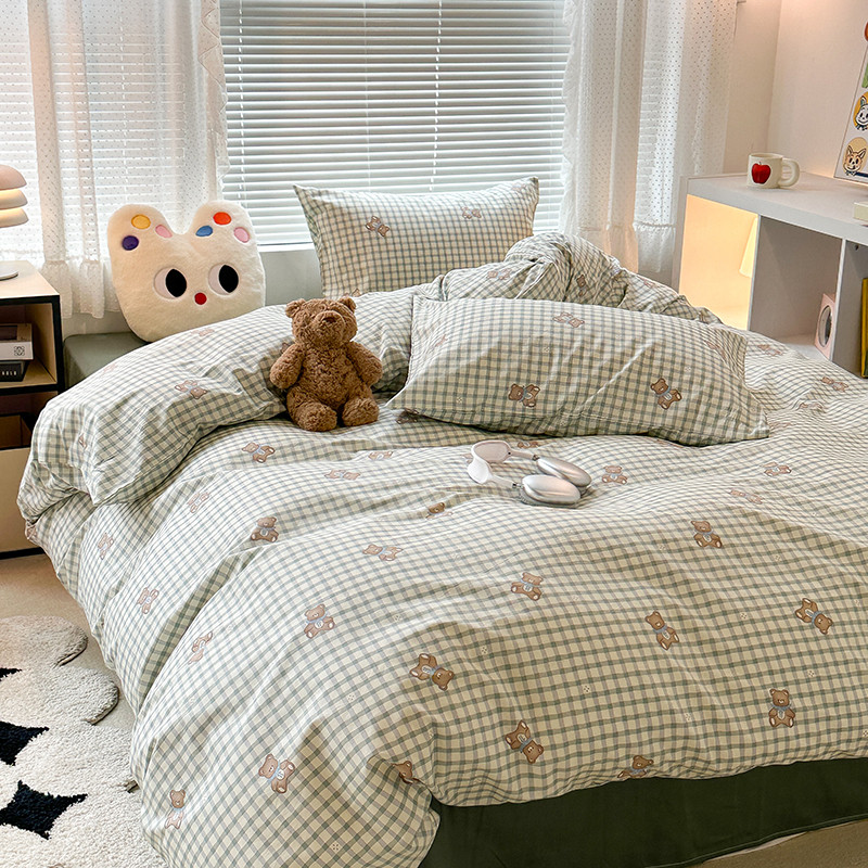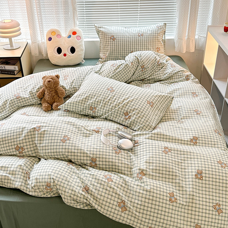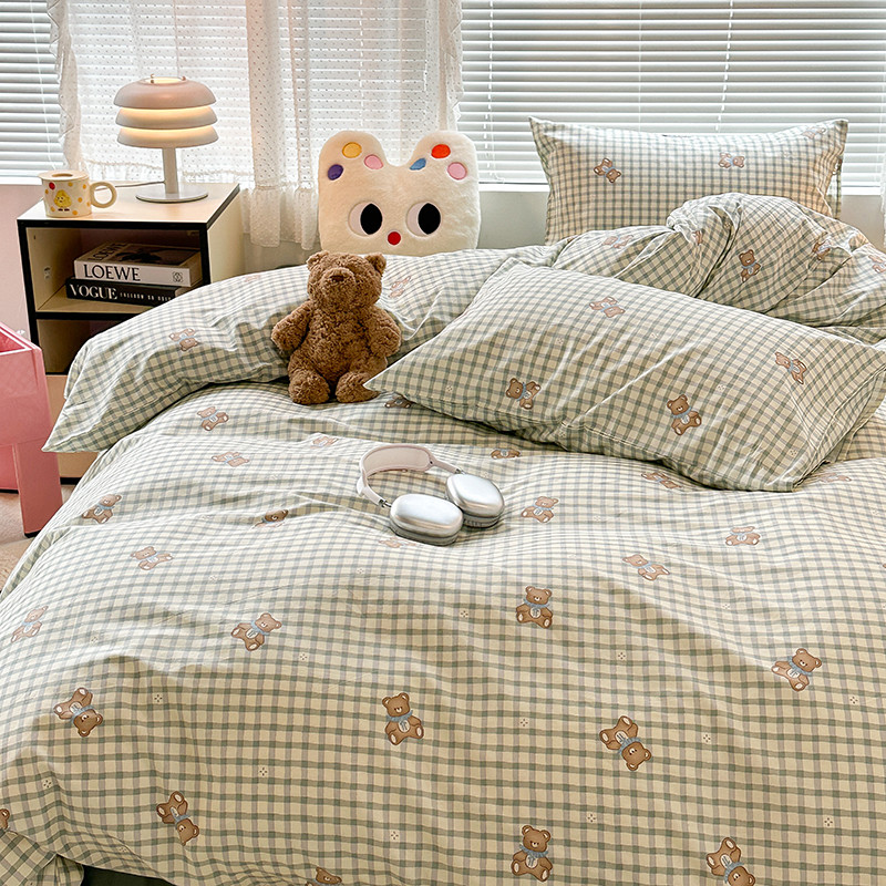 昔可 2023新款全棉小卡通爱心四件套 绿格宝贝熊