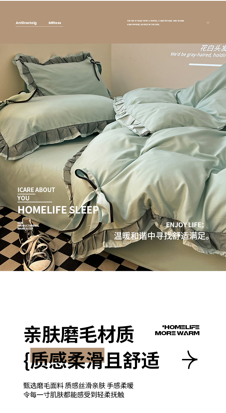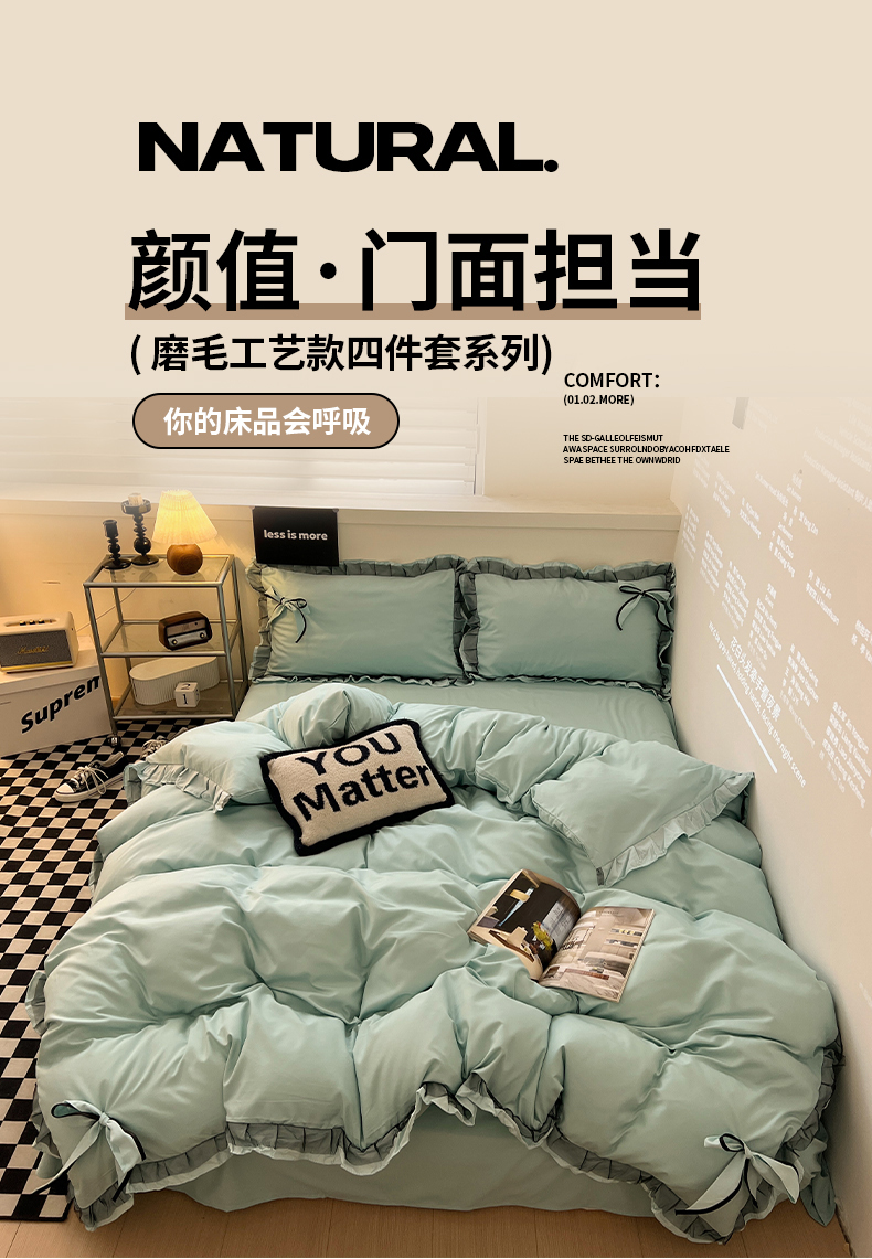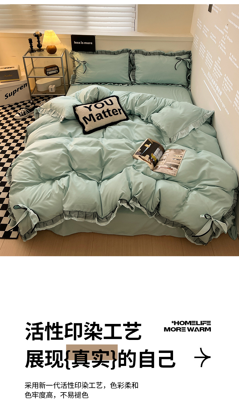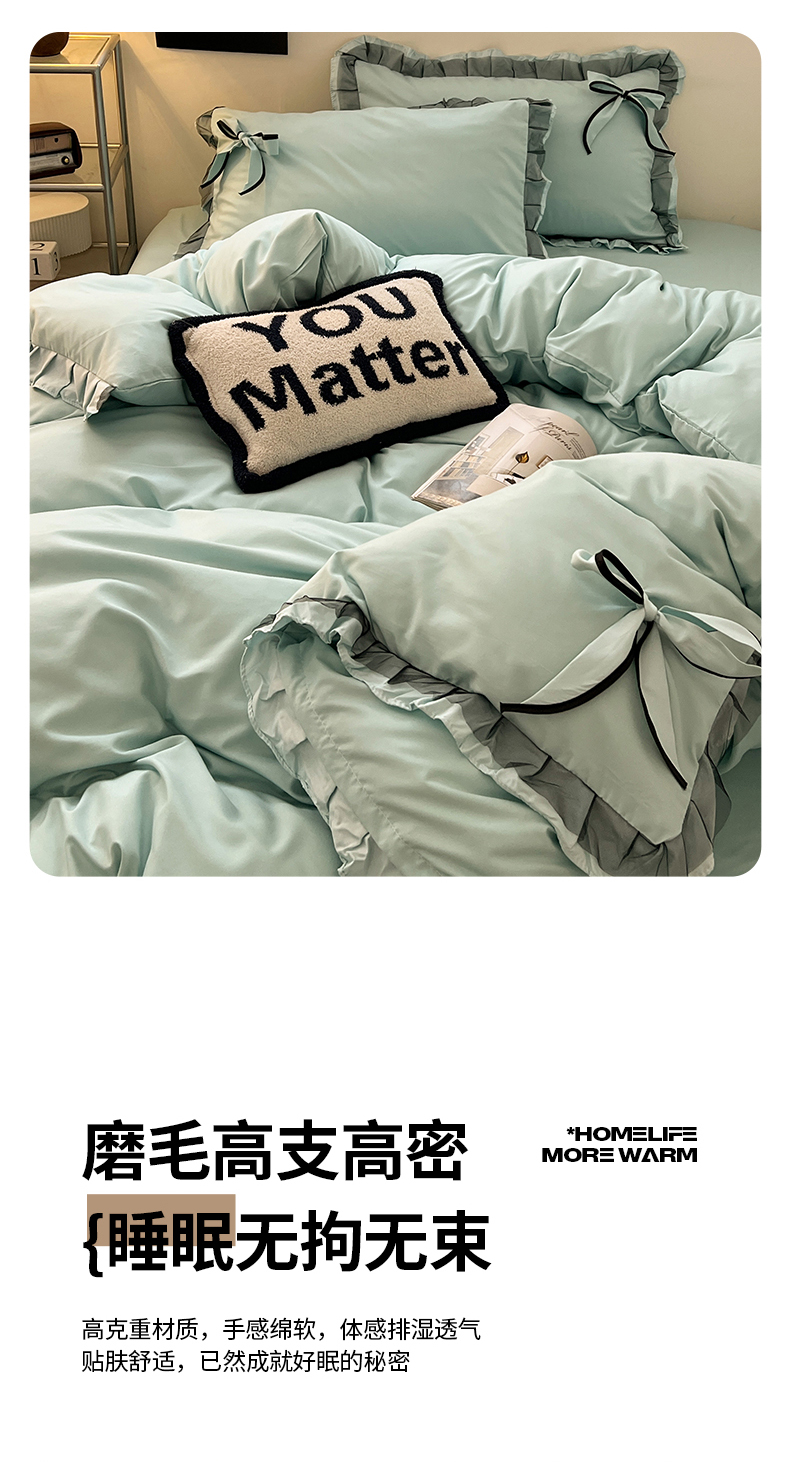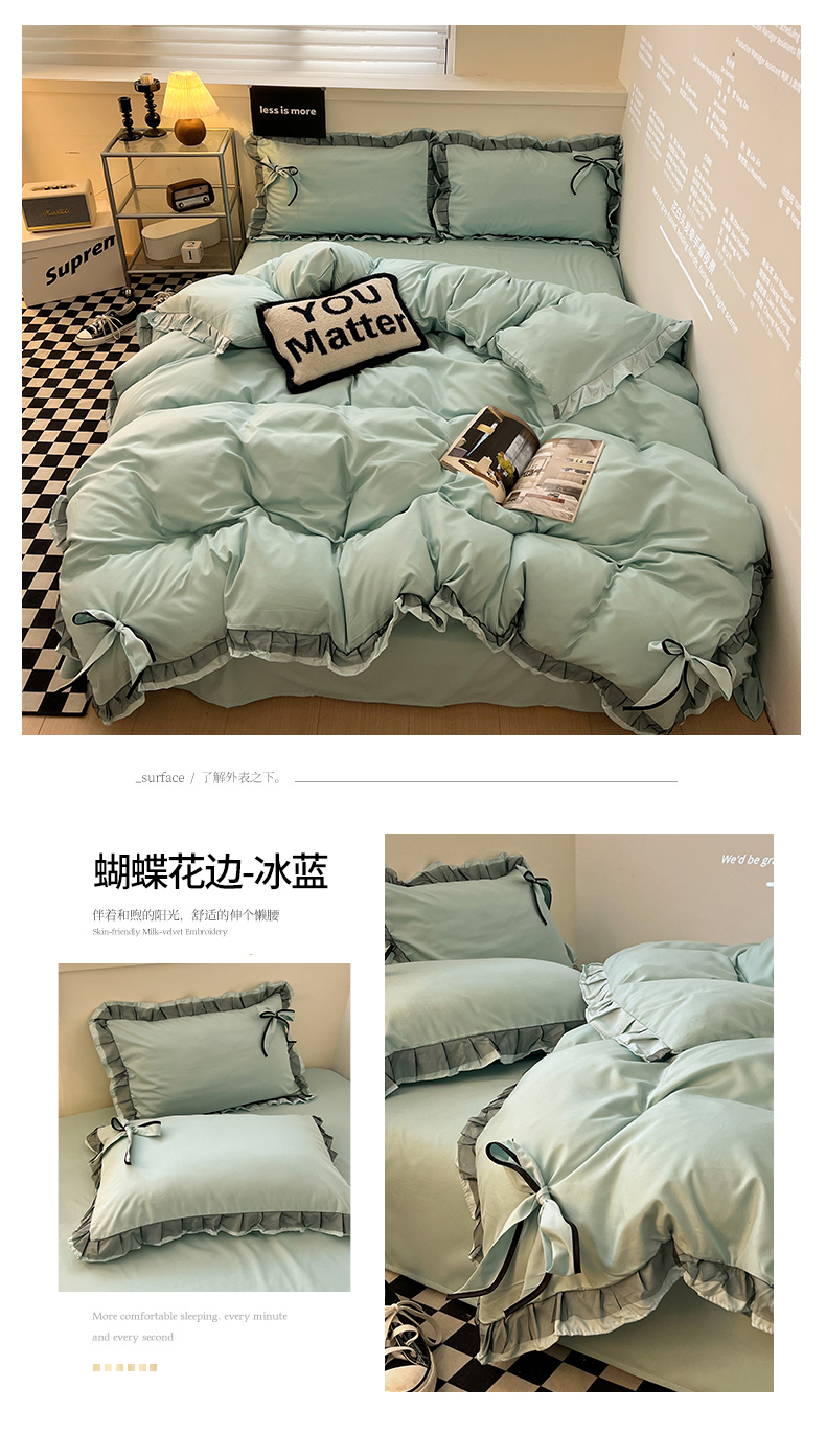 当前位置: 91家纺网 > 商品网购 > 床品套件 > 四件套 > 磨毛活性四件套 > 春光里 2024新款蝴蝶结花边磨毛四件套 蝴蝶花边-冰蓝