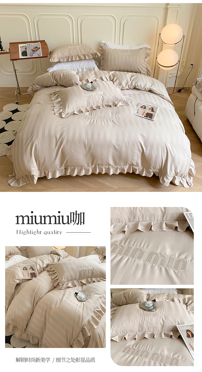 商品名称:吾欢心 2025新款miumiu系列贡缎提花棉花边刺绣四件套 miumiu咖