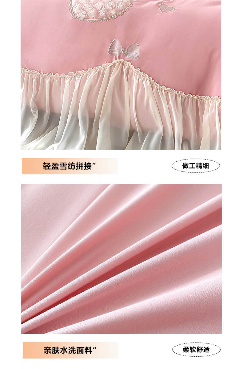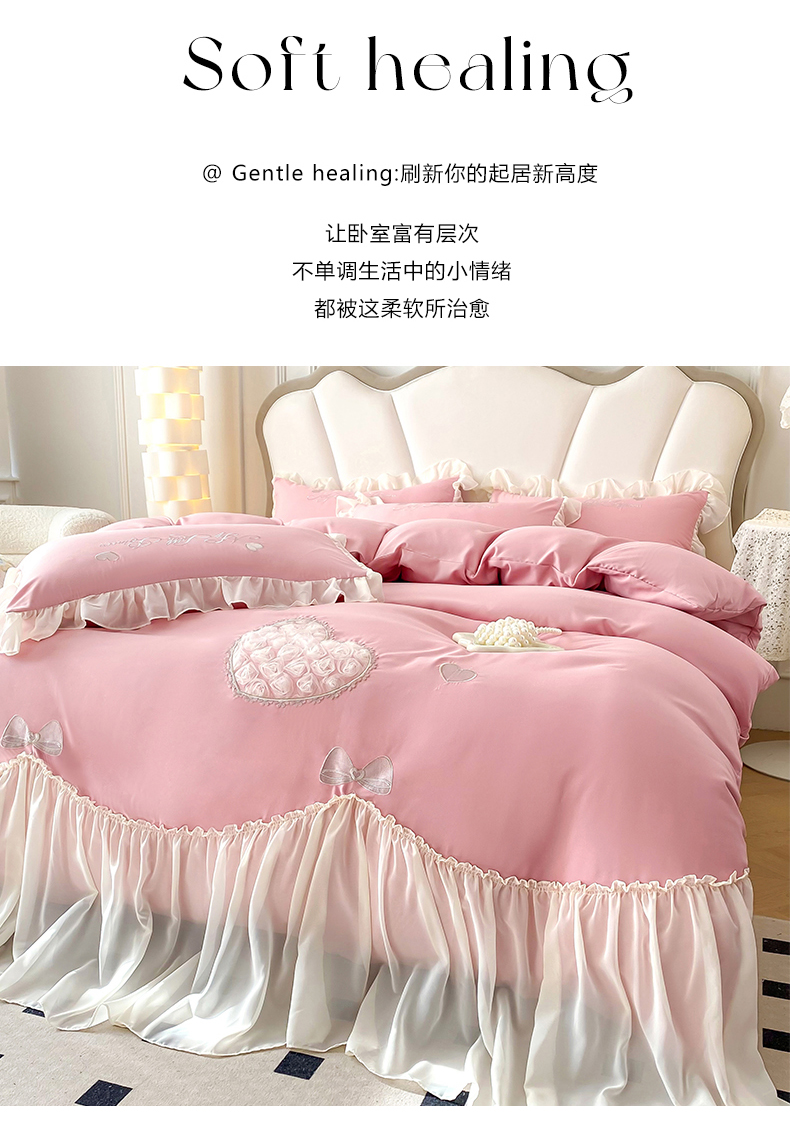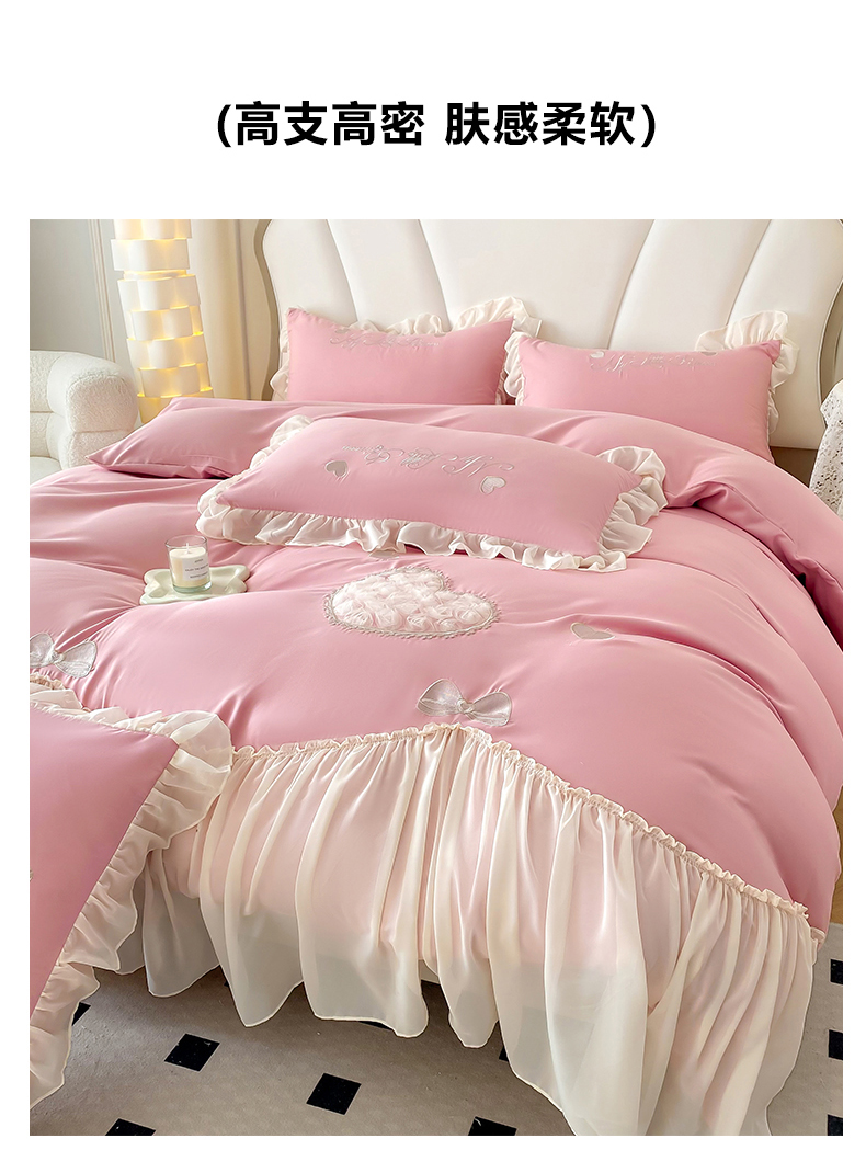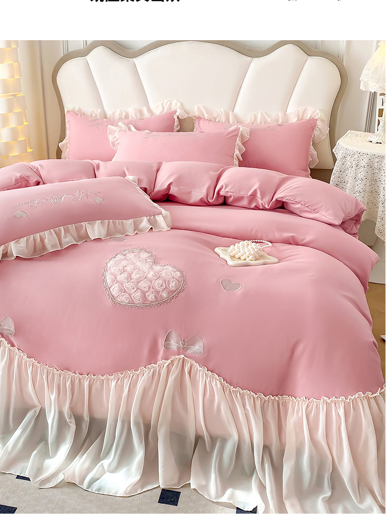 商品名称:富盛家纺 2024新款水洗亲肤棉立体刺绣四件套公主风四件套-爱心 爱心—豆沙
