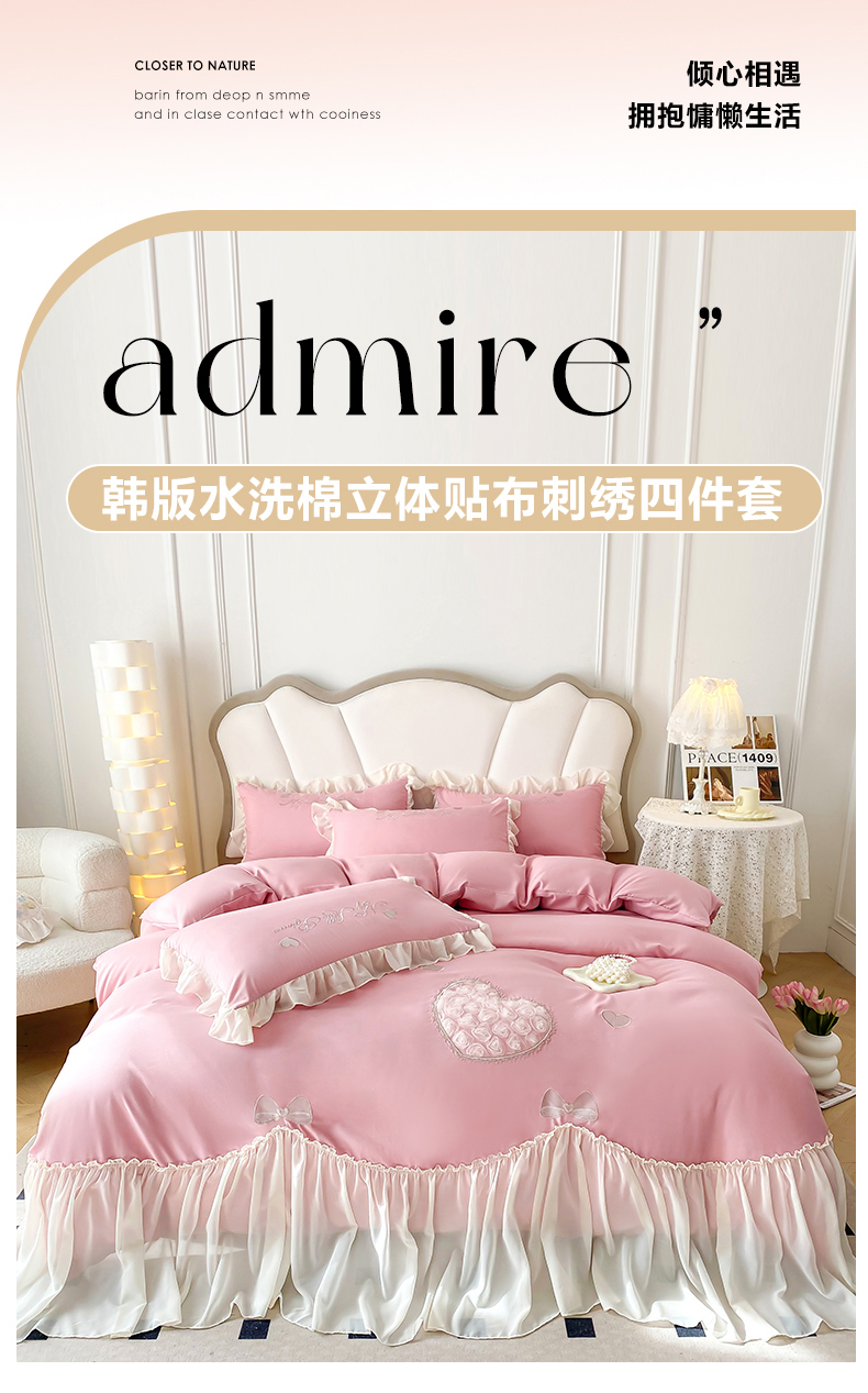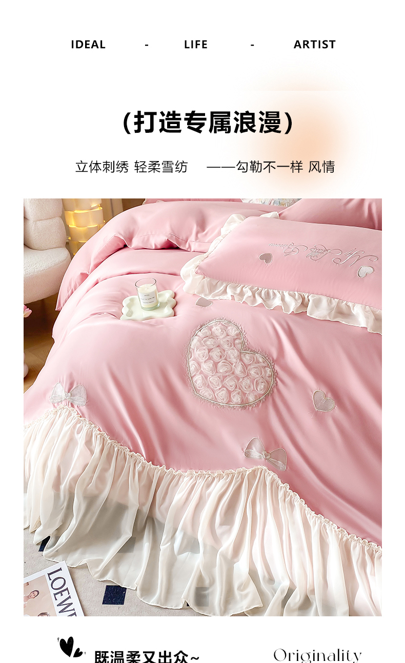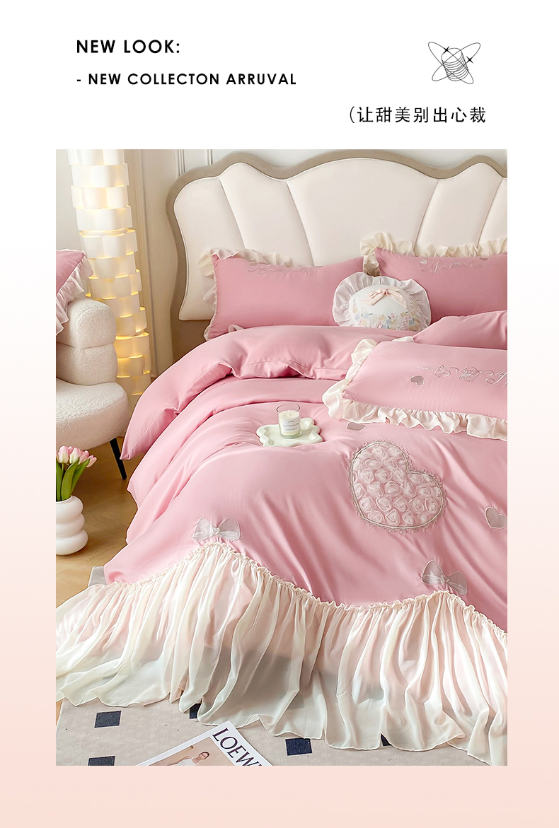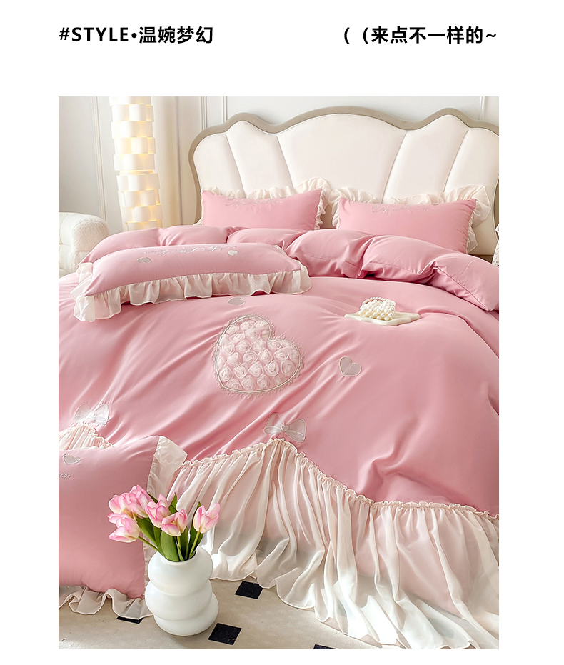 富盛家纺 2024新款水洗亲肤棉立体刺绣四件套公主风四件套-爱心 爱心—豆沙