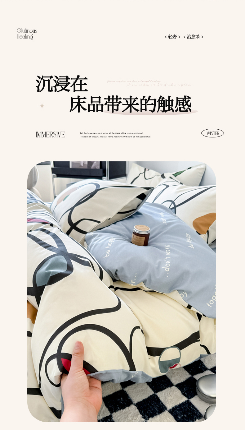 (总)呗旺鹿 2025新款卡通棉+牛奶绒四件套系列,QQ乐园,多彩笑脸,小萌鸭,蘑菇狗,奶油小熊,曲奇小熊