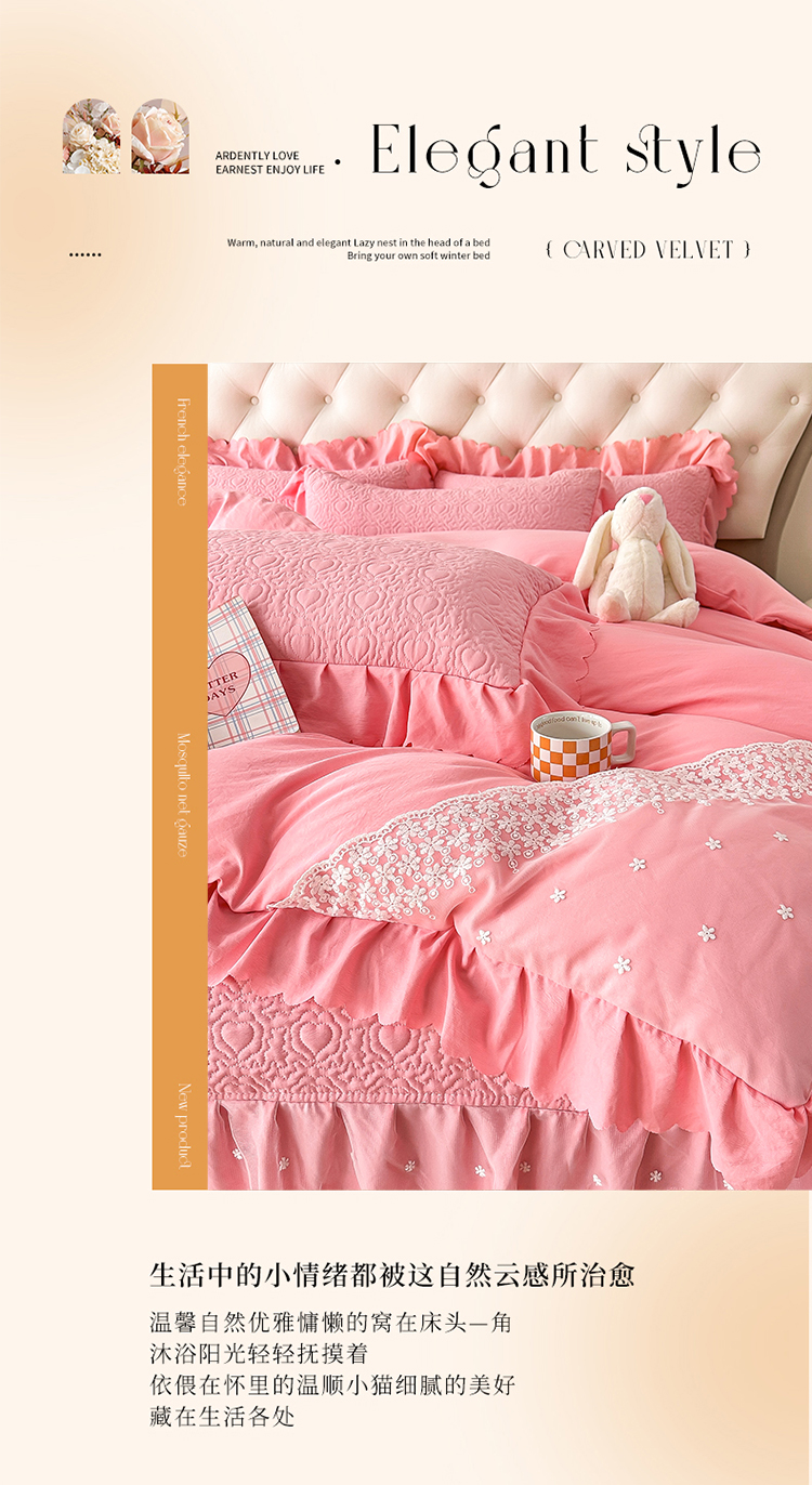 (总)漫布云 2025新款230g高克重韩版立体盘花牛奶蚕丝绒绣花四件套床裙款被套-洛丽塔系列,洛丽塔-嫩黄 ,洛丽塔-香芋紫 , 洛丽塔-珍珠粉,洛丽塔-婴儿蓝