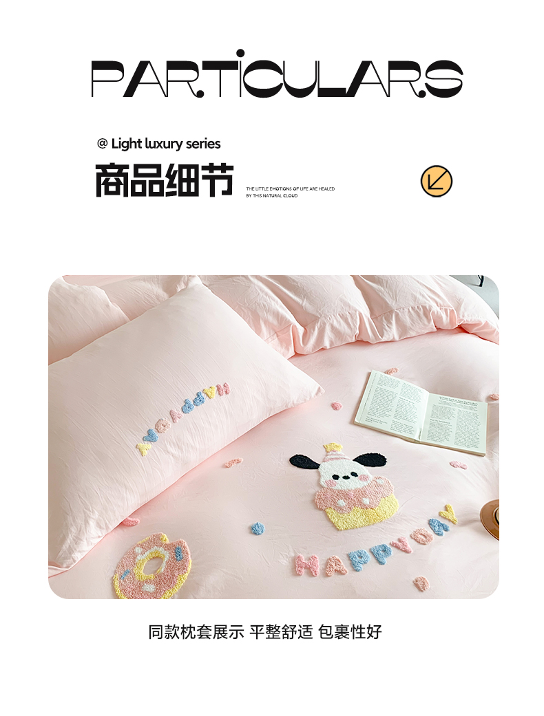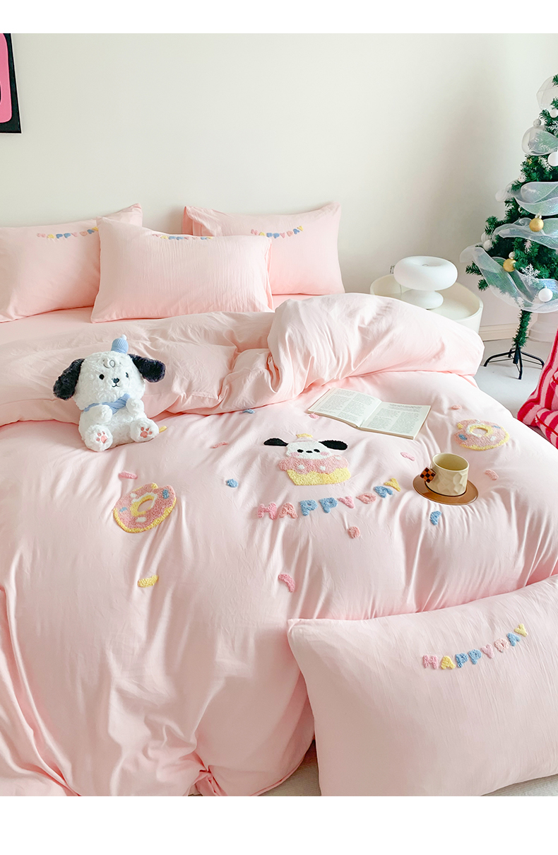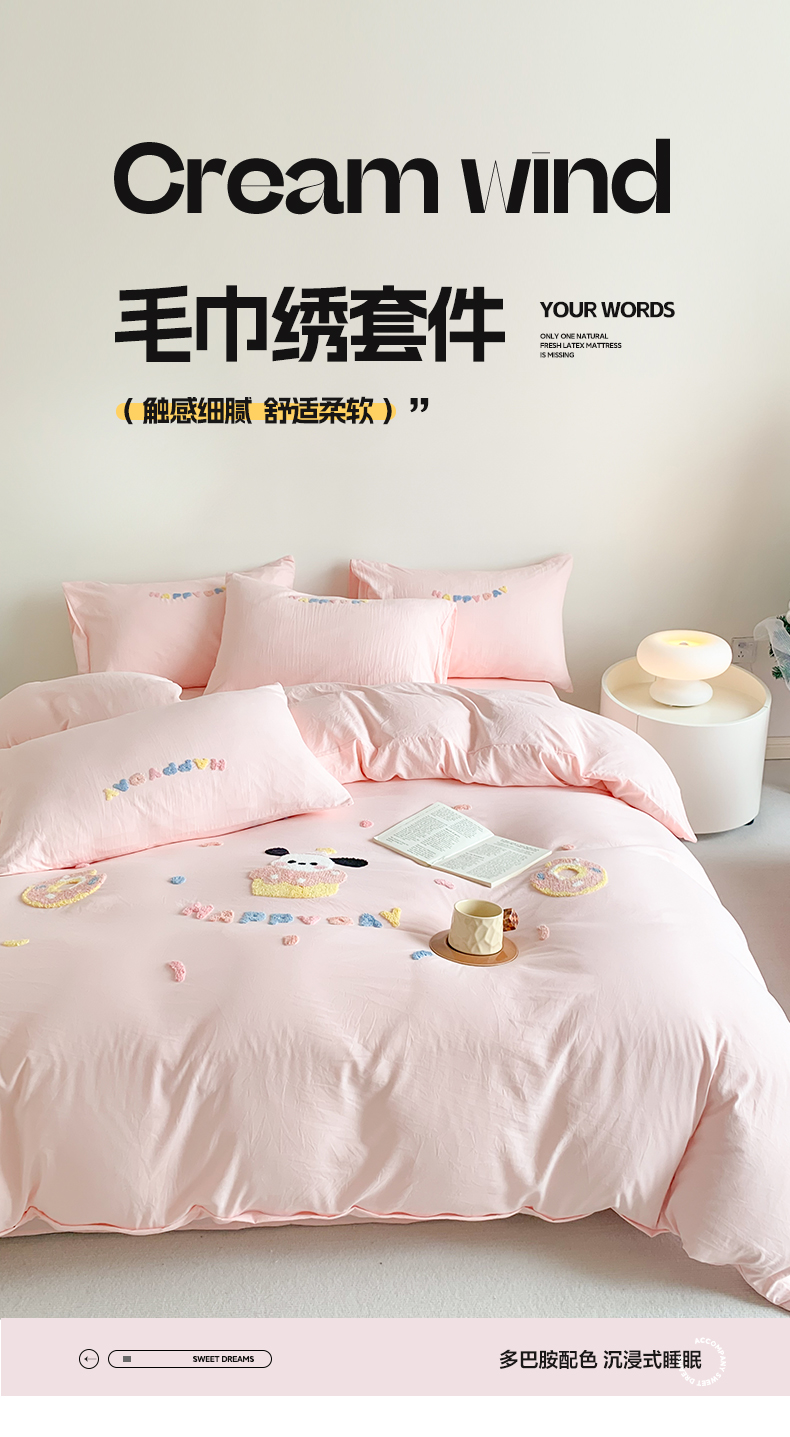 当前位置: 91家纺网 > 商品网购 > 床品套件 > 四件套 > 其它四件套 > 凯儿2024新款水洗棉卡通毛巾绣四件套-专版花型 甜圈狗狗粉