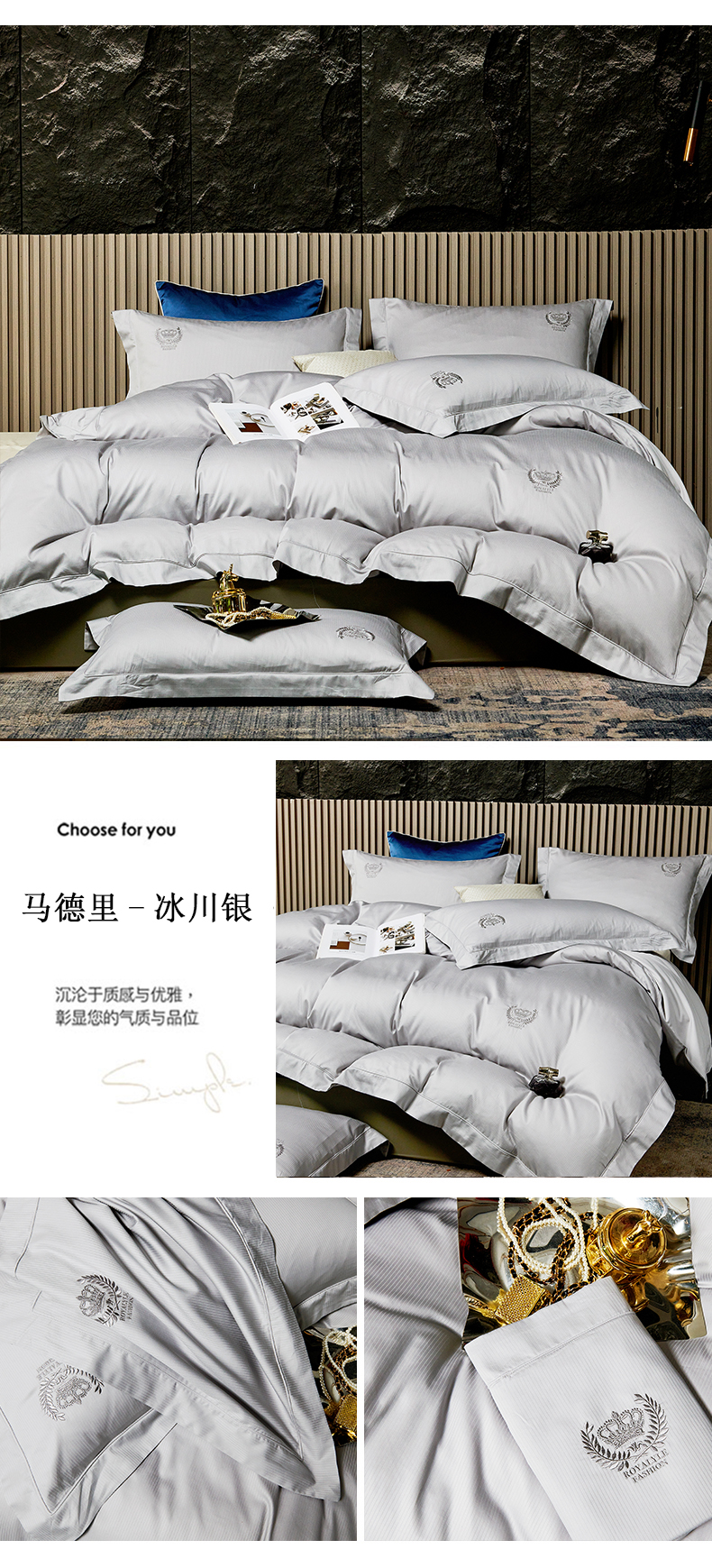 淳绵家居 2024新款50*50S双股长绒棉提花刺绣四件套-马德里 冰川银