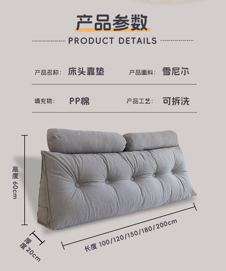 商品名称:碧尔家居 2025新款轻奢风床头靠枕榻榻米三角大靠垫软包加厚防撞护腰沙发靠背可拆洗 银灰