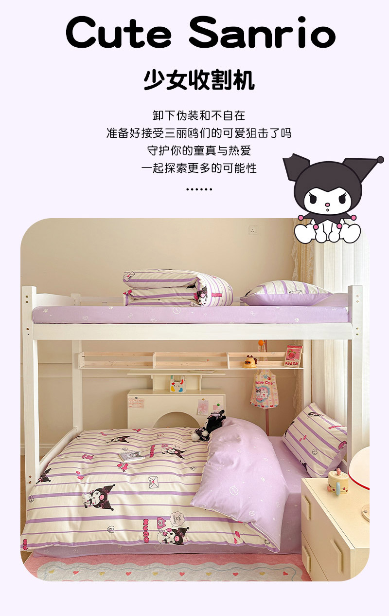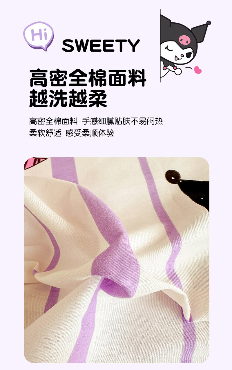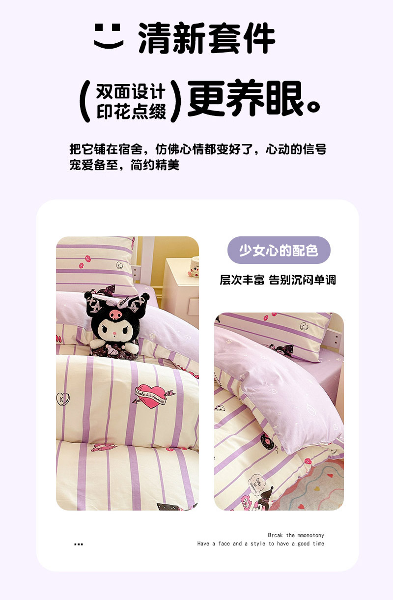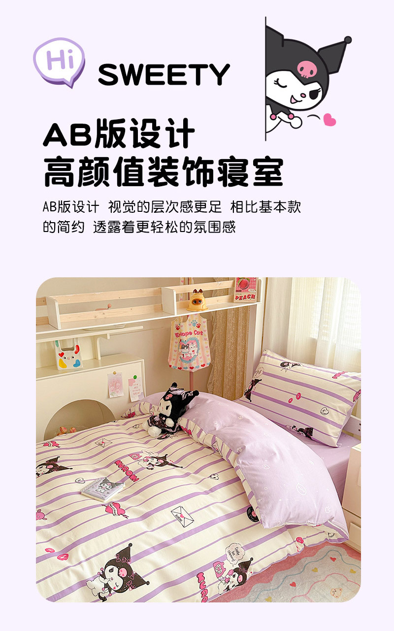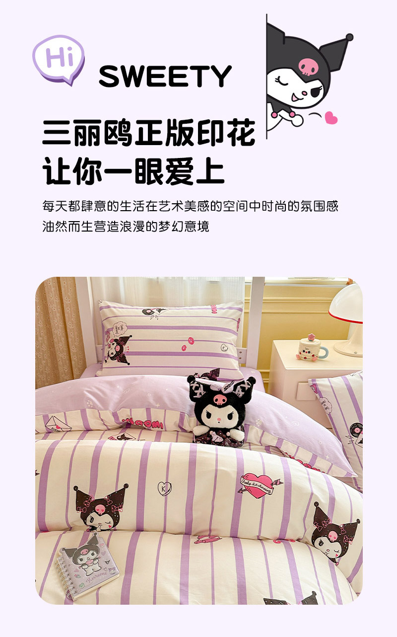 当前位置: 91家纺网 > 商品网购 > 床品套件 > 四件套 > 全棉普通四件套 > 蓝邻家纺 2024新款三丽鸥正版授权学生宿舍全棉印花四件套 米酷紫