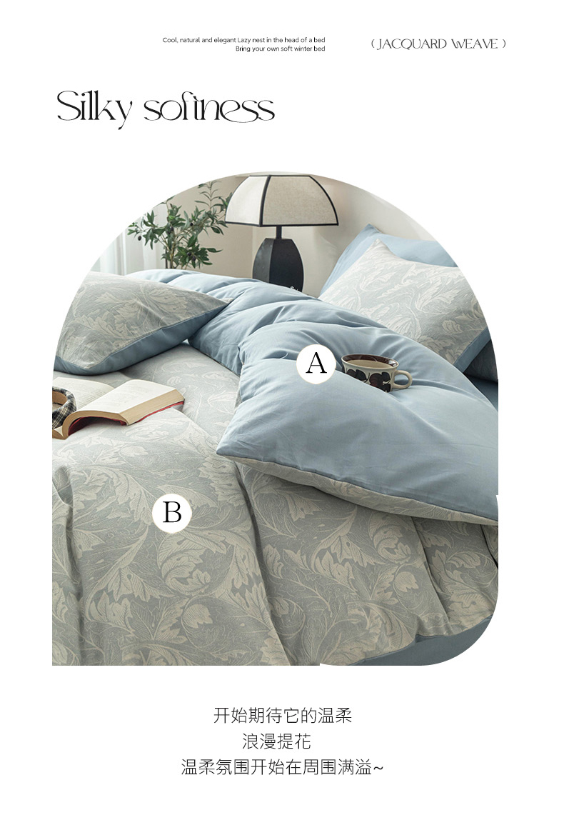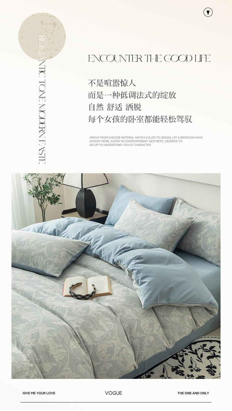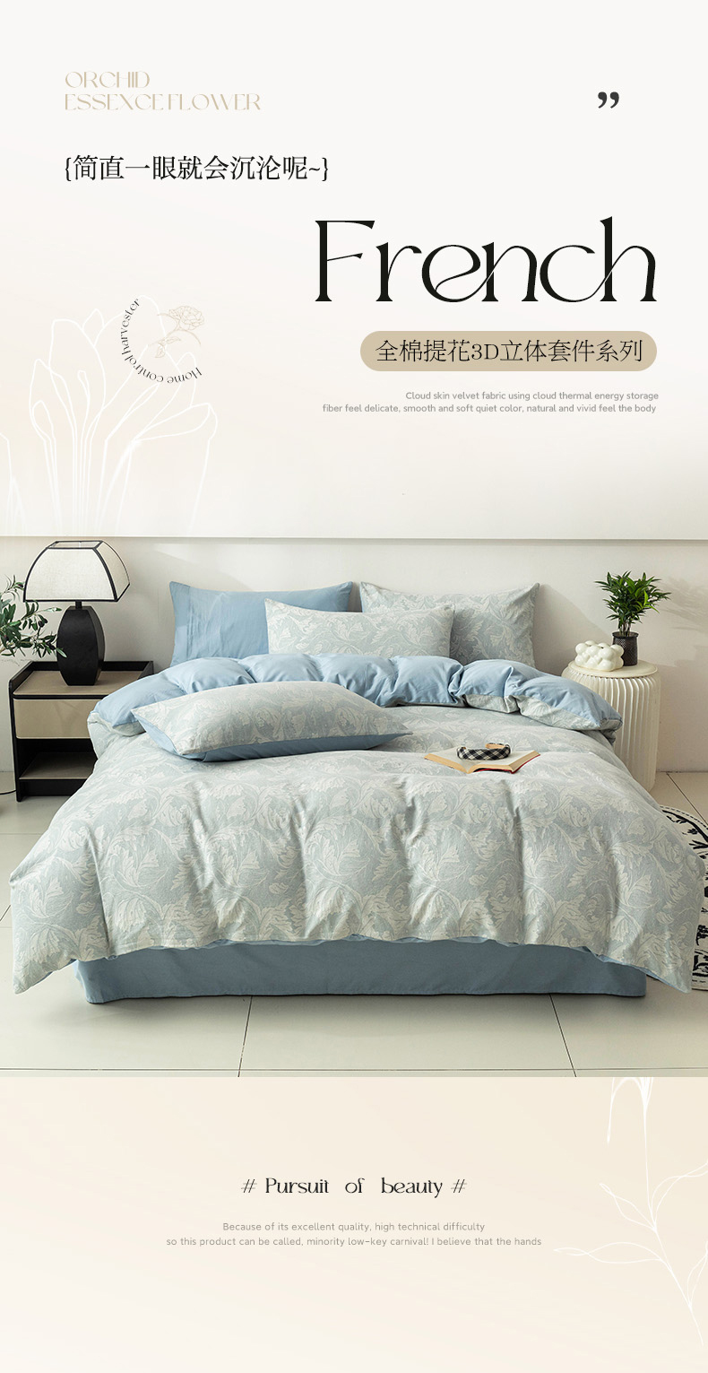 当前位置: 91家纺网 > 商品网购 > 床品套件 > 四件套 > 全棉普通四件套 > 倾慕家纺 2024新款A类提花全棉3D立体简约纯棉单枕套被套套件系列-四件套 蓝色爱恋
