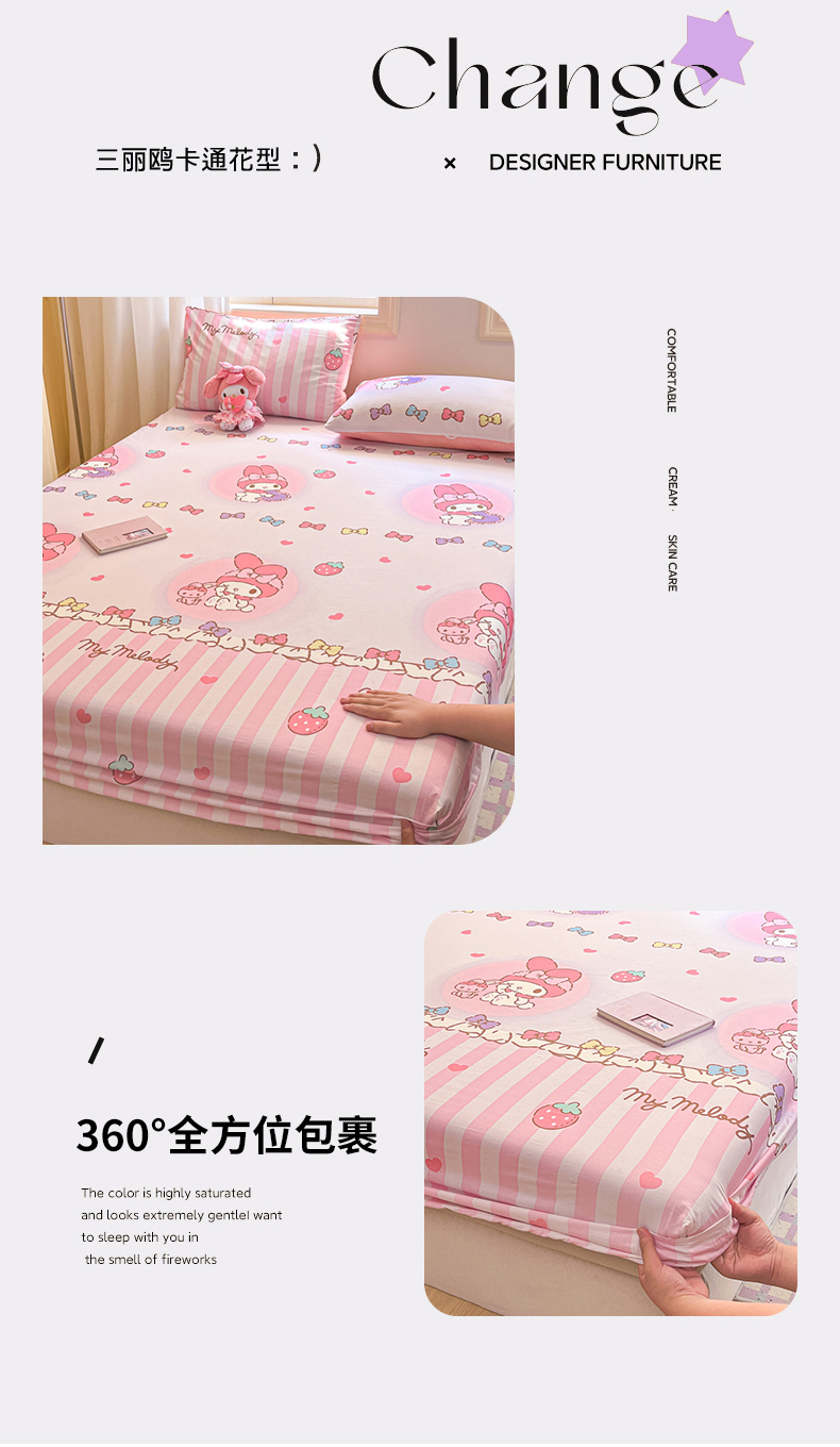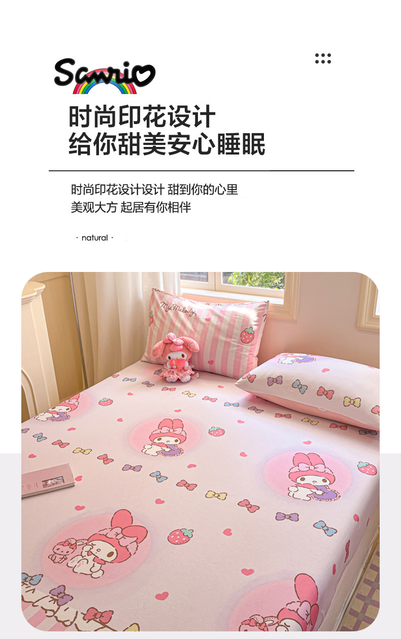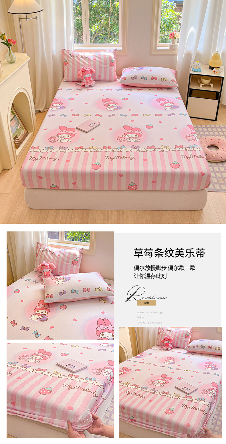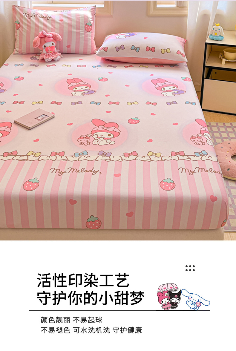 • 91家纺网 家纺一手货源 找家纺 博雅 2024新款三丽鸥卡通系列全棉印花床笠 草莓条纹美乐蒂