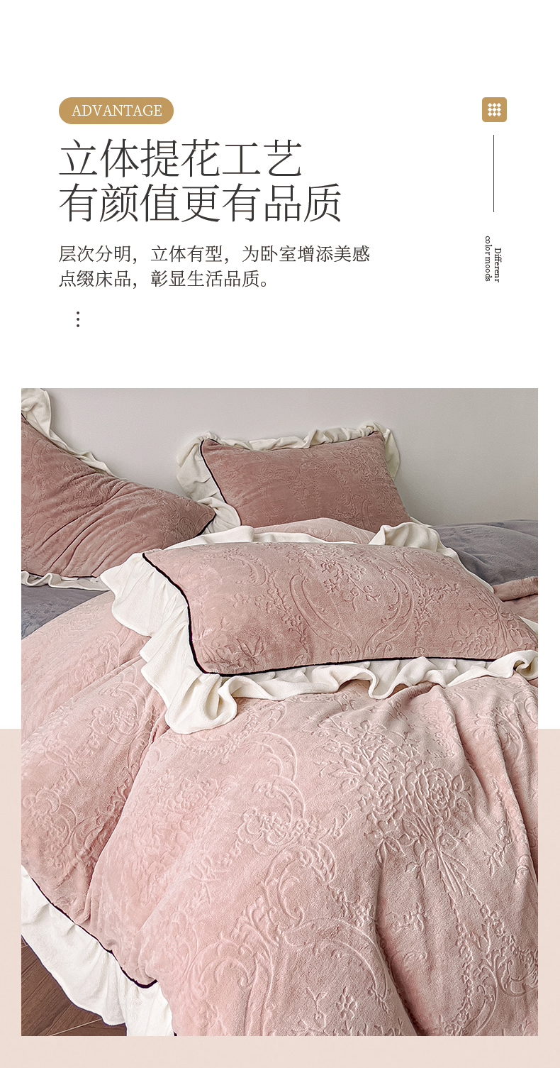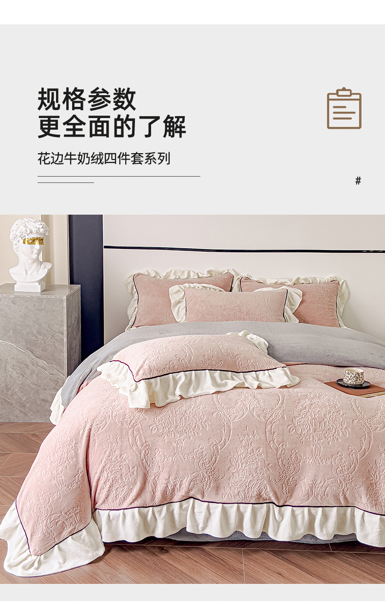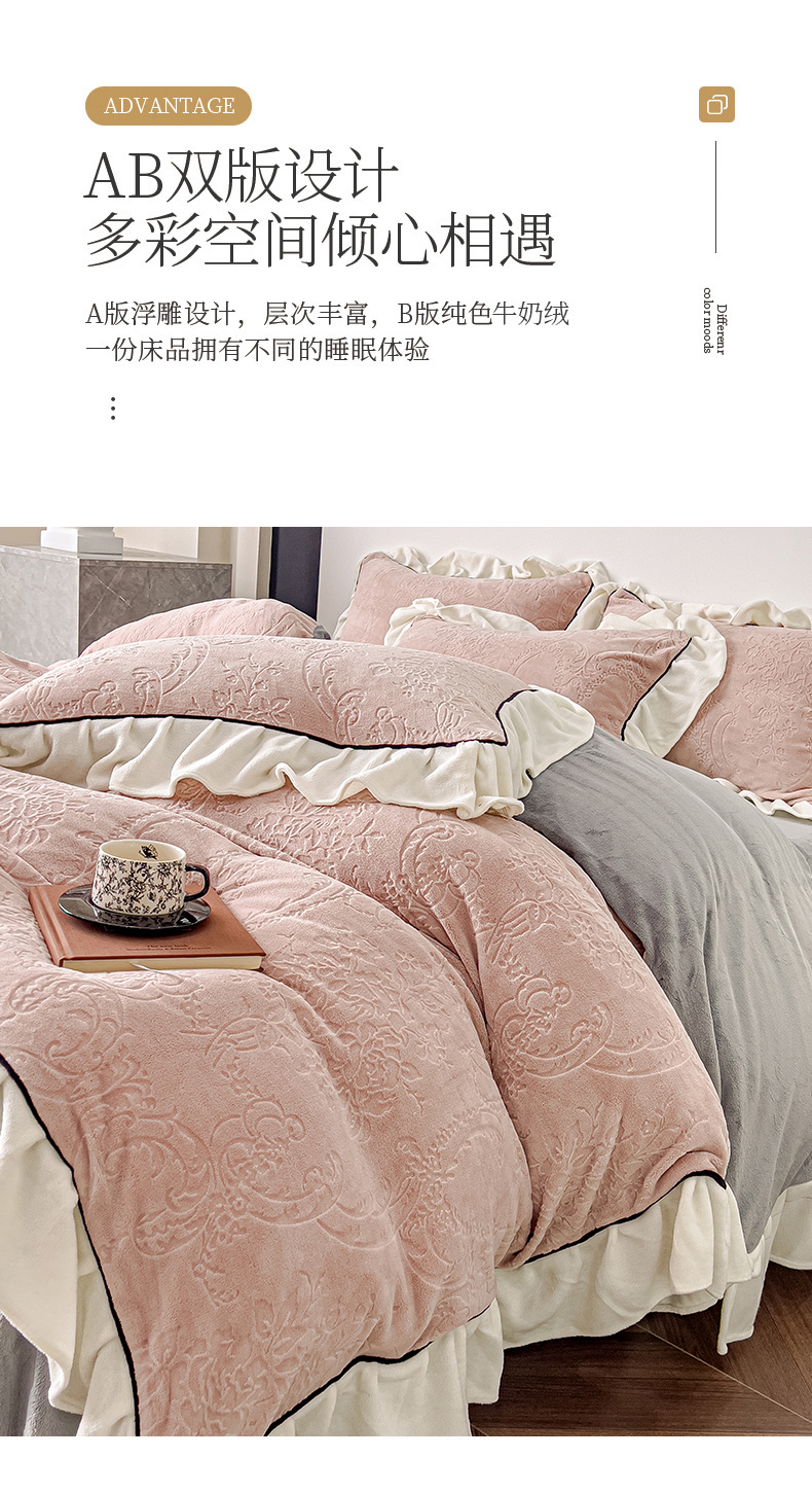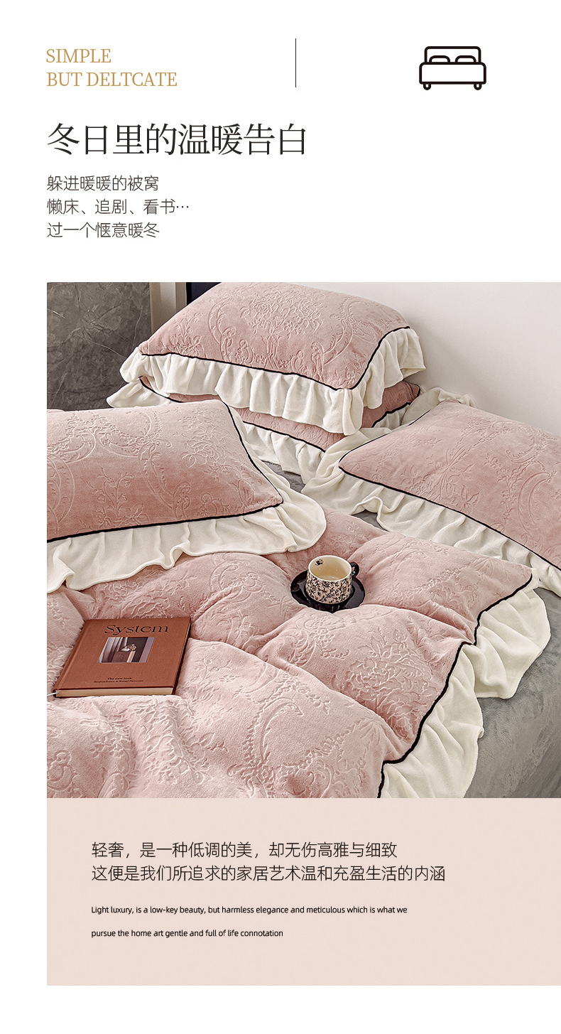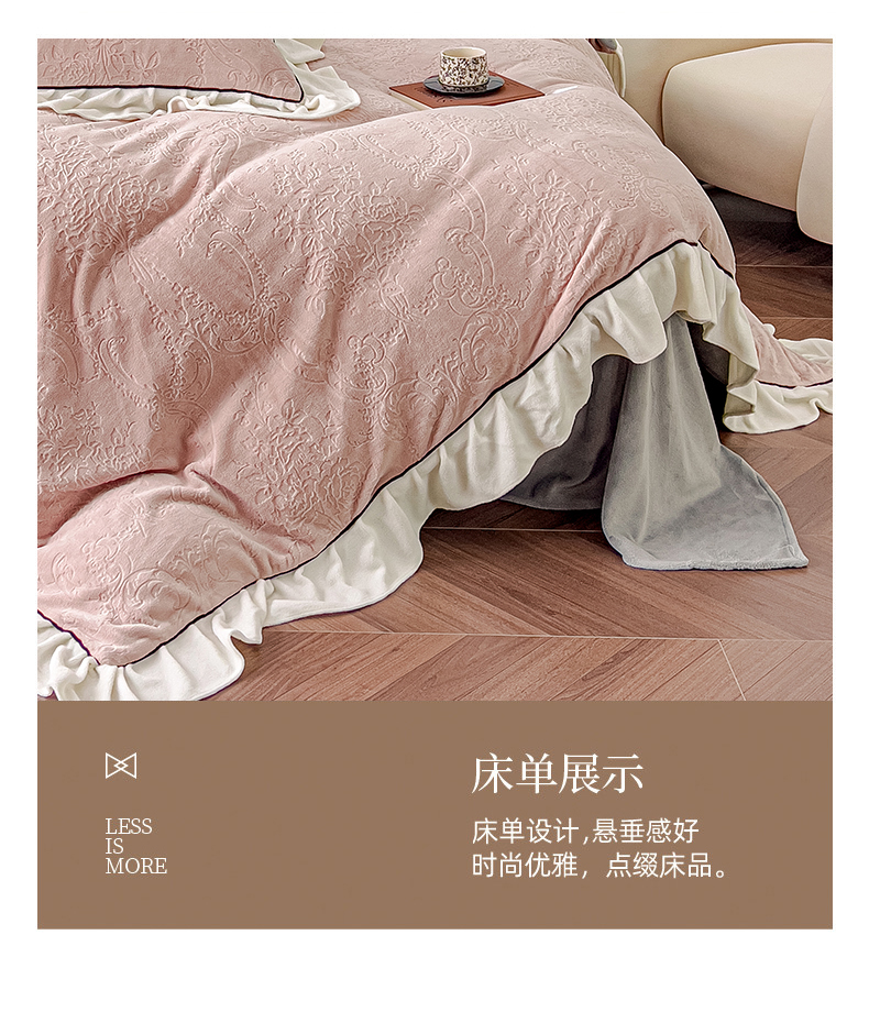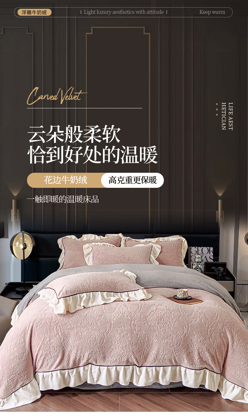当前位置: 91家纺网 > 商品网购 > 床品套件 > 四件套 > 牛奶绒四件套 > KA家纺 2025冬季新款雕花牛奶绒洛丽塔系列四件套-场景二 洛丽塔豆沙