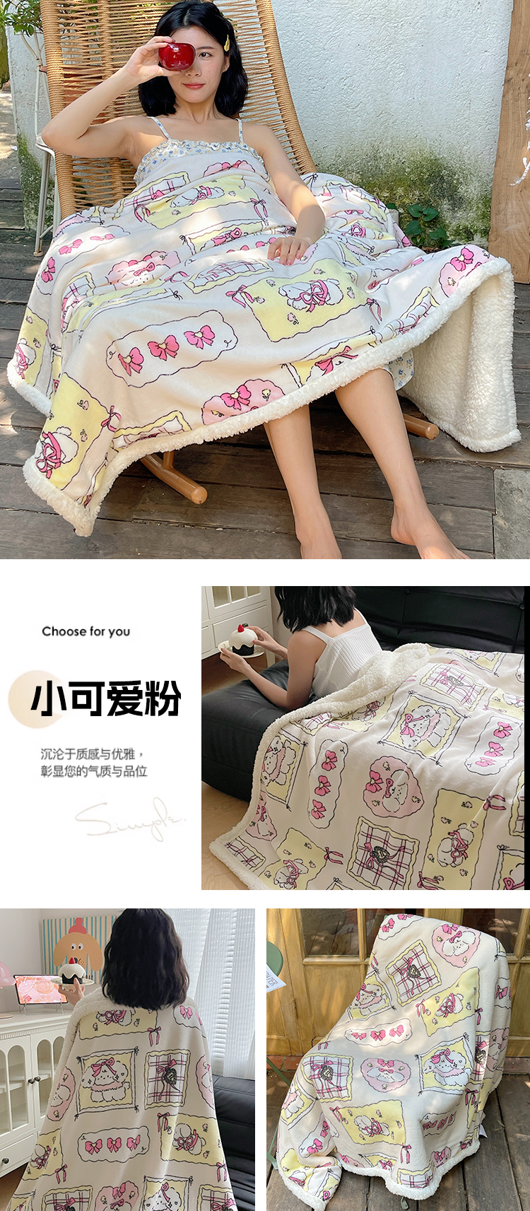 (总)萝莉家纺 2025新款小清新多功能牛奶绒羊羔绒毛毯毯子午睡毯,爱心格子粉,波点狗狗,黑蝴蝶,蝴蝶结兔,花晓绿,花晓玉,花园猫,欢乐熊,咖啡熊,卡通乐园,猫狗一家,萌宠小屋,萌仔派对,茉本玉,奇妙世界,软萌猫黄,软萌猫蓝,圣诞树,甜品屋,兔兔,五彩缤纷,小恐龙,元气满满,做个好梦,组合图仅供展示不可下单