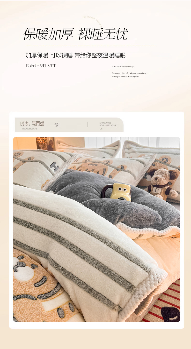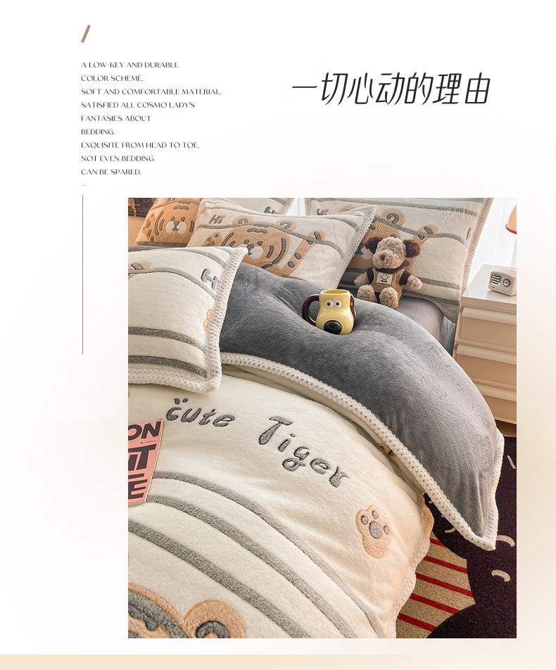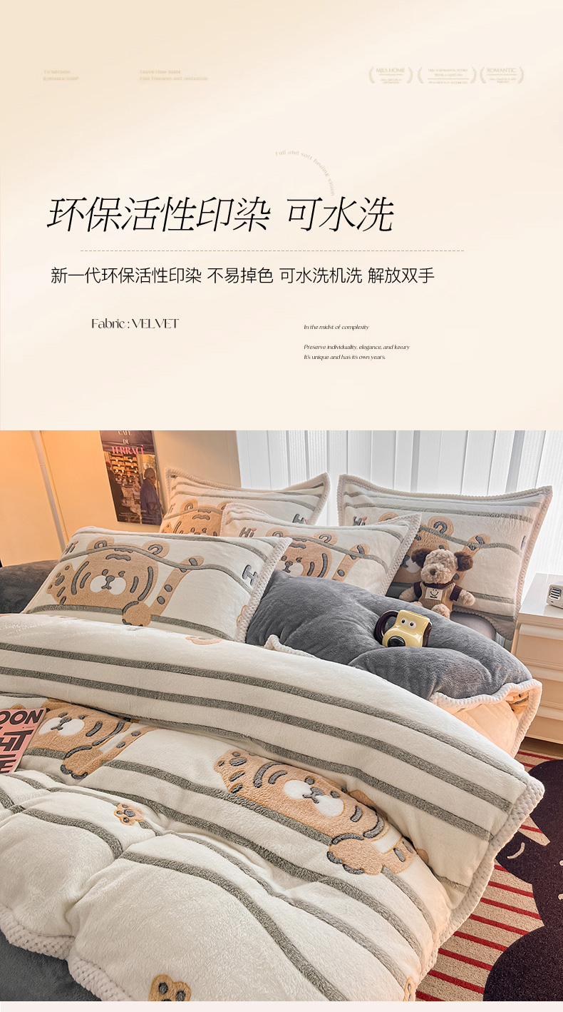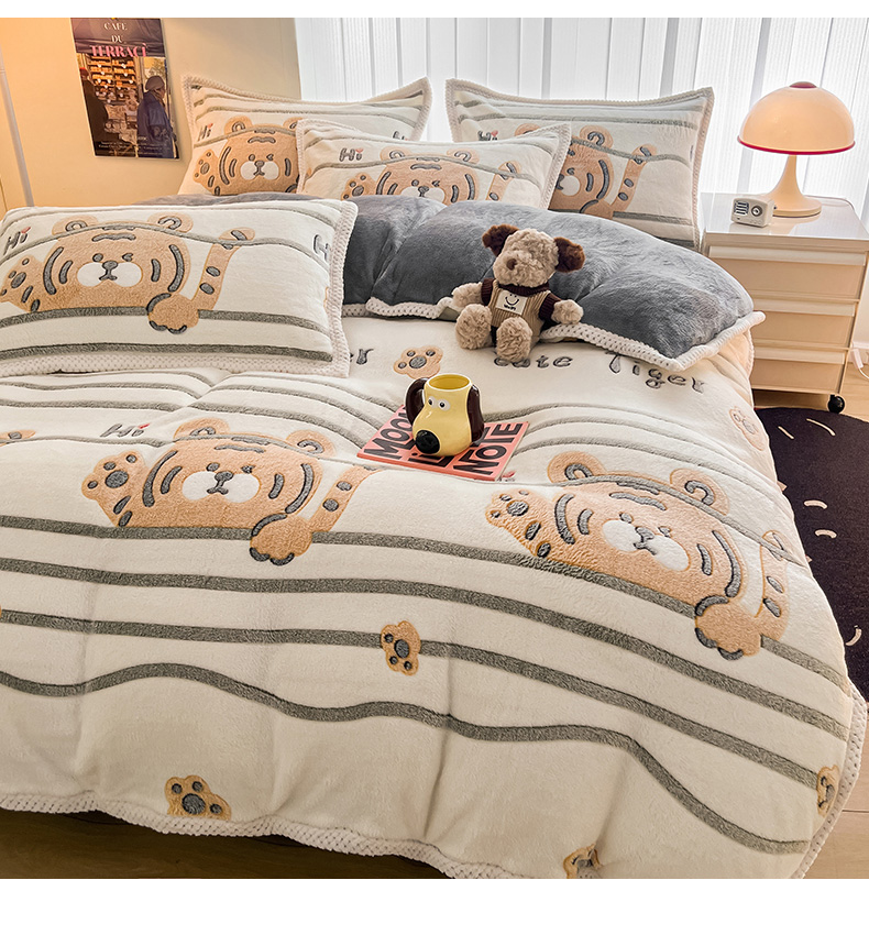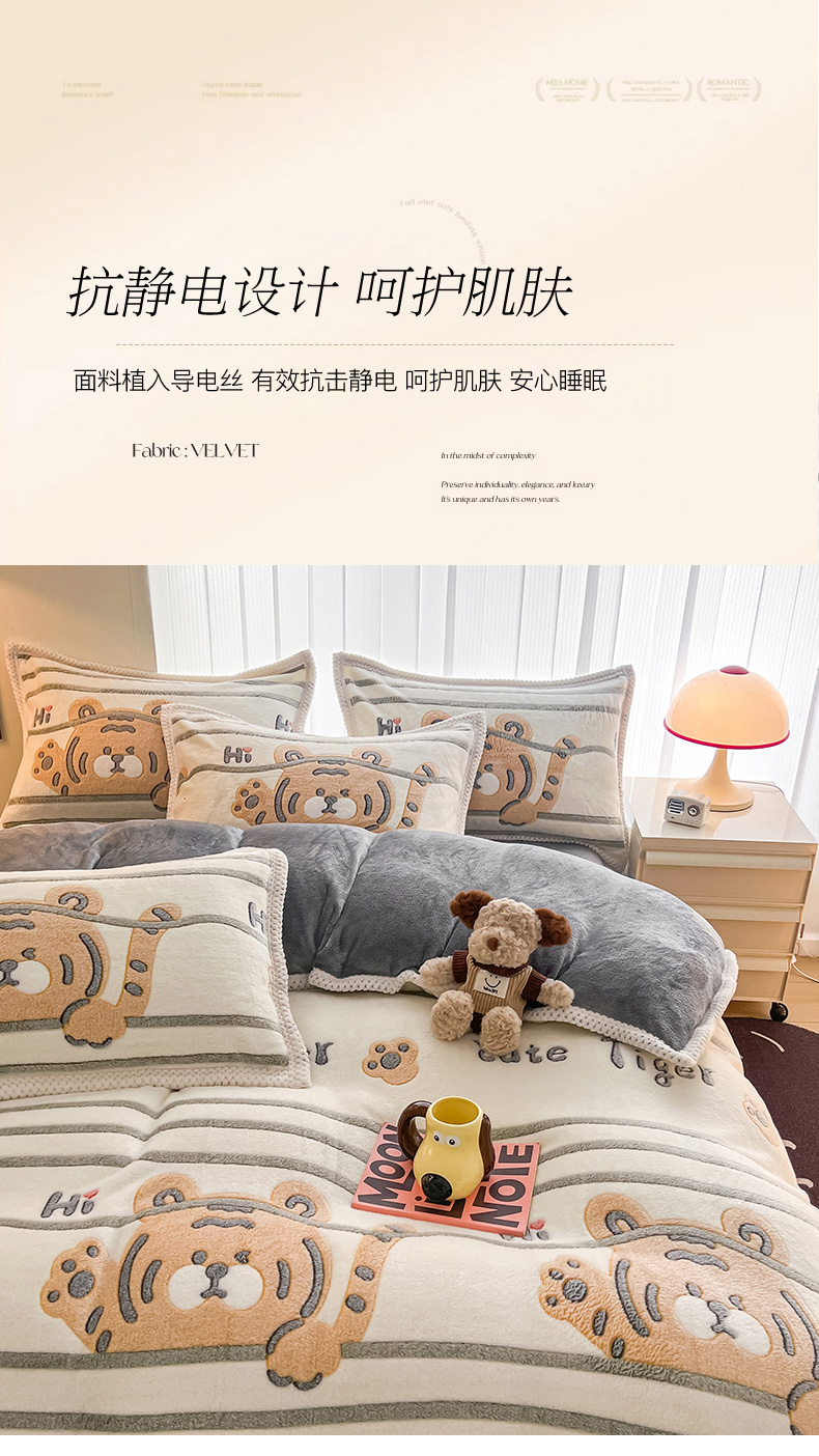 当前位置: 91家纺网 > 商品网购 > 床品套件 > 四件套 > 其它四件套 > 倾慕家纺 2024新款加厚保暖6D立体雪花绒系列-四件套 欢乐小虎
