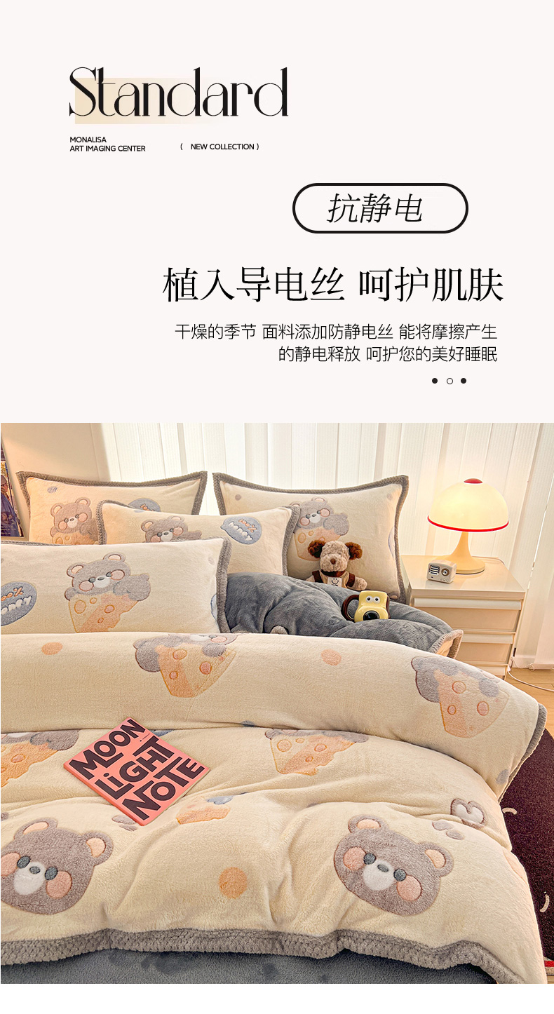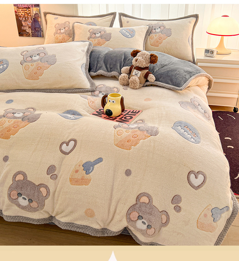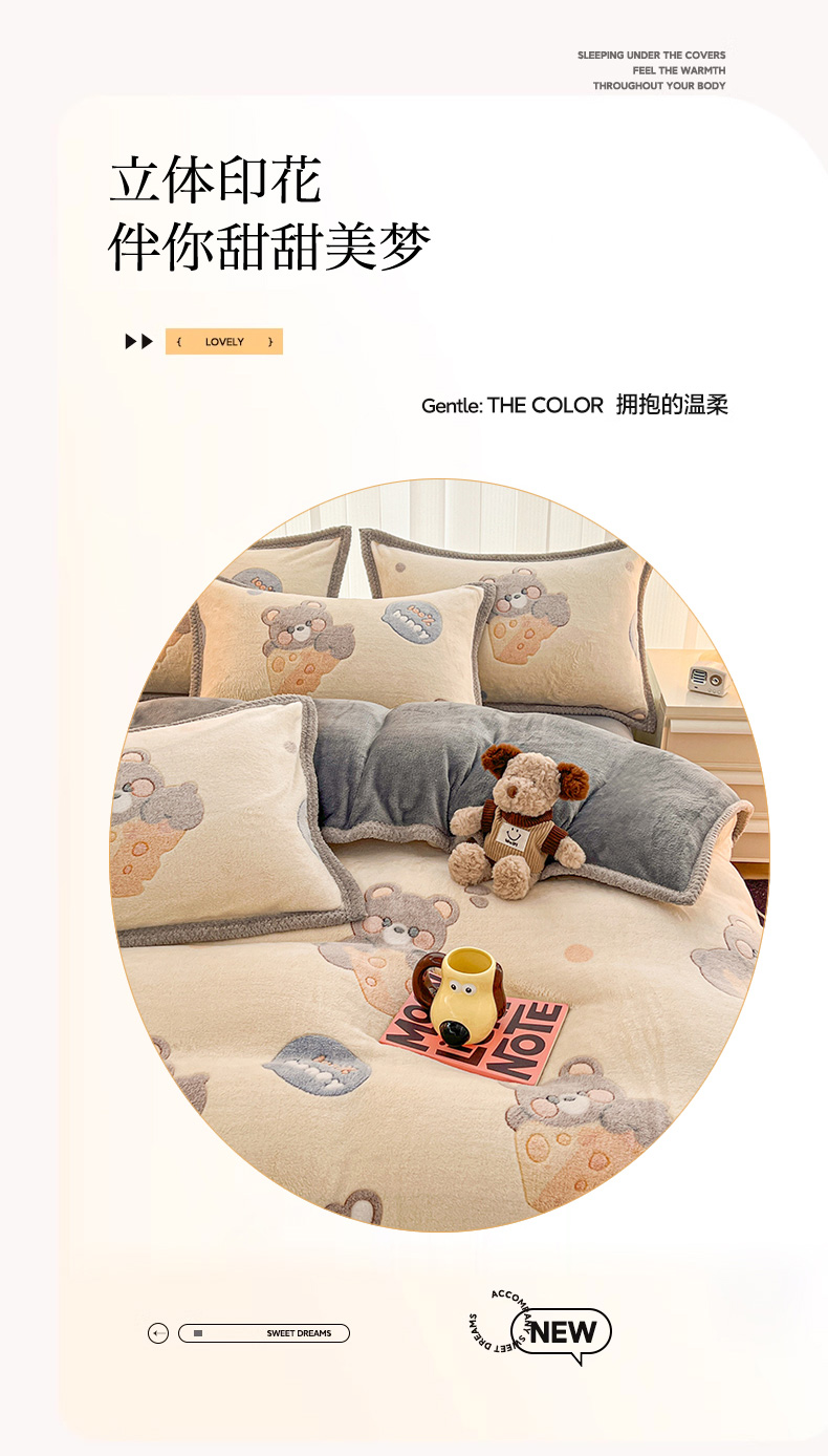 (总)倾慕家纺 2025新款卡通毛巾绣加厚保暖牛奶绒四件套,爱心女孩,咖啡小狗,猫咪熊兔,迷你小车,圣诞树熊,音乐企鹅