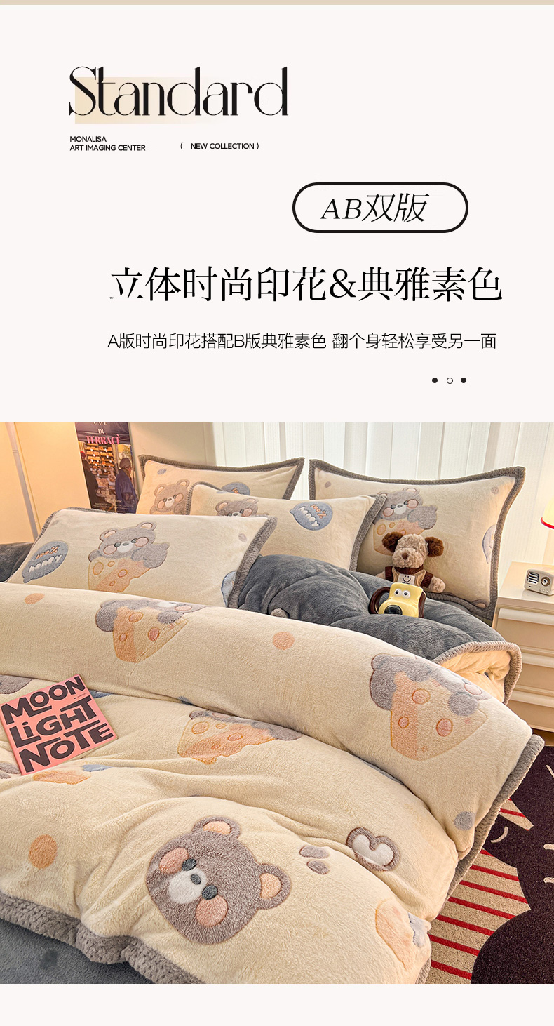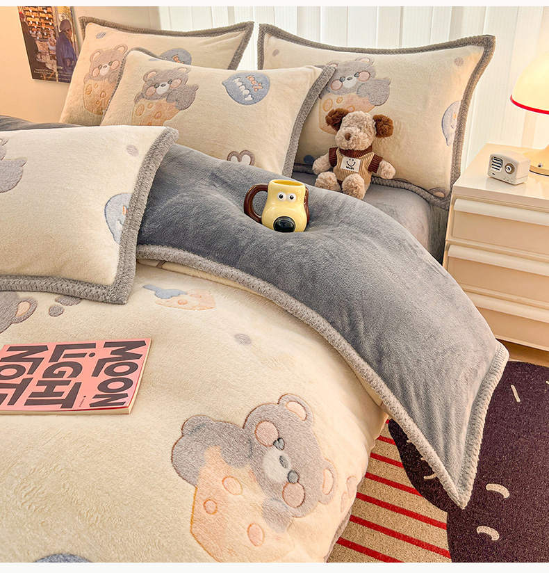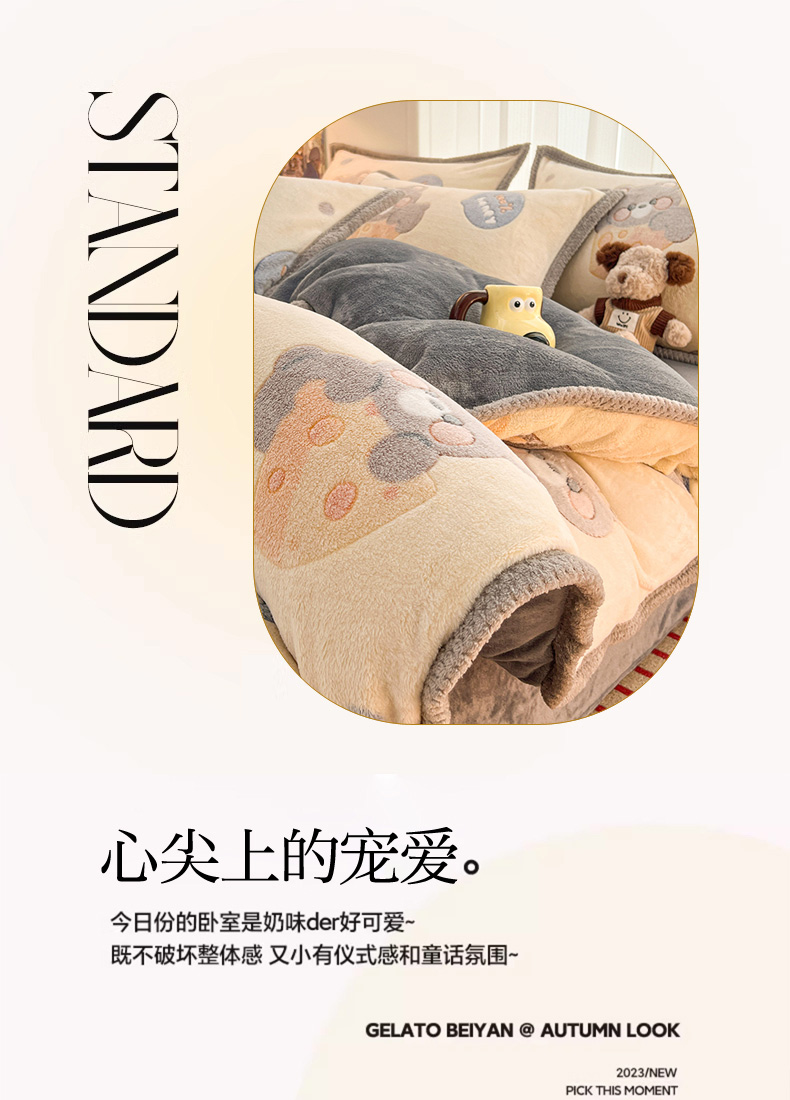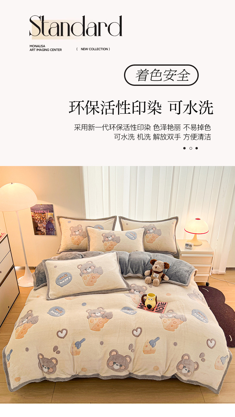 (总)倾慕家纺 2025新款卡通毛巾绣加厚保暖牛奶绒四件套,爱心女孩,咖啡小狗,猫咪熊兔,迷你小车,圣诞树熊,音乐企鹅