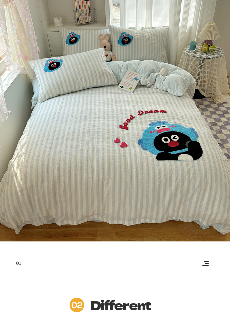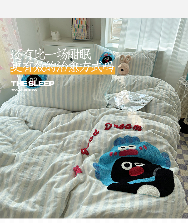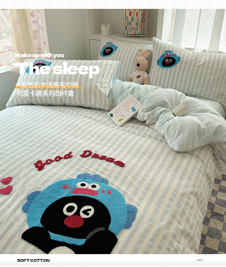桃子家居 2024新款A类ins纯棉色织水洗棉毛巾绣可爱卡通系列四件套 棉毛巾绣-蓝鱼企鹅