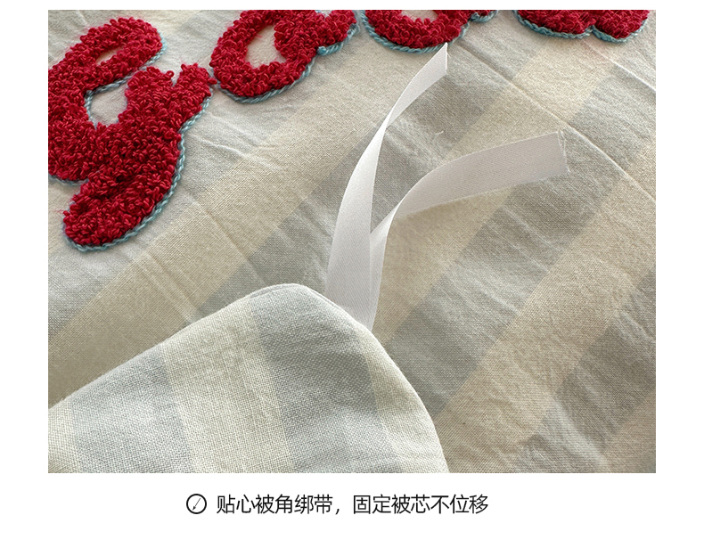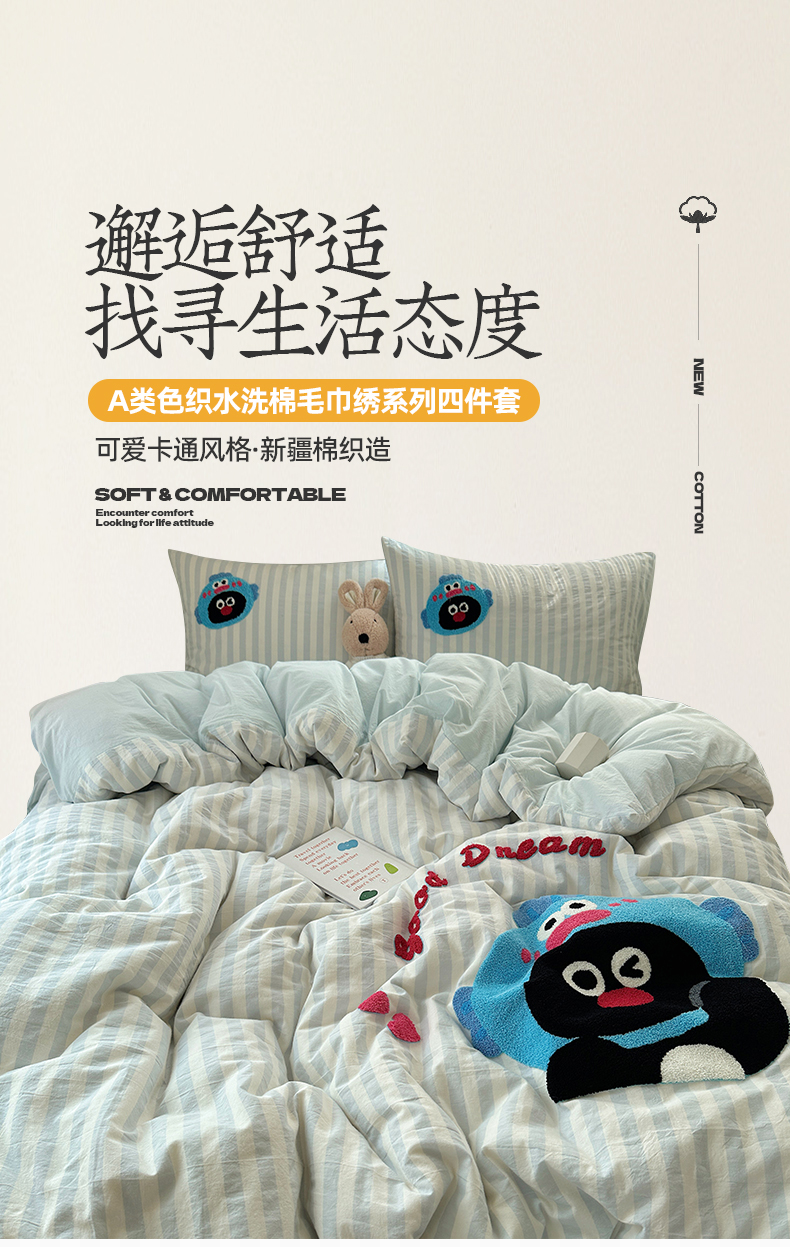 商品名称:桃子家居 2024新款A类ins纯棉色织水洗棉毛巾绣可爱卡通系列四件套 棉毛巾绣-蓝鱼企鹅