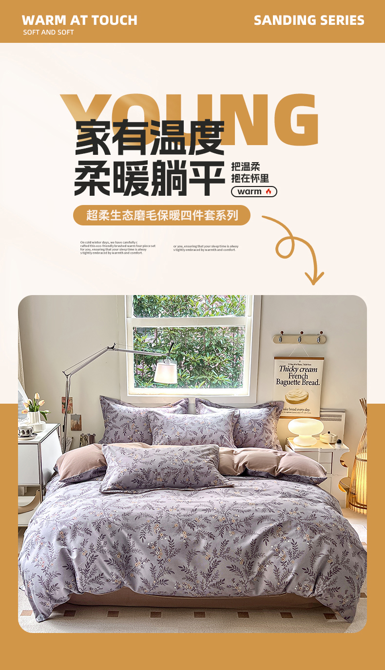 (总)品乐家纺 2025新款32支超柔生态磨毛四件套,川屿-咖,春意,朵唯-桔,朵唯-绿,花棠-粉,景秋-红,兰序-桔,兰茵-蓝,拾光-灰,桃汐-粉,桃汐-桔,小萌兔-绿,忆甜-米紫,郁郁幽兰-紫,鸢香-红,芷柔-粉