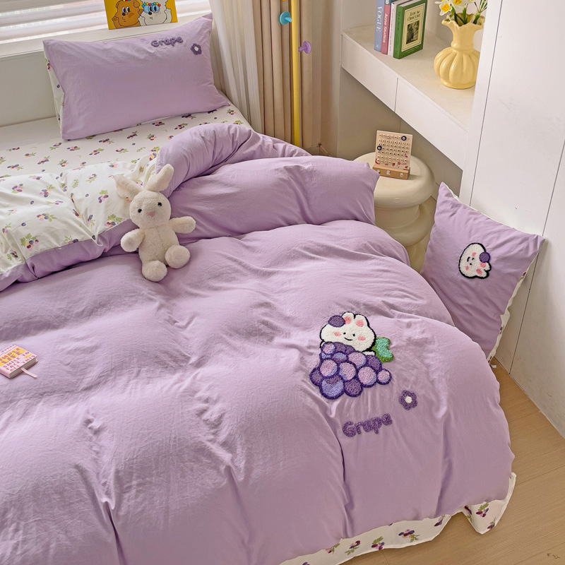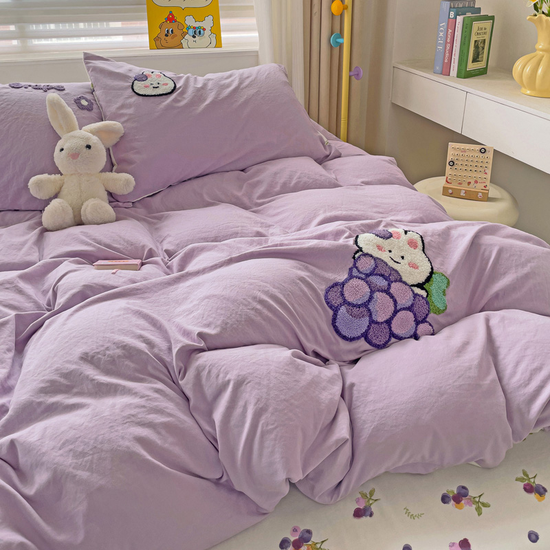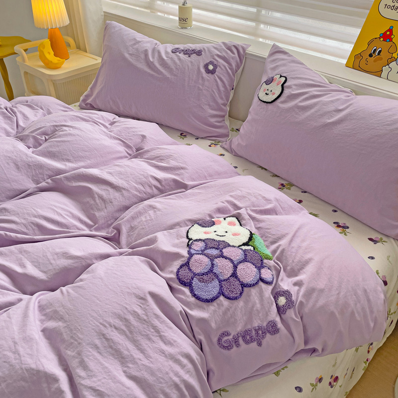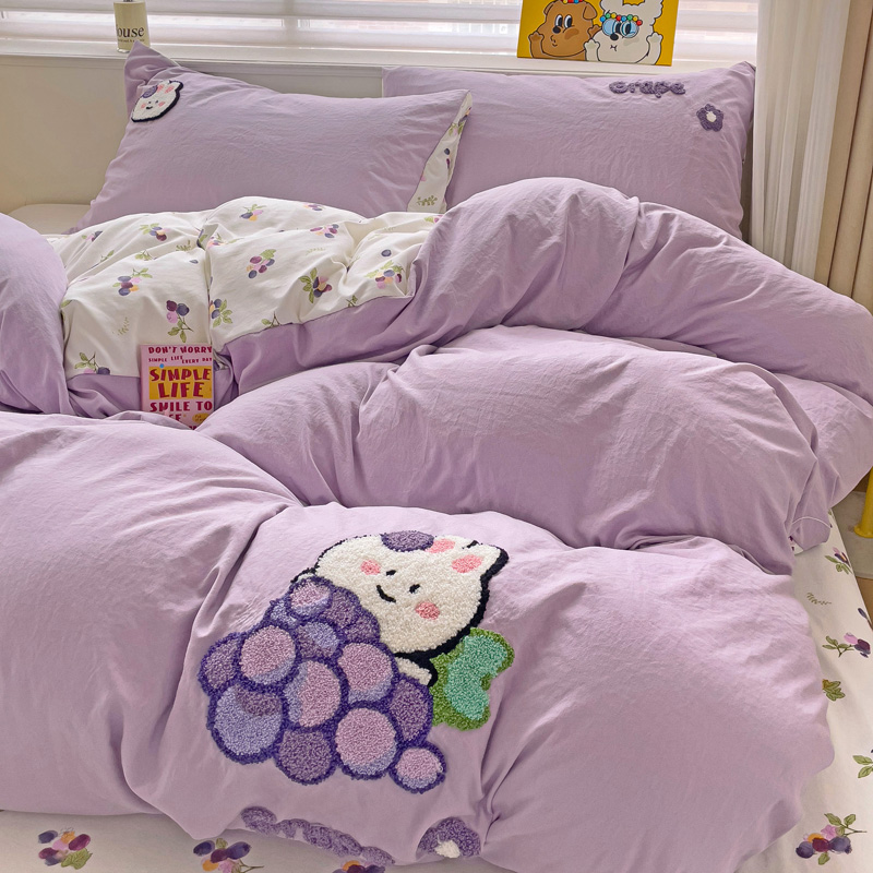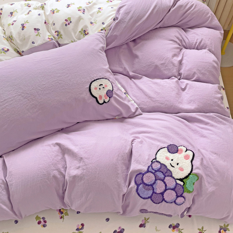 商品名称:一霖家纺 2024新款高克重云朵棉毛巾绣印+绣小清新系列四件套 葡萄兔