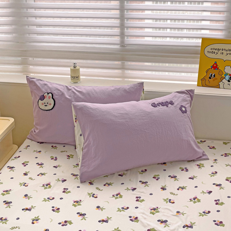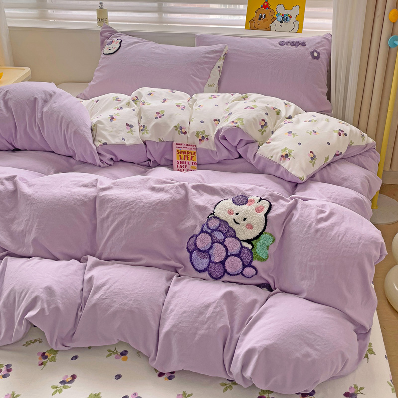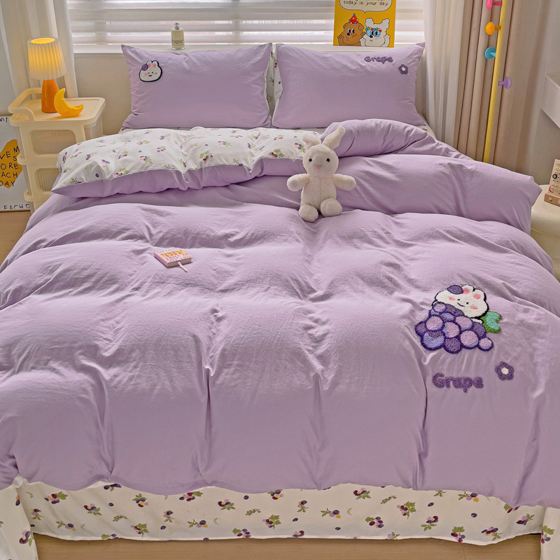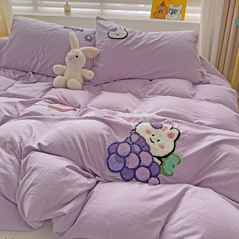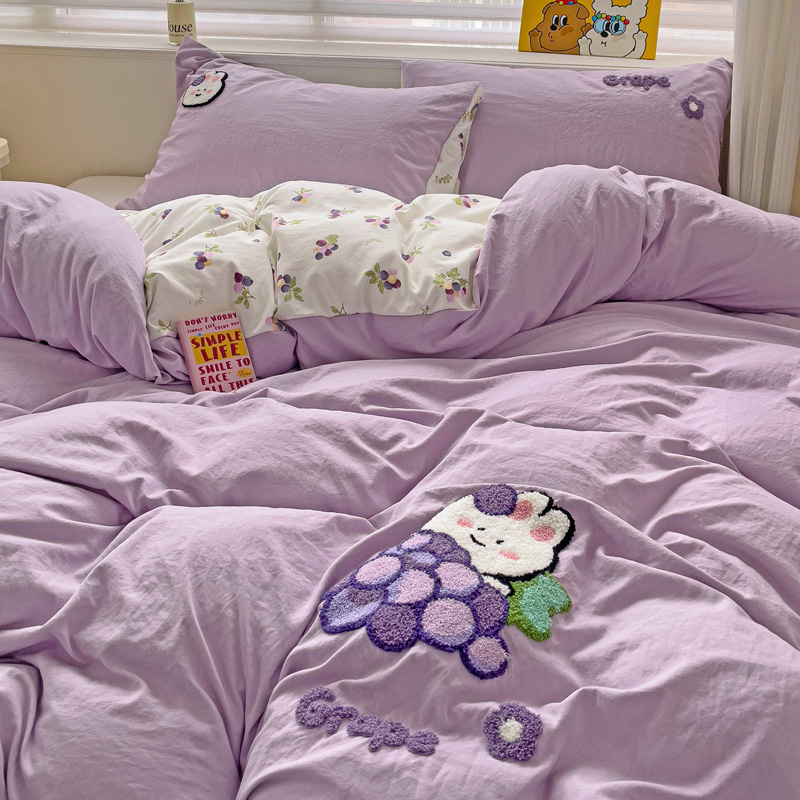 商品名称:一霖家纺 2024新款高克重云朵棉毛巾绣印+绣小清新系列四件套 葡萄兔