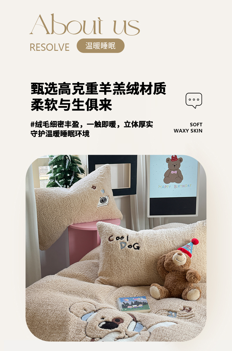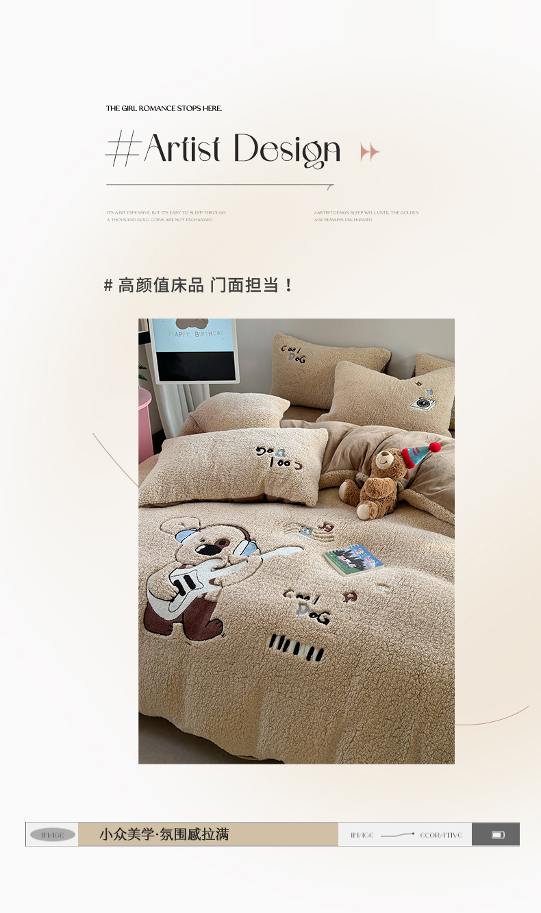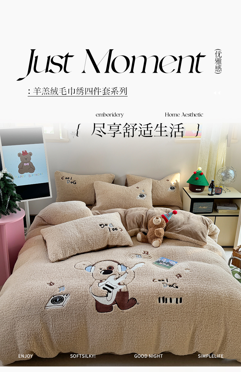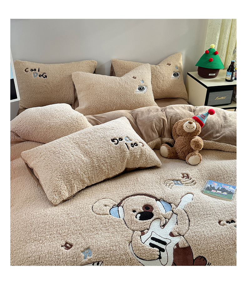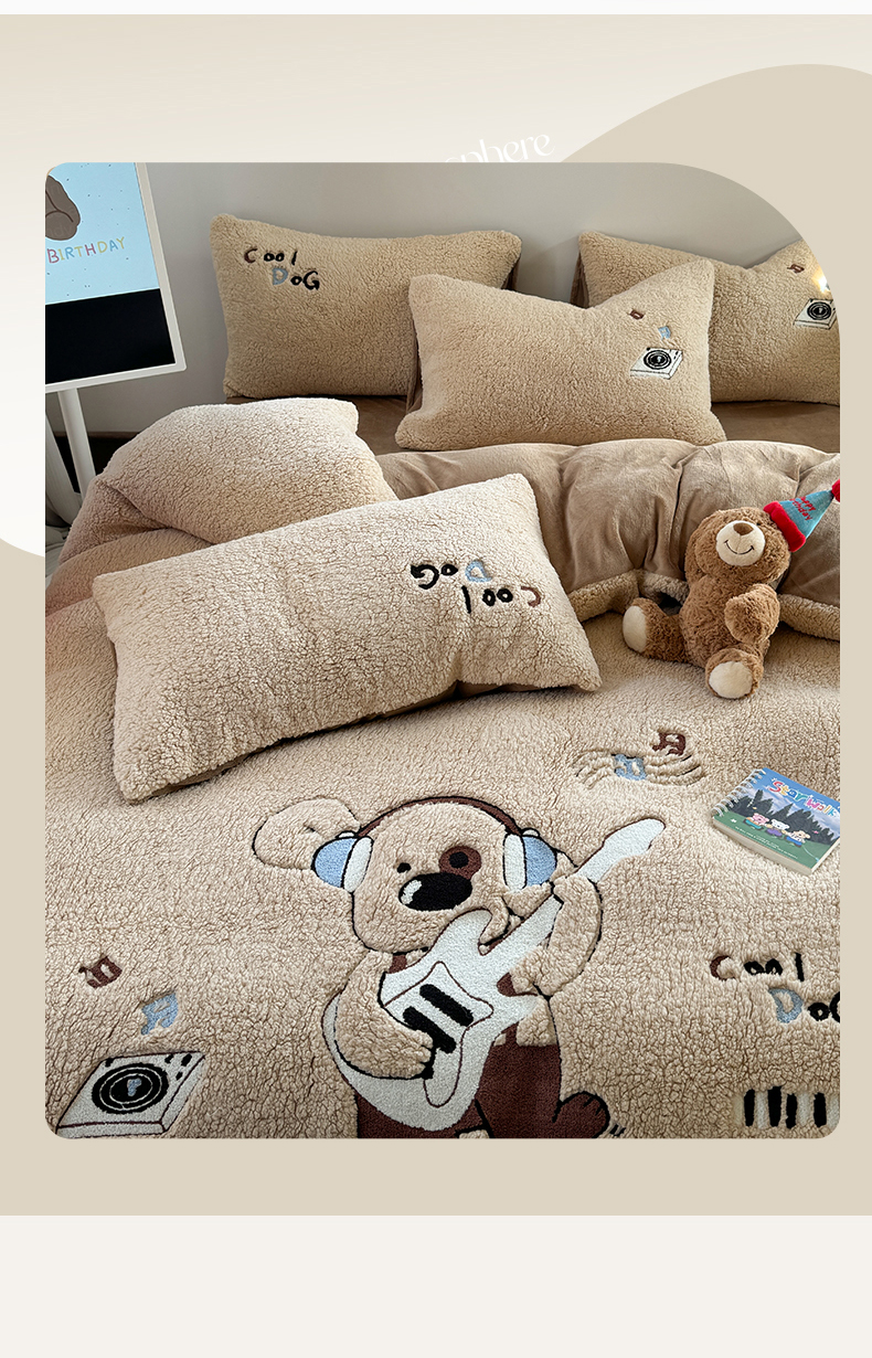 眠屿家纺 2025新款羊羔绒毛巾绣四件套 吉他狗
