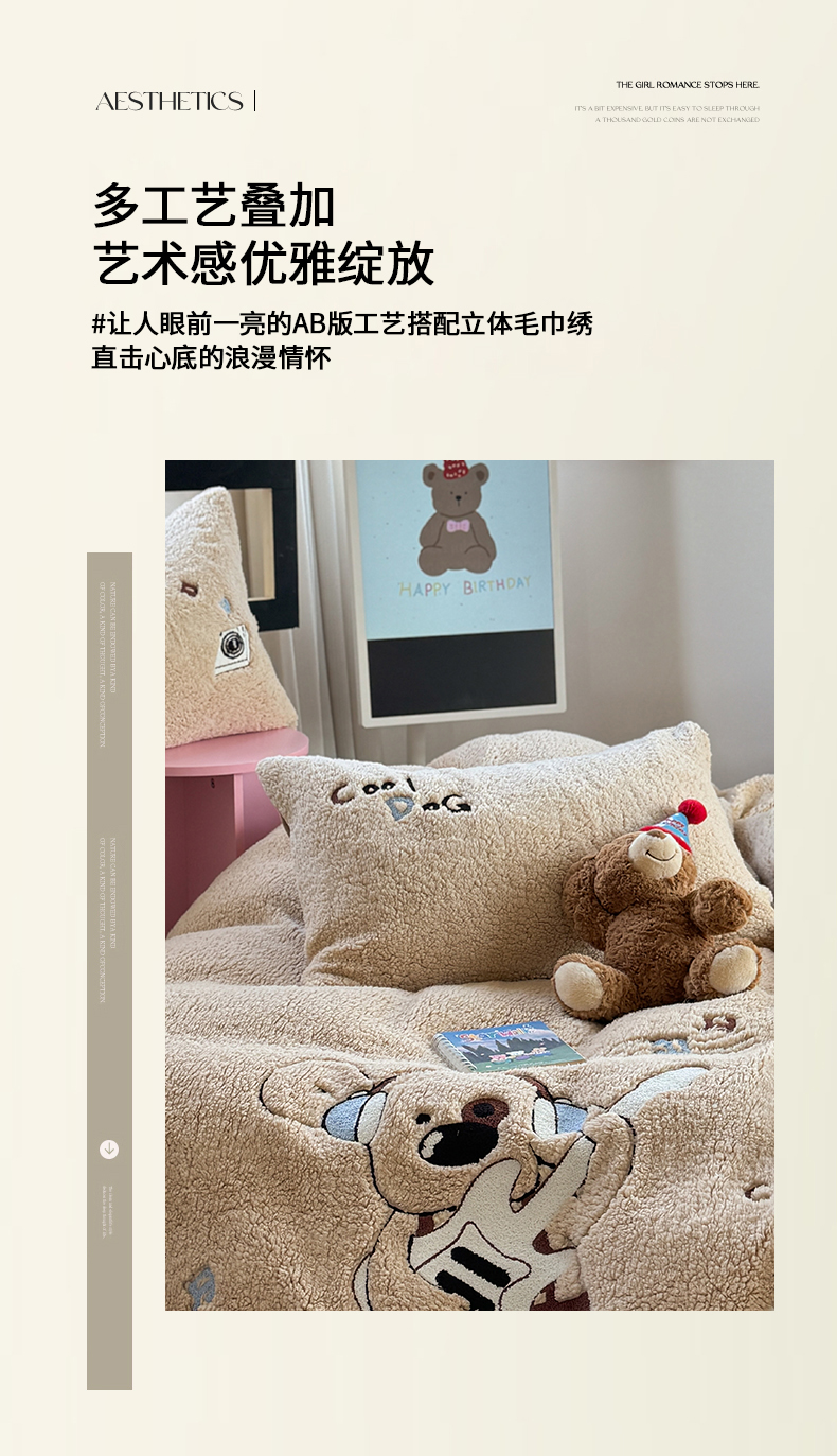 (总)眠屿家纺 2025新款加厚牛奶绒毛巾绣四件套,乐趣,面包狗,玩偶,玩泡泡
