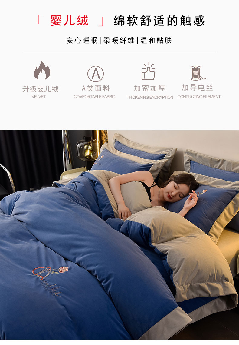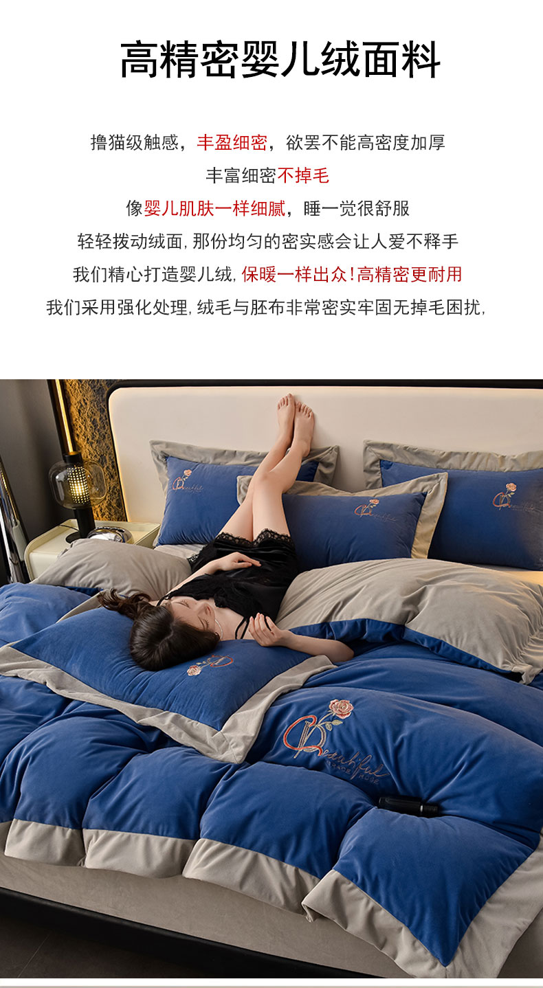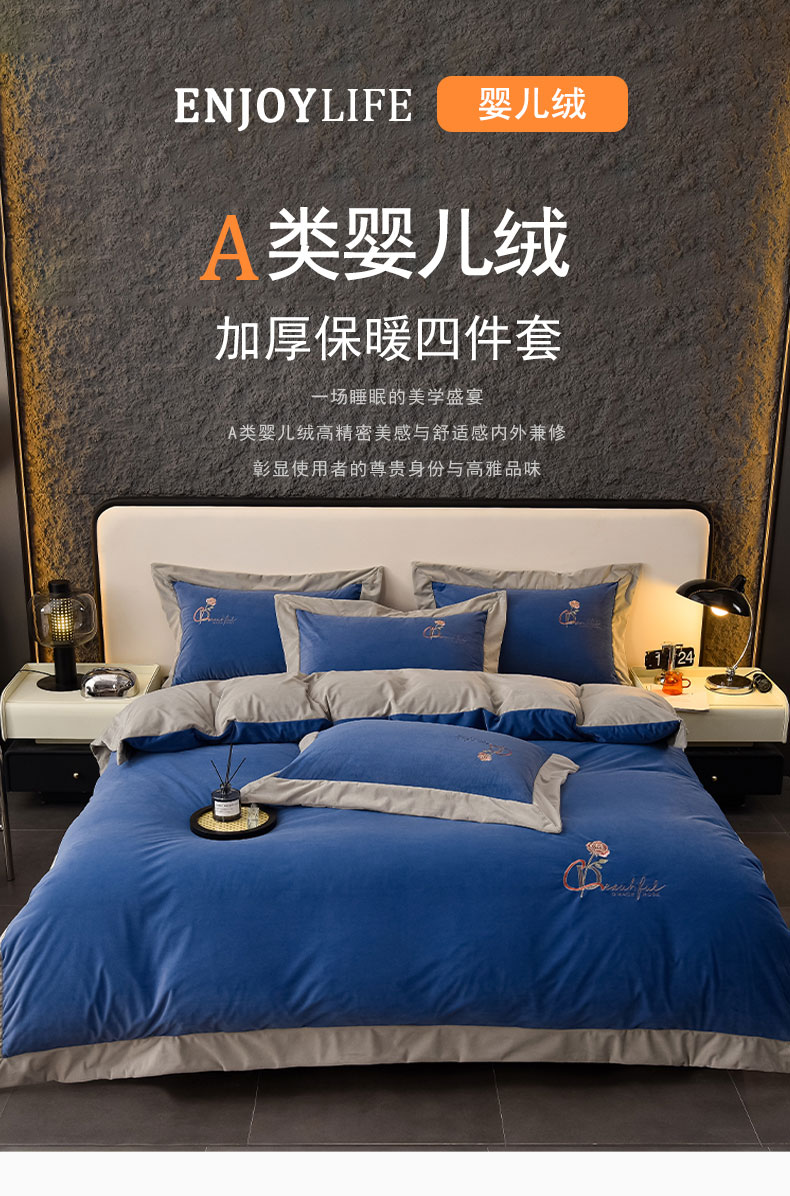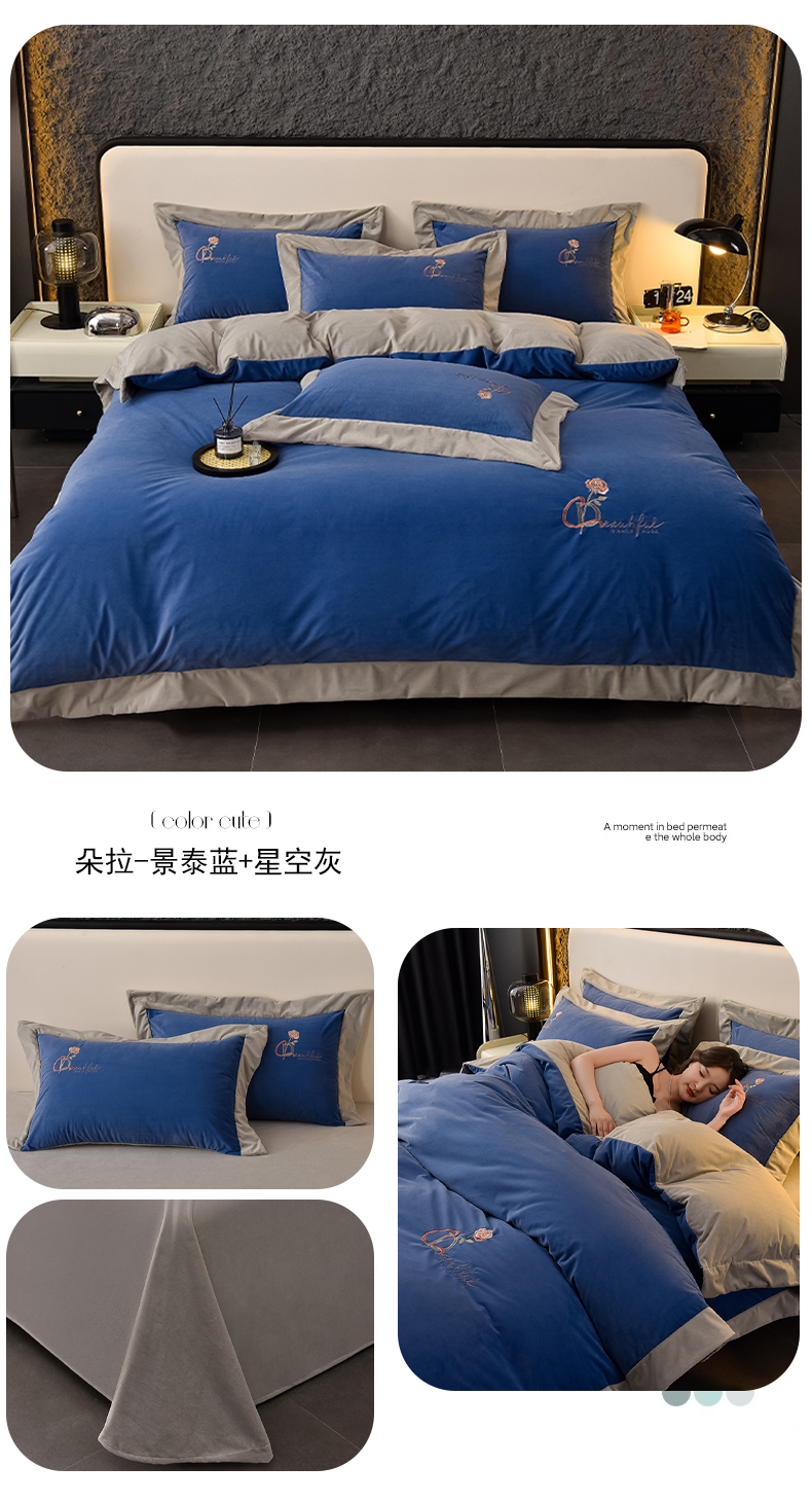 当前位置: 91家纺网 > 商品网购 > 床品套件 > 四件套 > 其它四件套 > 2024新款加厚保暖A类婴儿绒四件套-朵拉系列 朵拉-景泰蓝+星空灰