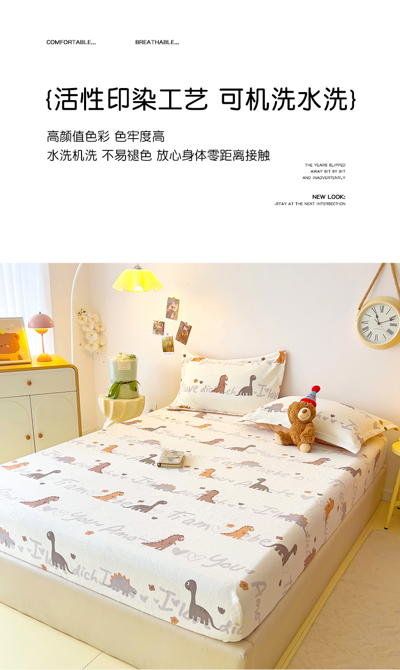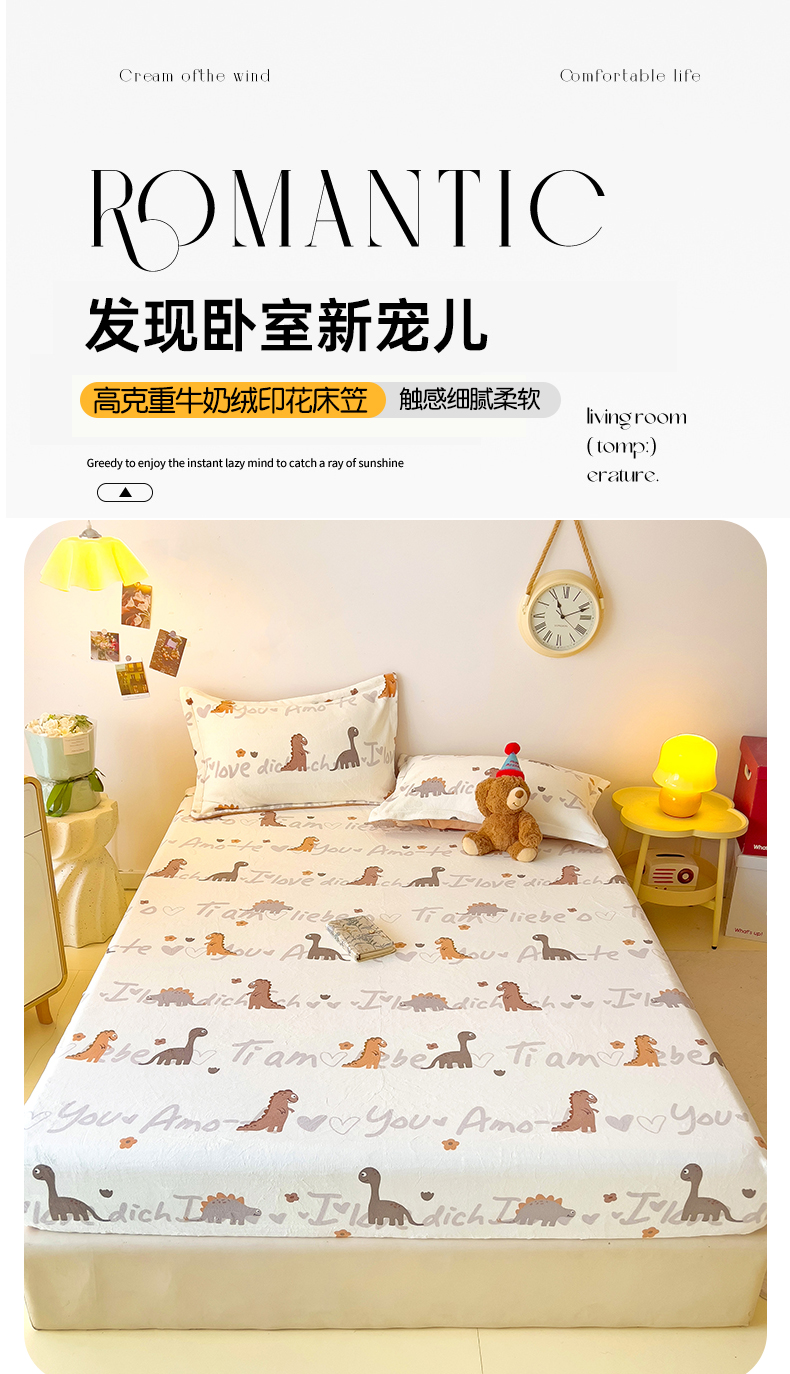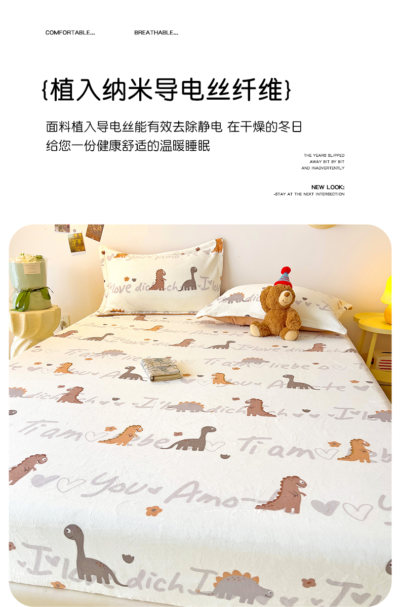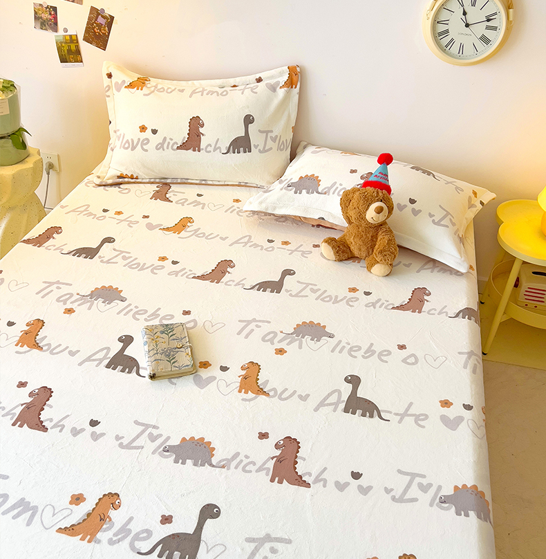 商品名称:大柏树 2025新款A类高克重亲肤舒适牛奶绒印花四件套-单床笠可定制 小恐龙