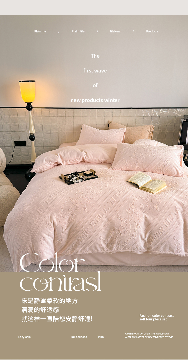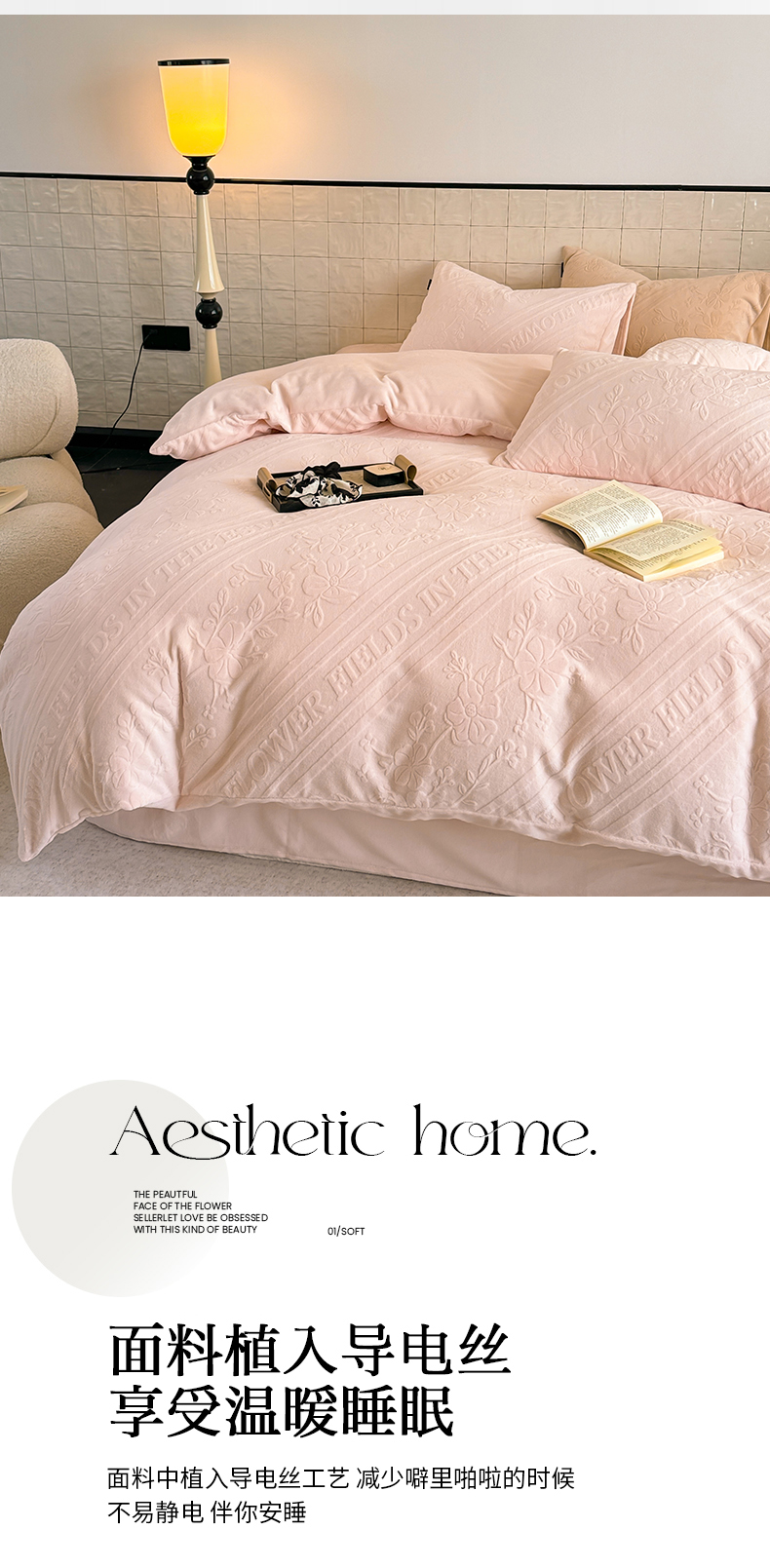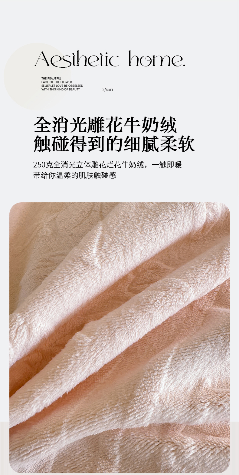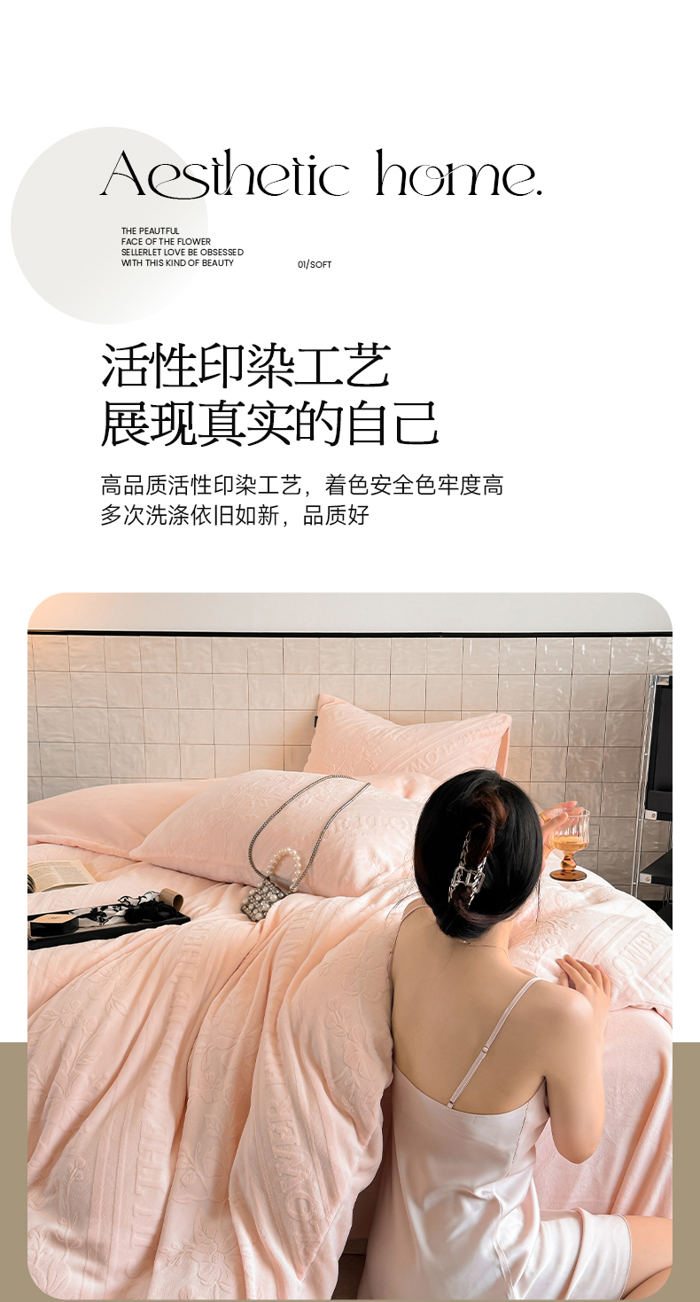 商品名称:若未家居 LOVEWE HOUSE 2025新款AB版250克全消光立体雕花烂花牛奶绒四件套-蝶舞 英文花开-浅粉