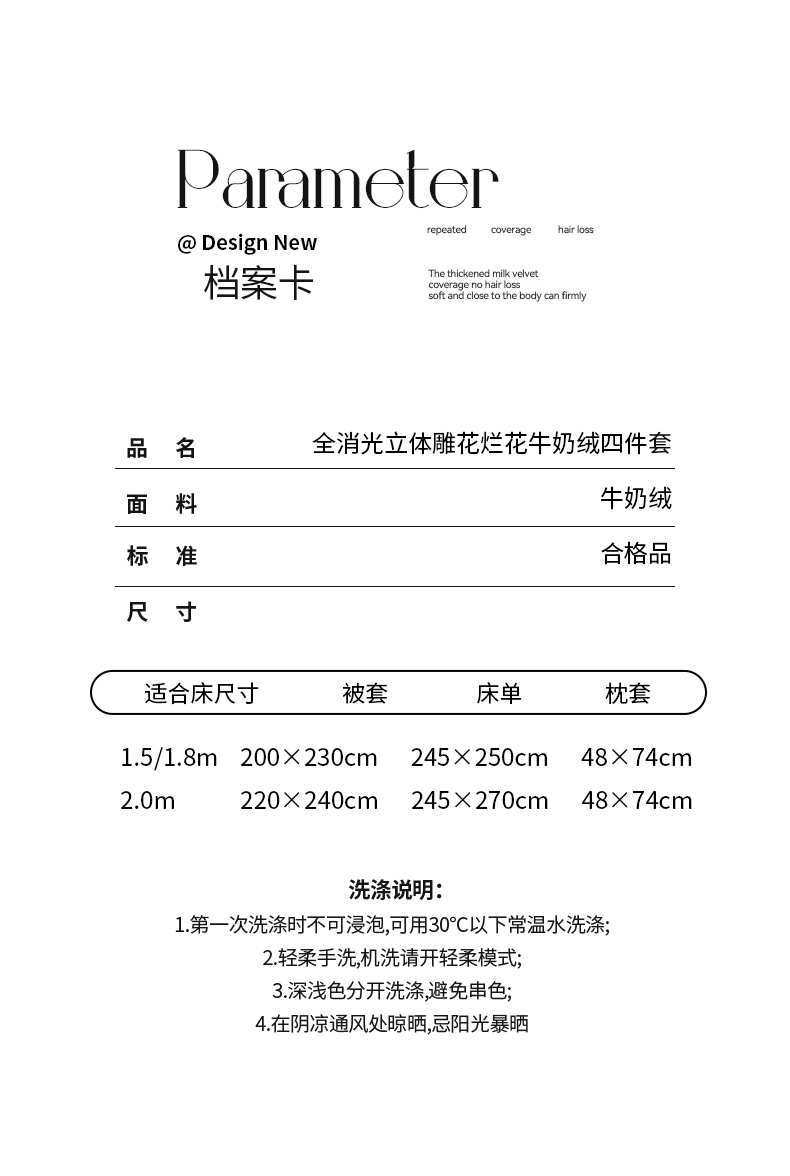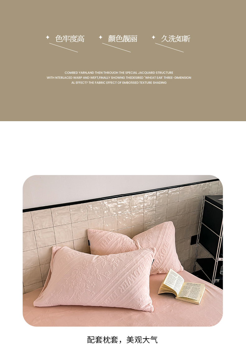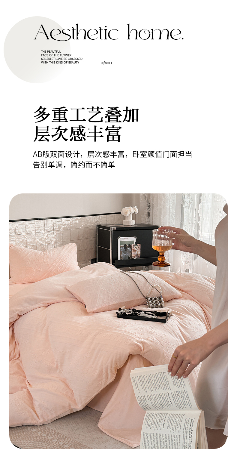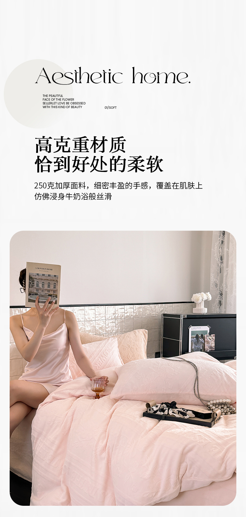 商品名称:若未家居 LOVEWE HOUSE 2025新款AB版250克全消光立体雕花烂花牛奶绒四件套-蝶舞 英文花开-浅粉