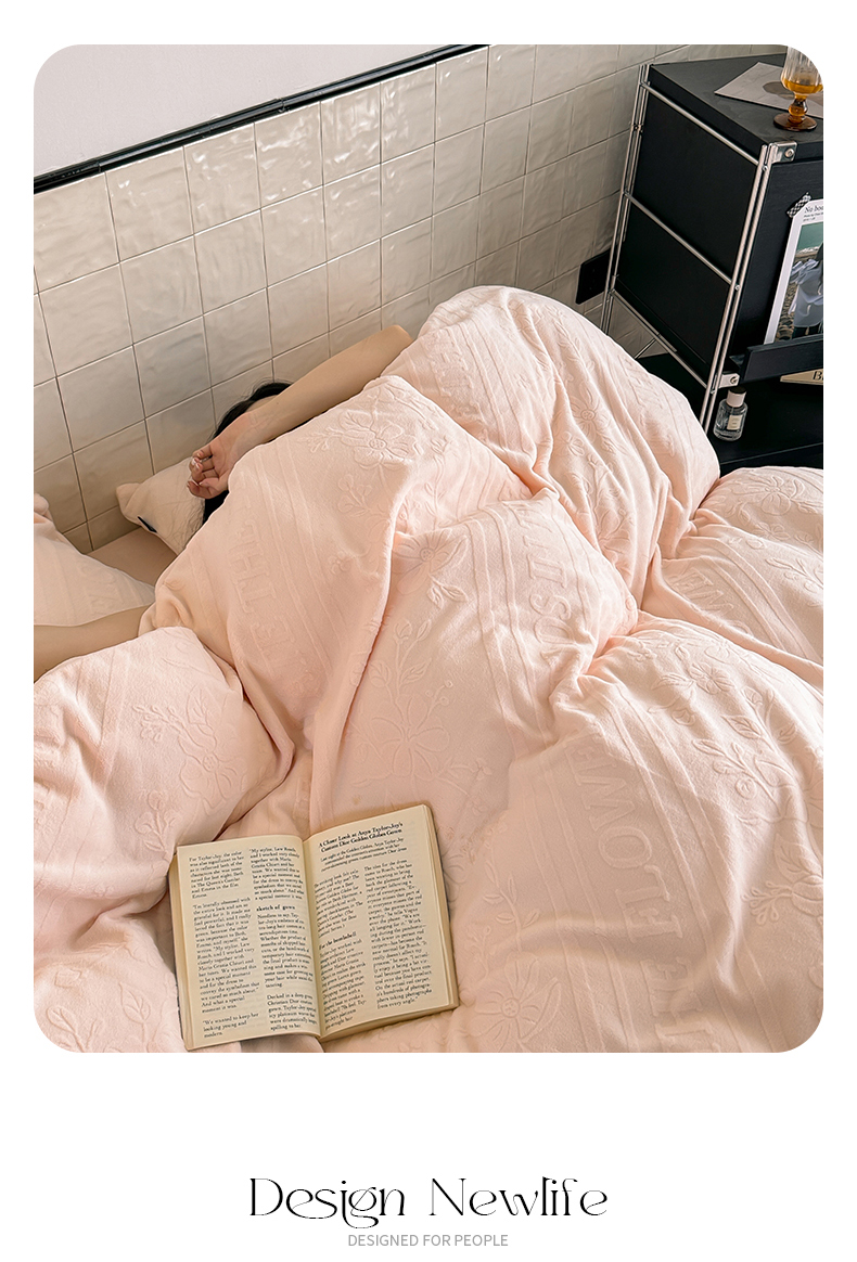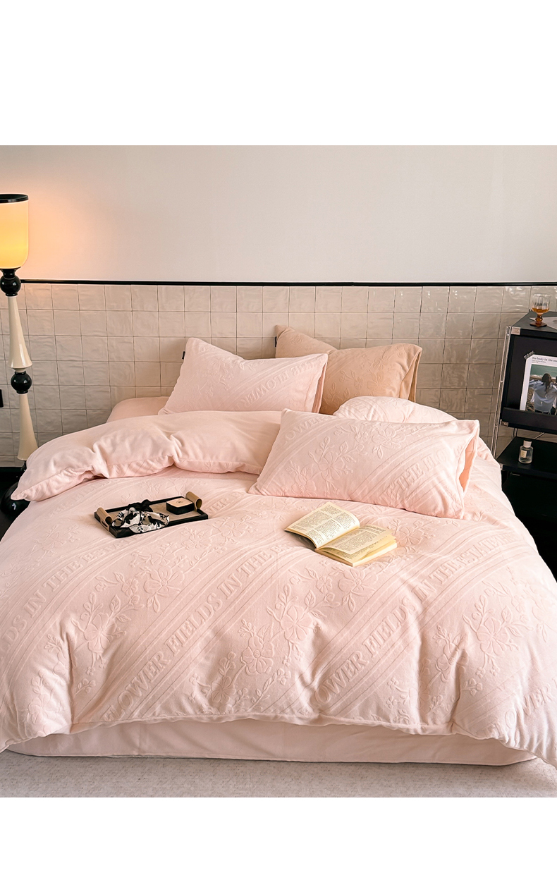 若未家居 LOVEWE HOUSE 2025新款AB版250克全消光立体雕花烂花牛奶绒四件套-蝶舞 英文花开-浅粉