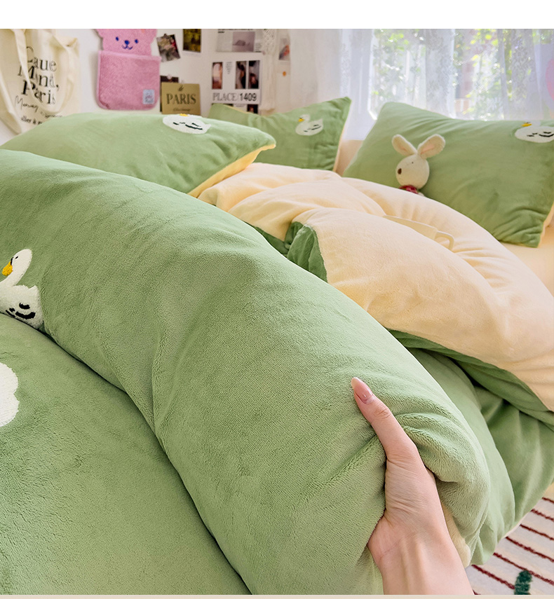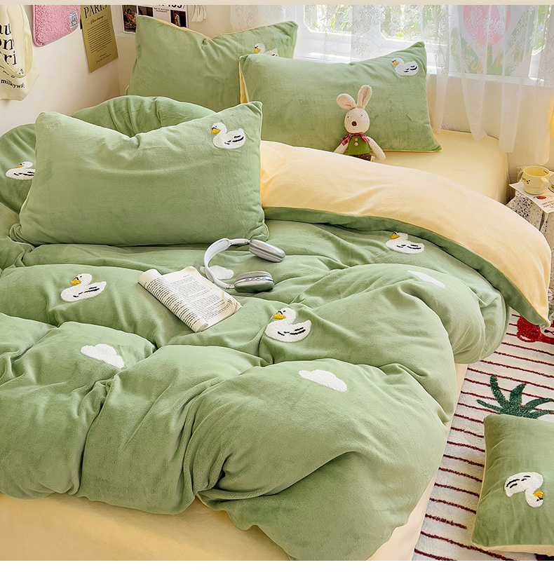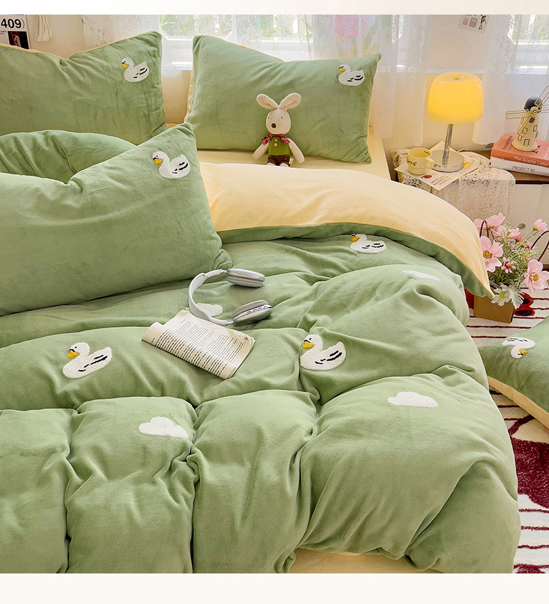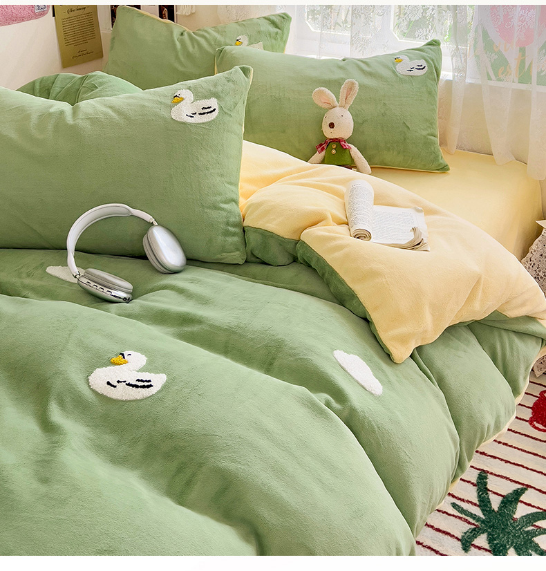 当前位置: 91家纺网 > 商品网购 > 床品套件 > 四件套 > 牛奶绒四件套 > 眠帛家居 2024高克重牛奶绒卡通毛巾绣系列 柯尔鸭