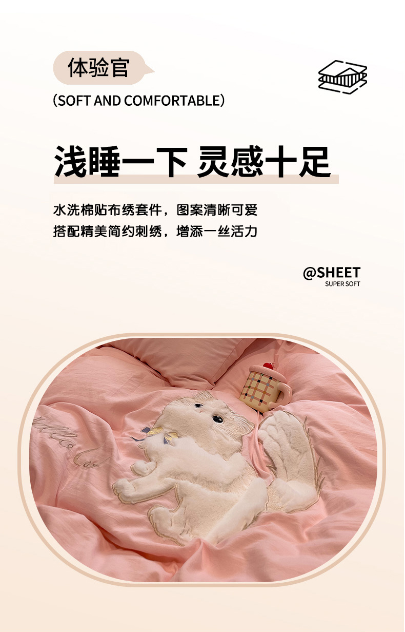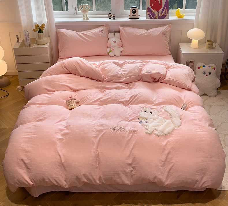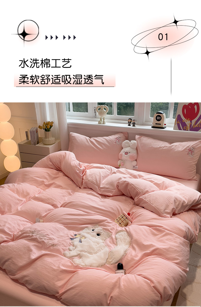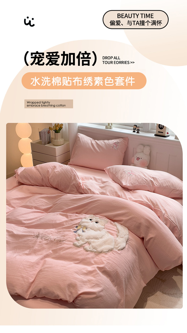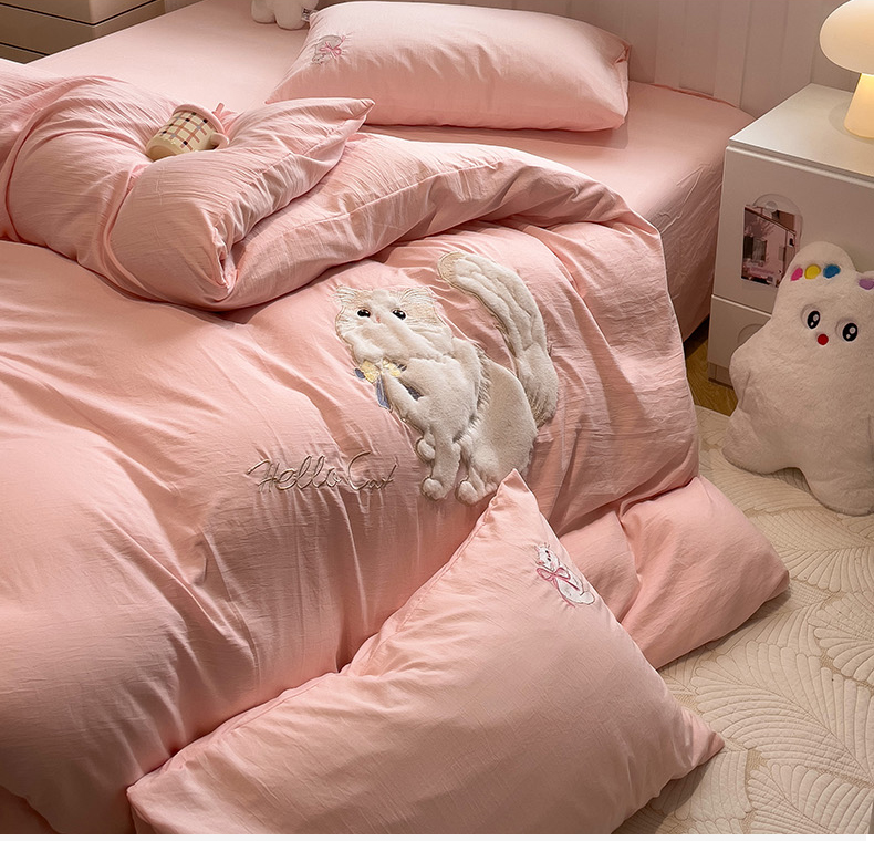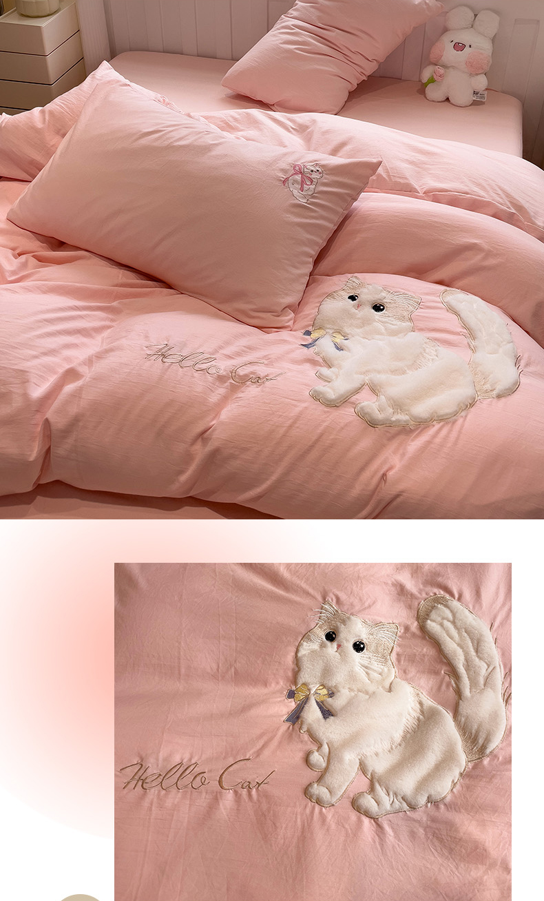 当前位置: 91家纺网 > 商品网购 > 床品套件 > 四件套 > 水洗棉四件套 > (总)优色良品家纺 2024新款水洗棉重工刺绣贴布绣四件套-奶猫款式二