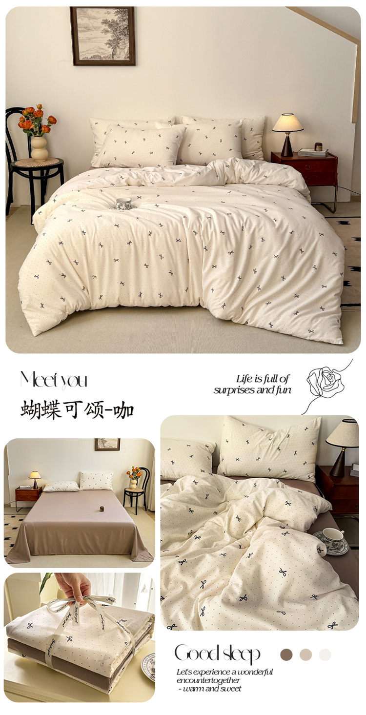 商品名称:漫仙阁家纺 2025年爆款新品有氧双层纱四件套-碎花 蝴蝶可颂-咖
