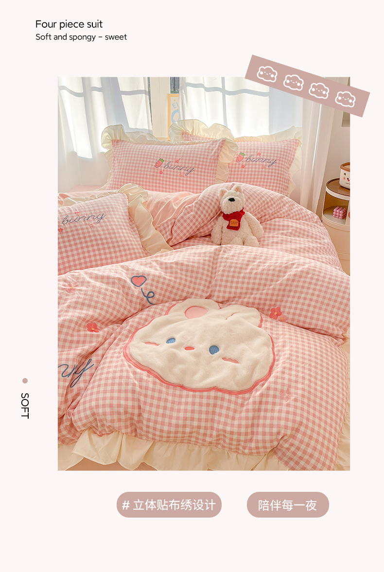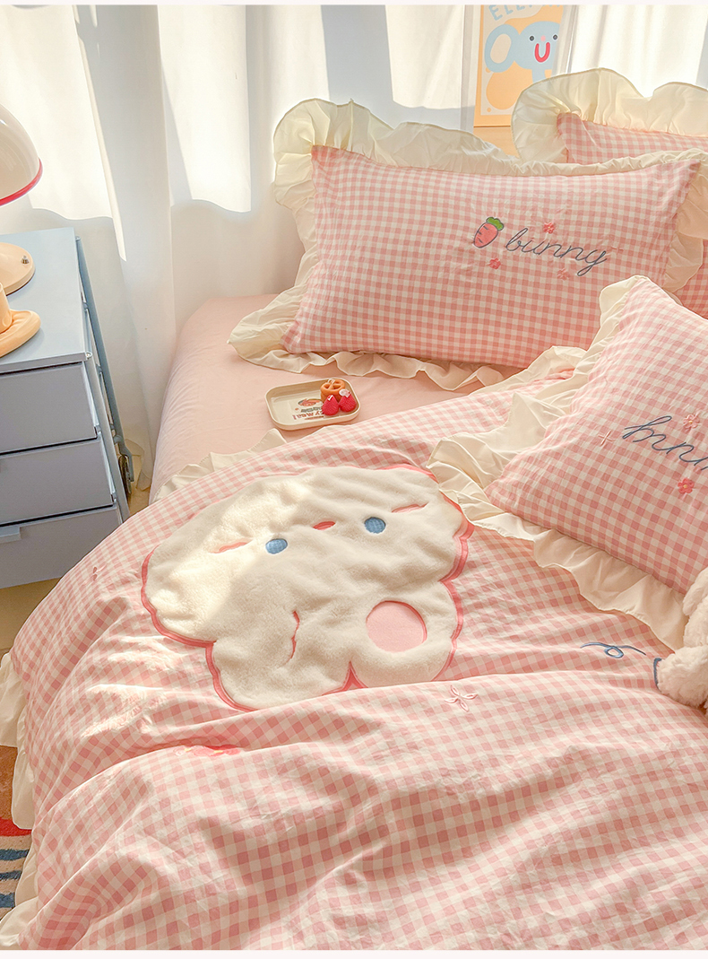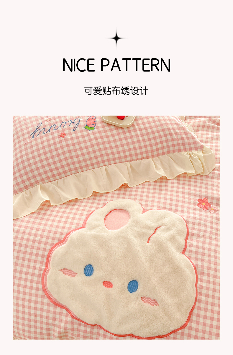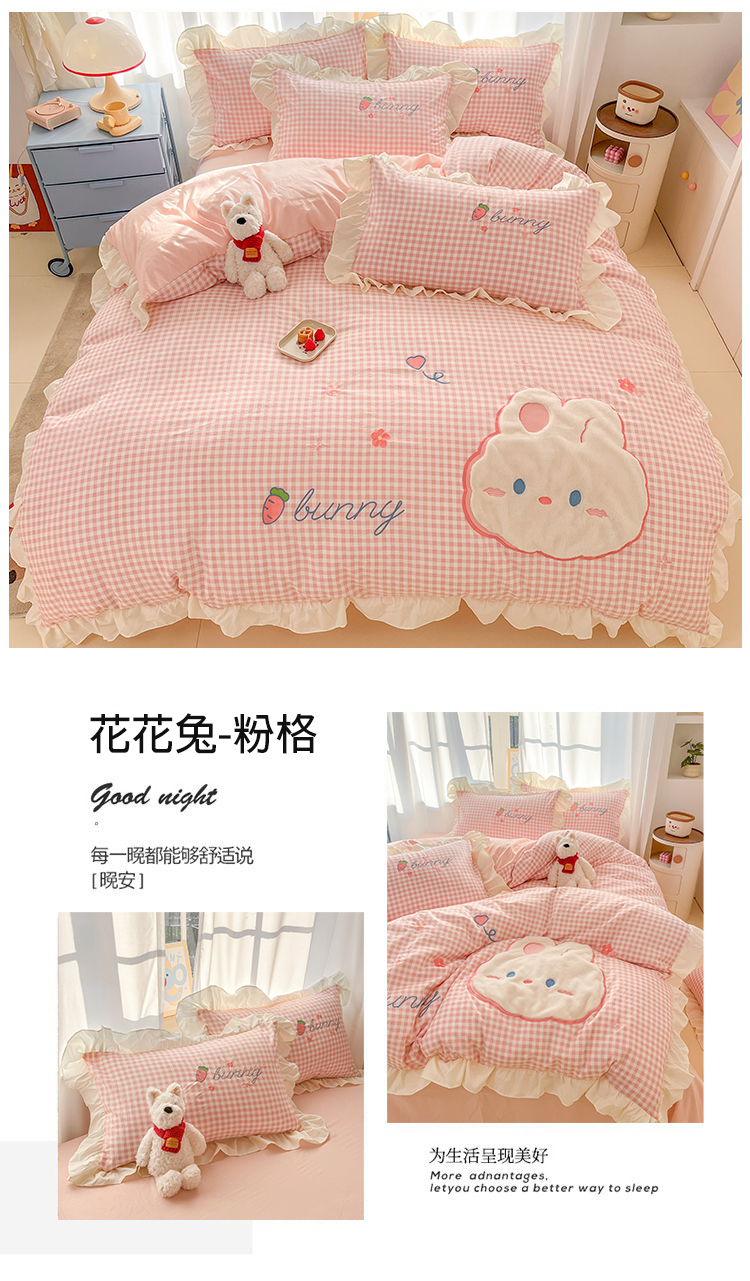 当前位置: 91家纺网 > 商品网购 > 床品套件 > 四件套 > 水洗棉四件套 > 我心家纺 2025新款水洗棉花边贴布绣四件套 花花兔-粉格